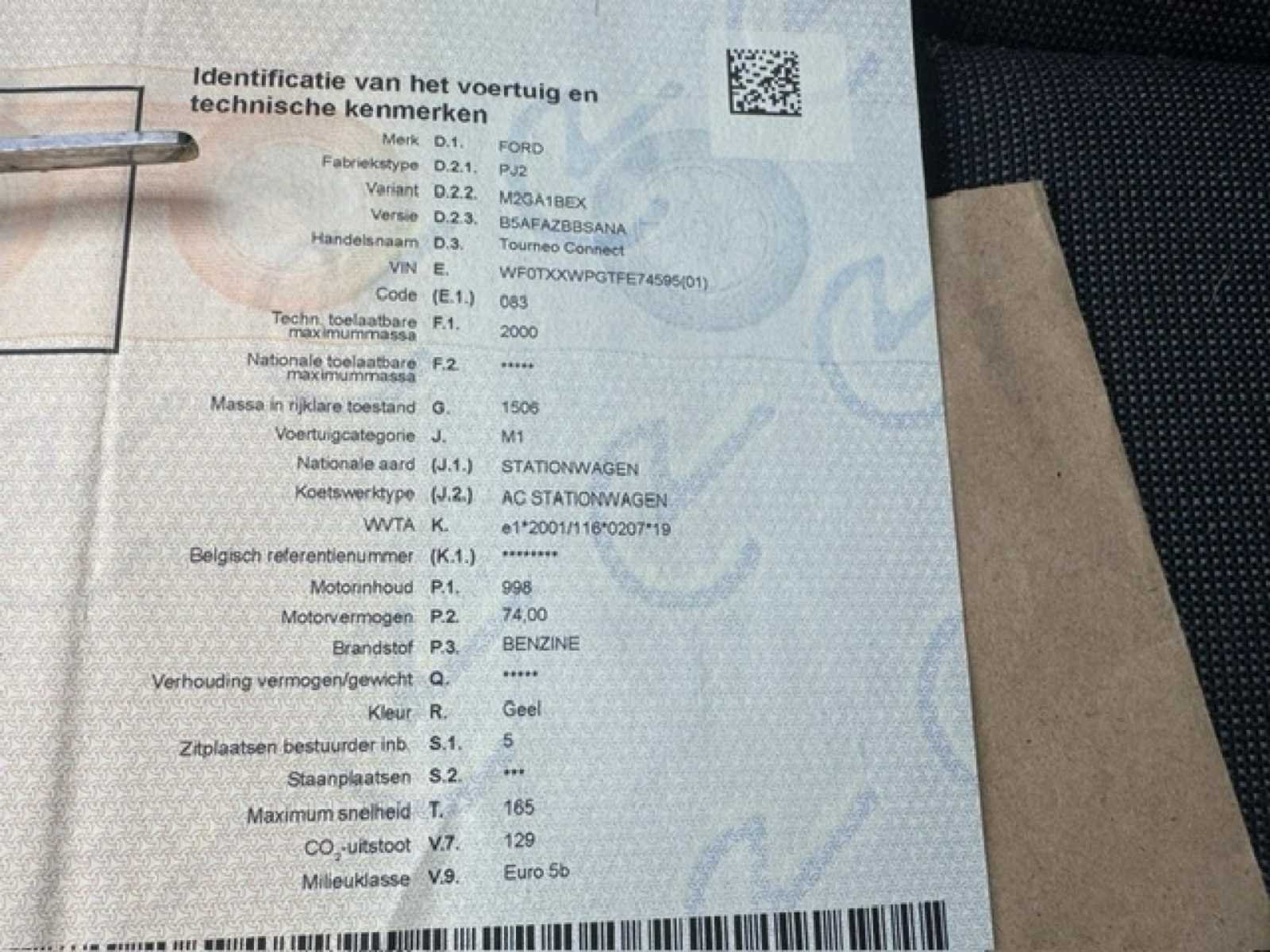 No Kenteken: 1KUC258 Merk: Ford Model: Tourneo Connect Type: PJ2 Bouwjaar: 2015 Afgelezen kilometerstand: 156903km Cilinderinhoud: 998cc Vermogen (kW): 74kW Brandstof: Benzine Chassisnummer: WF0TXXWPGTFE74595 Datum eerste toelating: 03/07/2015 Aantal zitplaatsen: 5 Transmissie: Handgeschakeld Emissieklasse: Euro 5b Aantal sleutels: 1 Nationaliteit documenten: Belgische Start en rijdt: Ja Keuringsrapport geldig tot: 03/07/2025 Vavato voert geen technische keuring uit.: true Inschrijvingsbewijs - deel 1 : Aanwezig Inschrijvingsbewijs - deel 2: Aanwezig