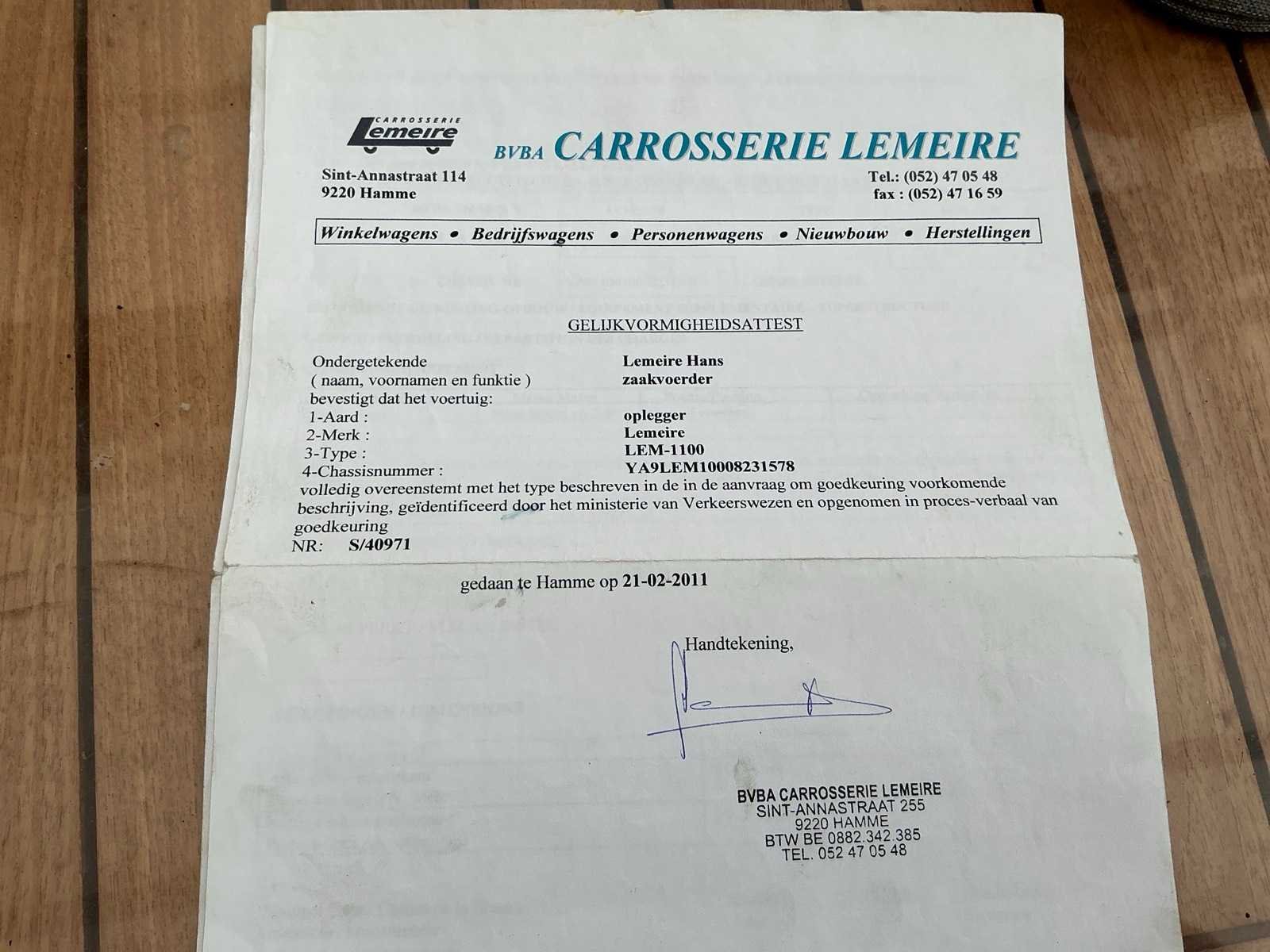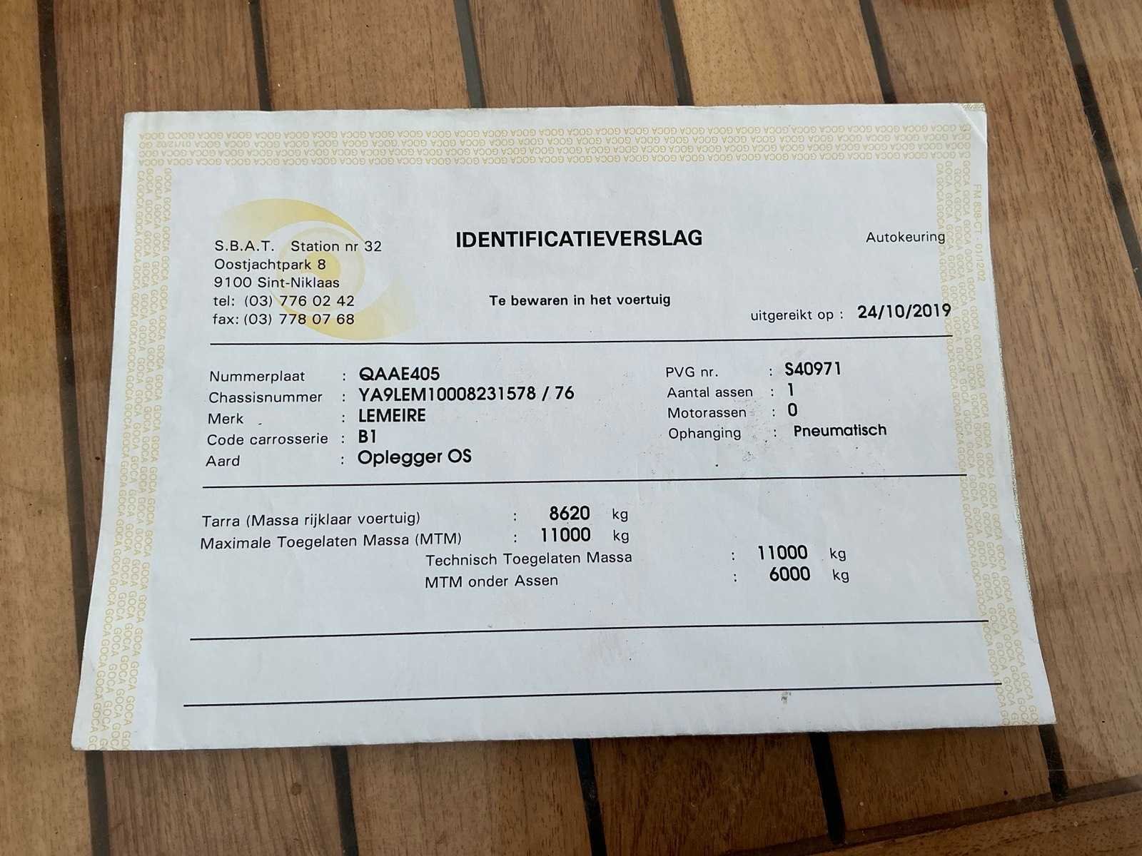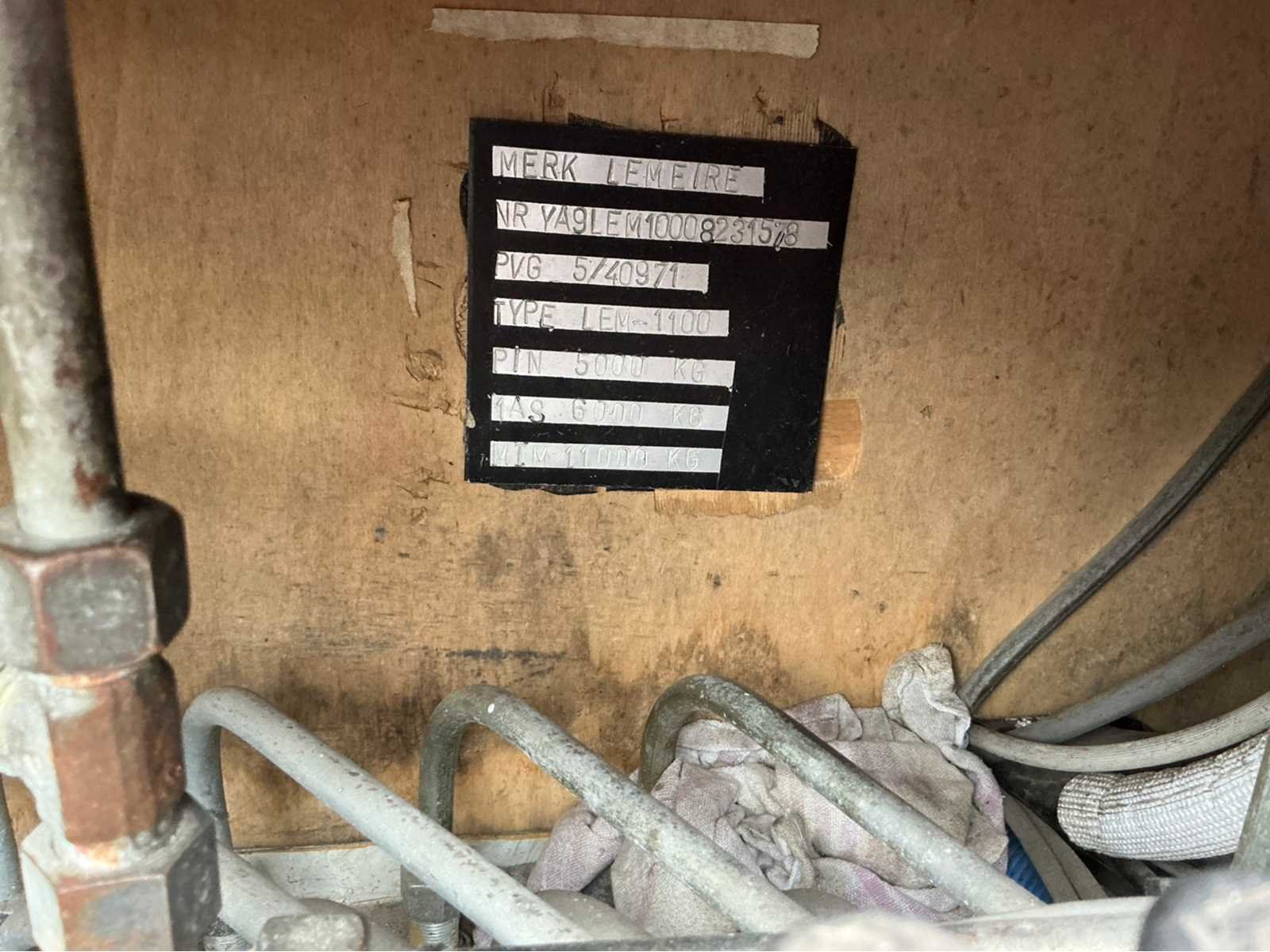 Watertank aanwezig Nee Merk: Lemeire Type: LEM 1100 Bouwjaar: 2011 Chassisnummer VIN: YA9LEM10008231578 Kenteken: QAAE405 Datum eerste toelating: 23/03/2011 Aantal assen: 1