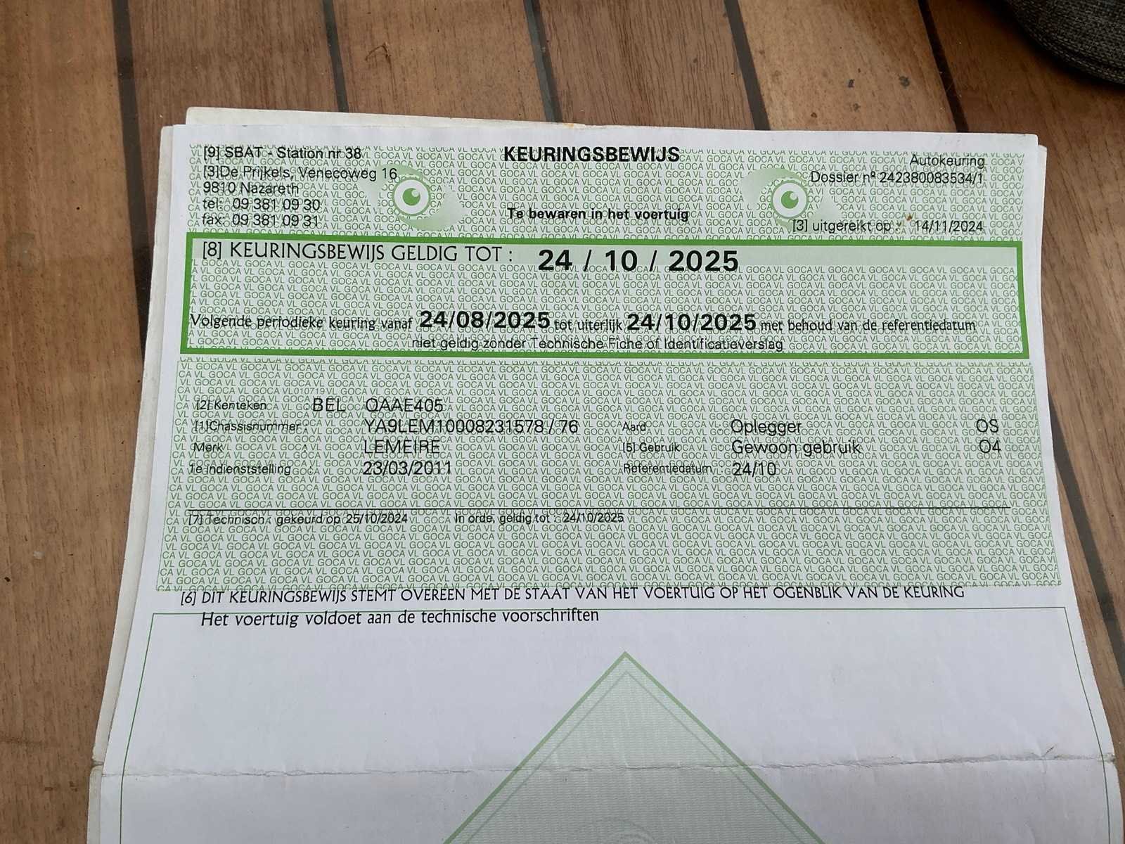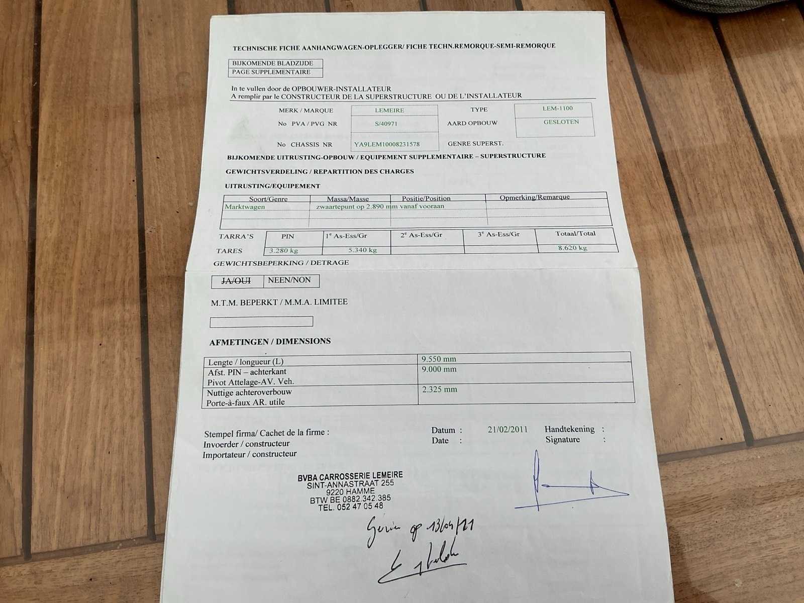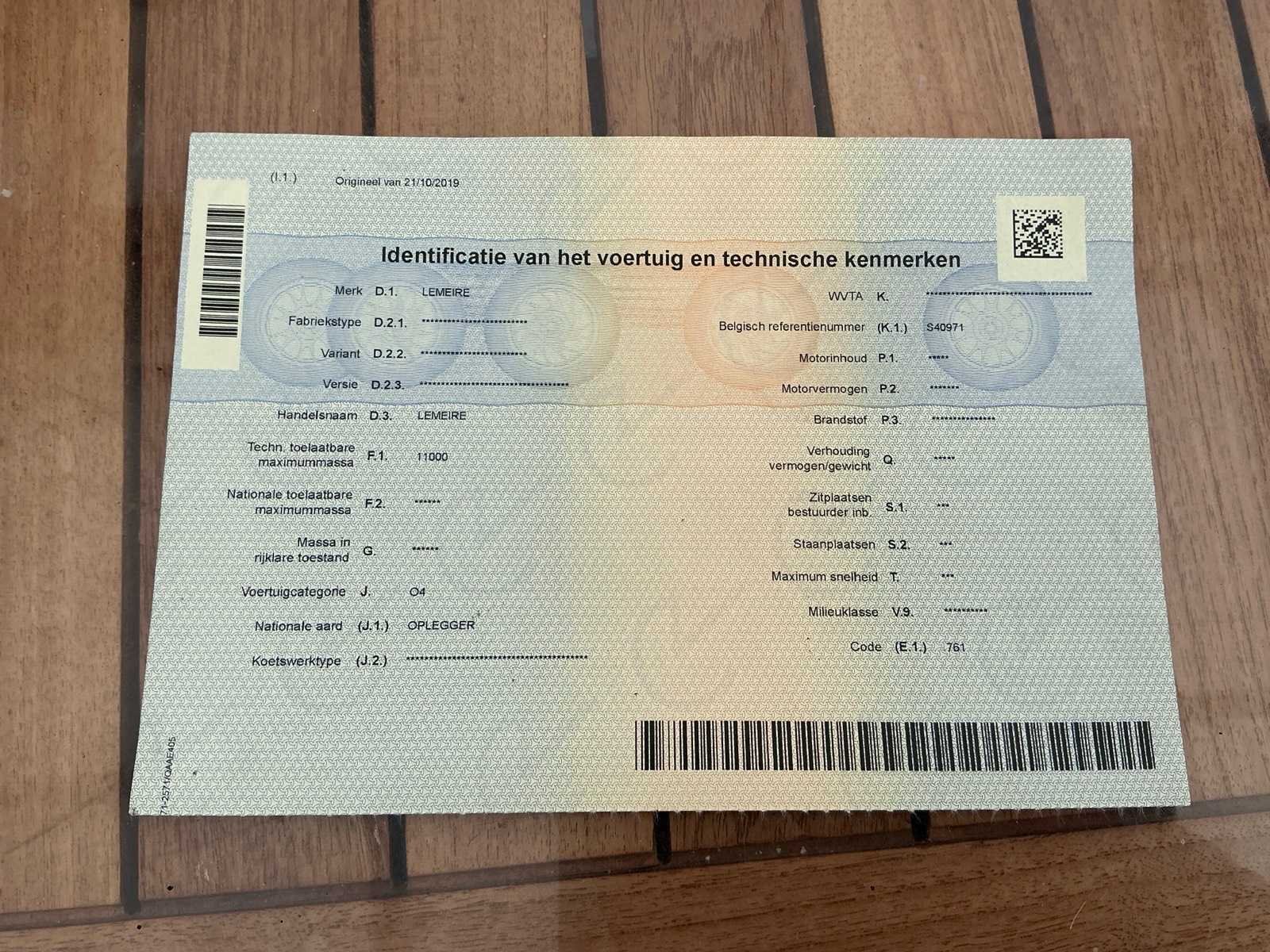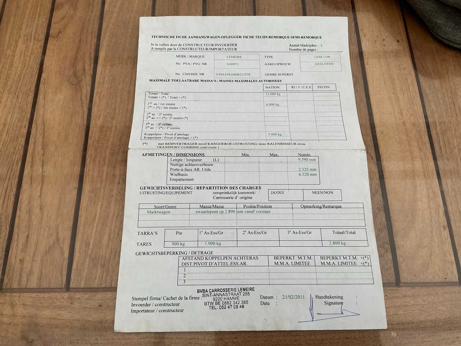 Watertank aanwezig Nee Merk: Lemeire Type: LEM 1100 Bouwjaar: 2011 Chassisnummer VIN: YA9LEM10008231578 Kenteken: QAAE405 Datum eerste toelating: 23/03/2011 Aantal assen: 1