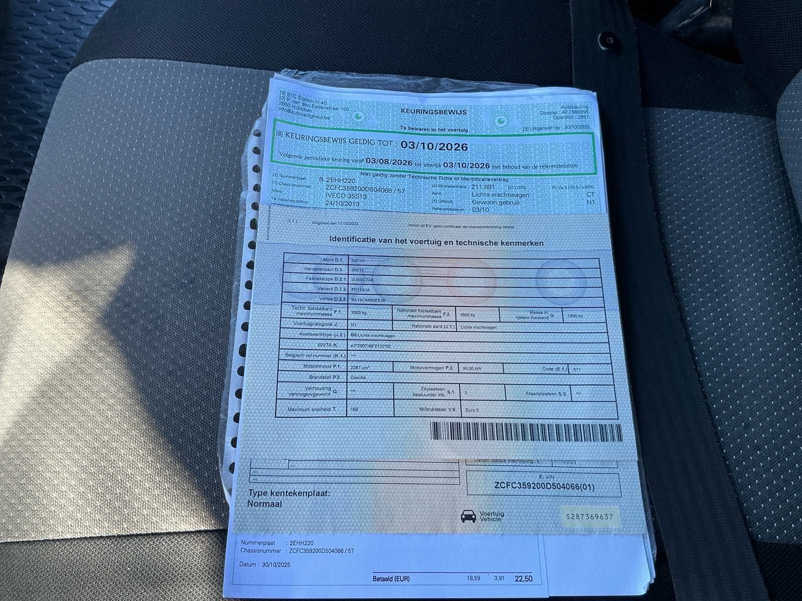 No Merk: Iveco Model: Daily Type: Bestelbus L4 Bouwjaar: 2013 Afgelezen kilometerstand: 220603km Cilinderinhoud: 2287cc Vermogen (kW): 93kW Brandstof: Diesel Chassisnummer: ZCFC359200D504066 Laadvermogen: 1090kg Datum eerste toelating: 24/10/2013 Vermogen (pk): 125hp Energielabel: Euro 5 Aandrijving: FWD Aantal zitplaatsen: 3 Kleur: Wit Transmissie: Manueel Stuurwiel: Links Emissieklasse: Euro 5 Aantal deuren: 5 Aantal sleutels: 2 Ledig gewicht: 2500kg Aantal cilinders: 4 Carrosserie: Bestelbus Nationaliteit documenten: Belgsiche Gelijkvormigheidsattest aanwezig: true Carpass: true Start en rijdt: Ja Keuringsrapport geldig tot: 03//10/2026 Technische fiche: true startinformatie : Start en rijdt Zichtbare schade: Zie foto’s Self drive export possible : true Vavato voert geen technische keuring uit.: true Airconditioning: true Inschrijvingsbewijs - deel 1 : Aanwezig Inschrijvingsbewijs - deel 2: AANWEZIG