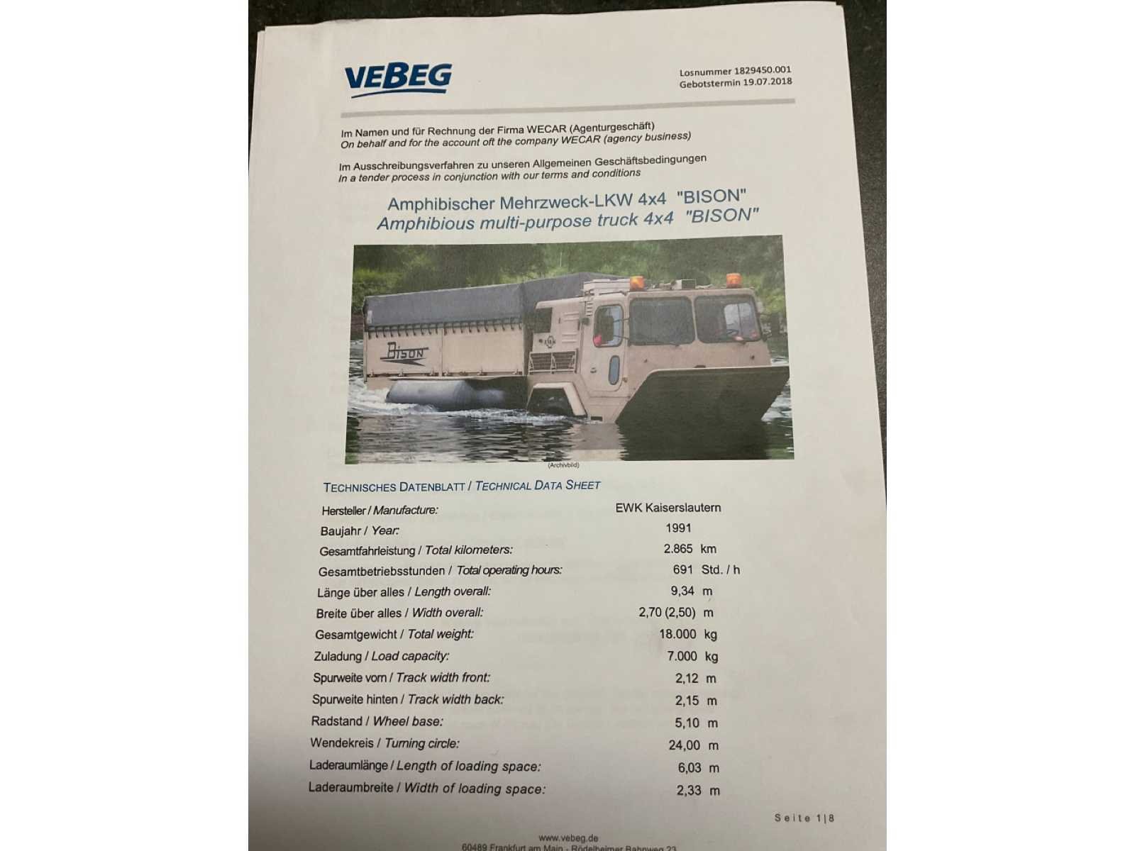 Werkuren: 691u; Motor: KHD type BF 8L 413 8-cilinder; Bandenmaat: 23.5-25; Voorzien van: Airco/Waeco camera No Merk: EWK Type: Bison 4x4 Bouwjaar: 1991 Aantal assen: 2 Asconfiguratie: 4x4 Motorvermogen (kW): 235kW Automaat: true Diesel: true Laadvermogen: 7000kg Kilometerstand bij opname: 2865km Gesloten opbouw: true Totale afmeting L: 9340mm Totale afmeting Breedte: 2700mm