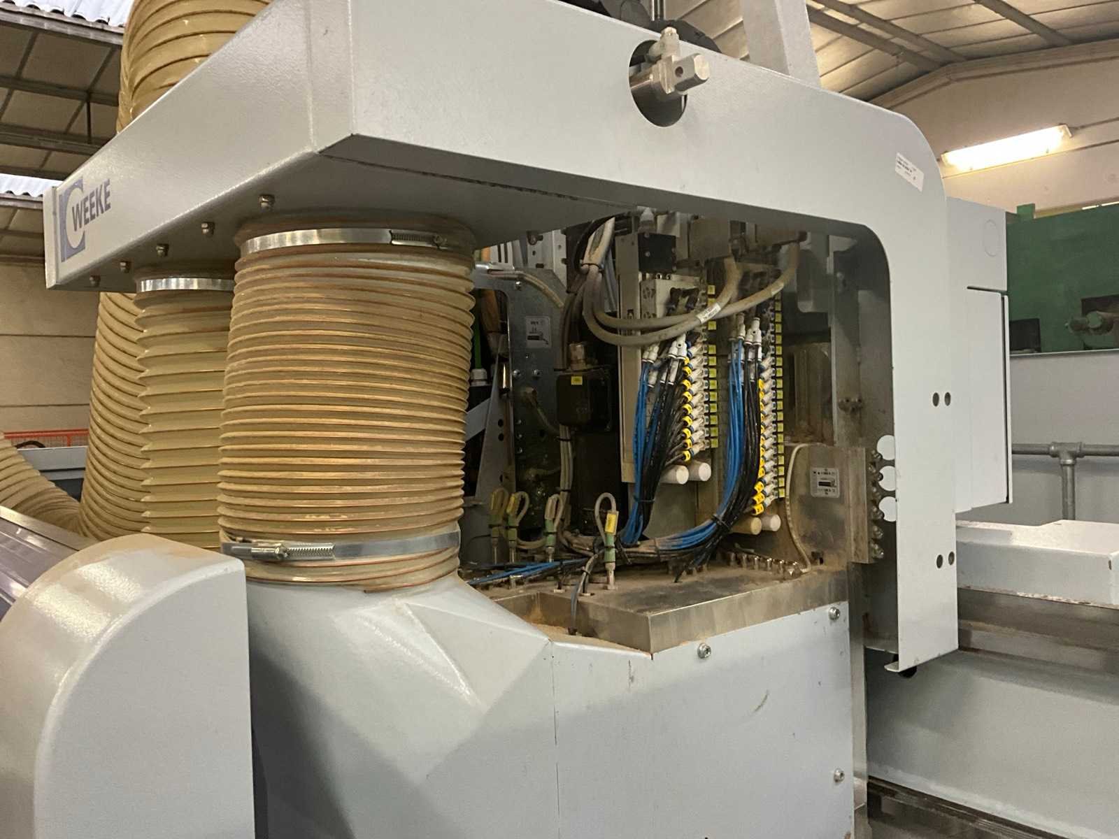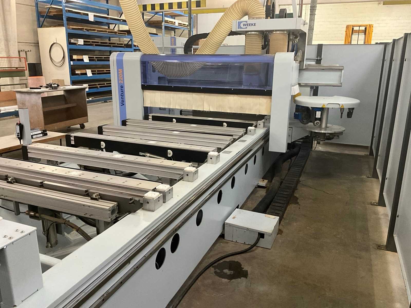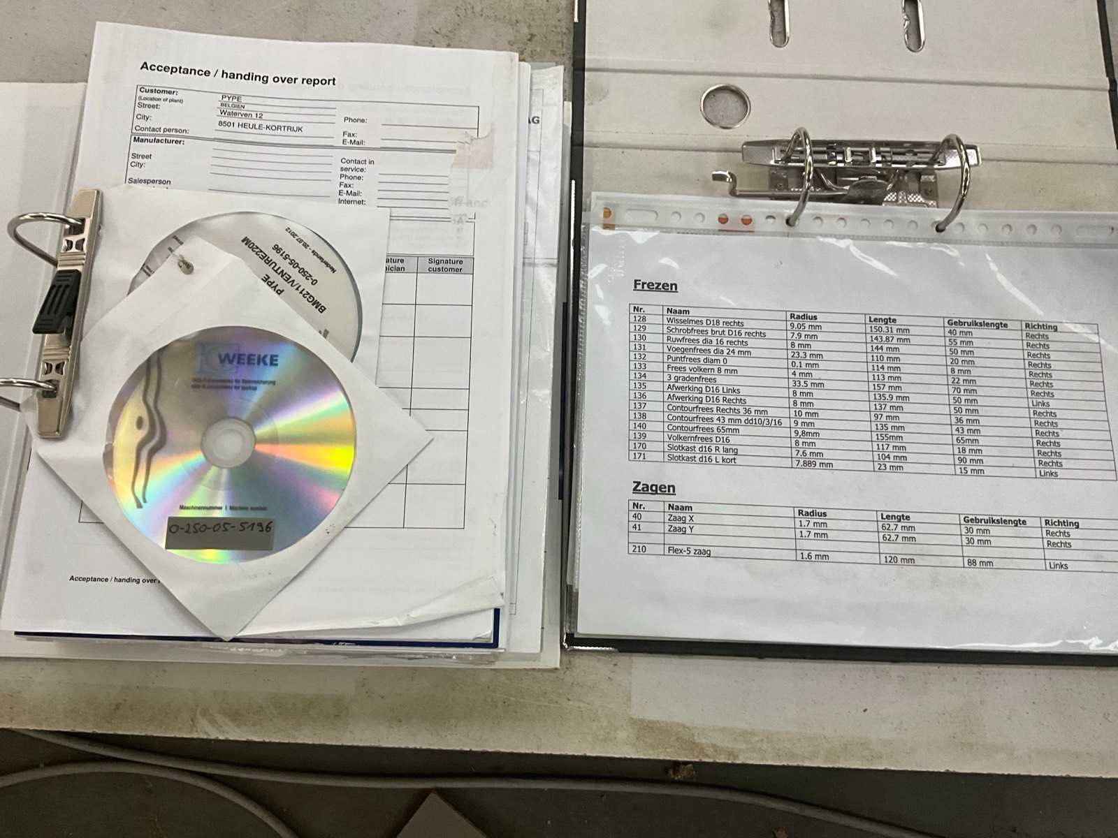 Voorzien van carrousel voor tools, vacuüm tafel met pomp, bedieningspaneel met scherm, gebruikershandleiding, veiligheidsafrastering met veiligheidsdeur, + houten kast met bijhorende tools en snijgereedschap, afzuiging tot aan afsluitklep inbegrepen, demontage ten laste van de koper Nee Merk: Weeke Type: Venture 220M Bouwjaar: 2012 Serienummer: 0-250-05-5196 Aansluiting: 400V Afmeting l: 3200mm Afmeting b: 6500mm Afmeting h: 2500mm