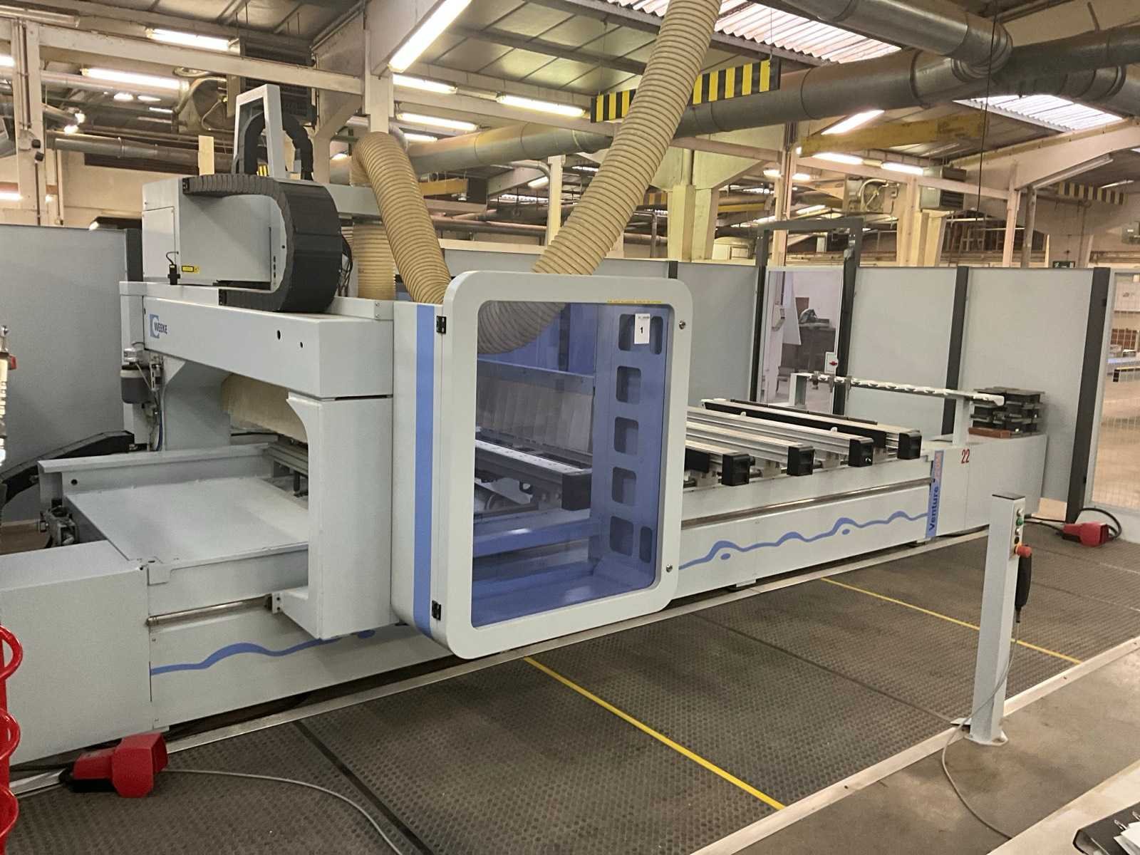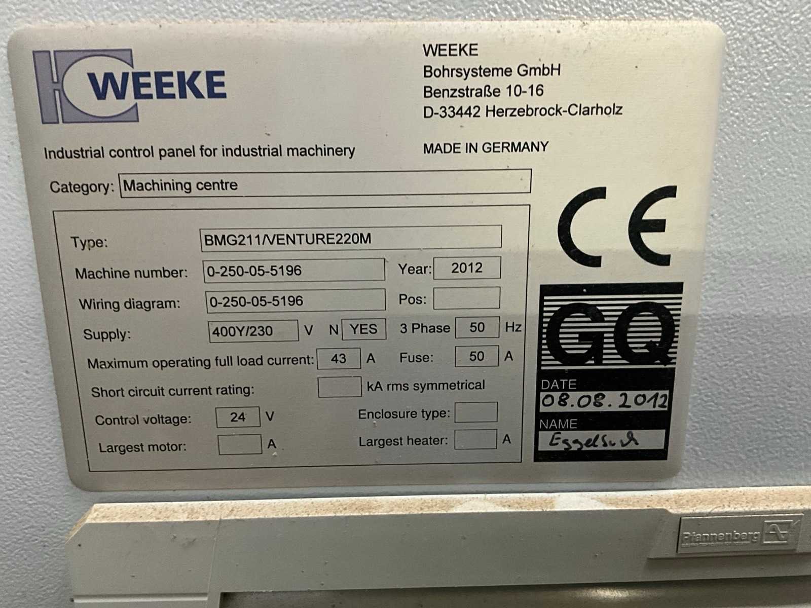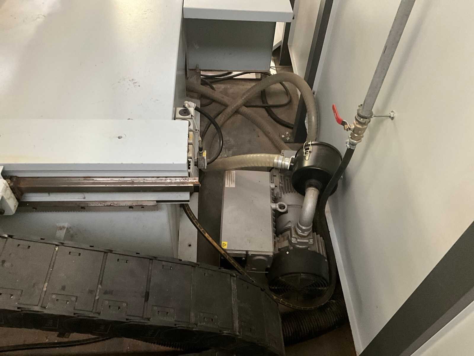 Voorzien van carrousel voor tools, vacuüm tafel met pomp, bedieningspaneel met scherm, gebruikershandleiding, veiligheidsafrastering met veiligheidsdeur, + houten kast met bijhorende tools en snijgereedschap, afzuiging tot aan afsluitklep inbegrepen, demontage ten laste van de koper Nee Merk: Weeke Type: Venture 220M Bouwjaar: 2012 Serienummer: 0-250-05-5196 Aansluiting: 400V Afmeting l: 3200mm Afmeting b: 6500mm Afmeting h: 2500mm