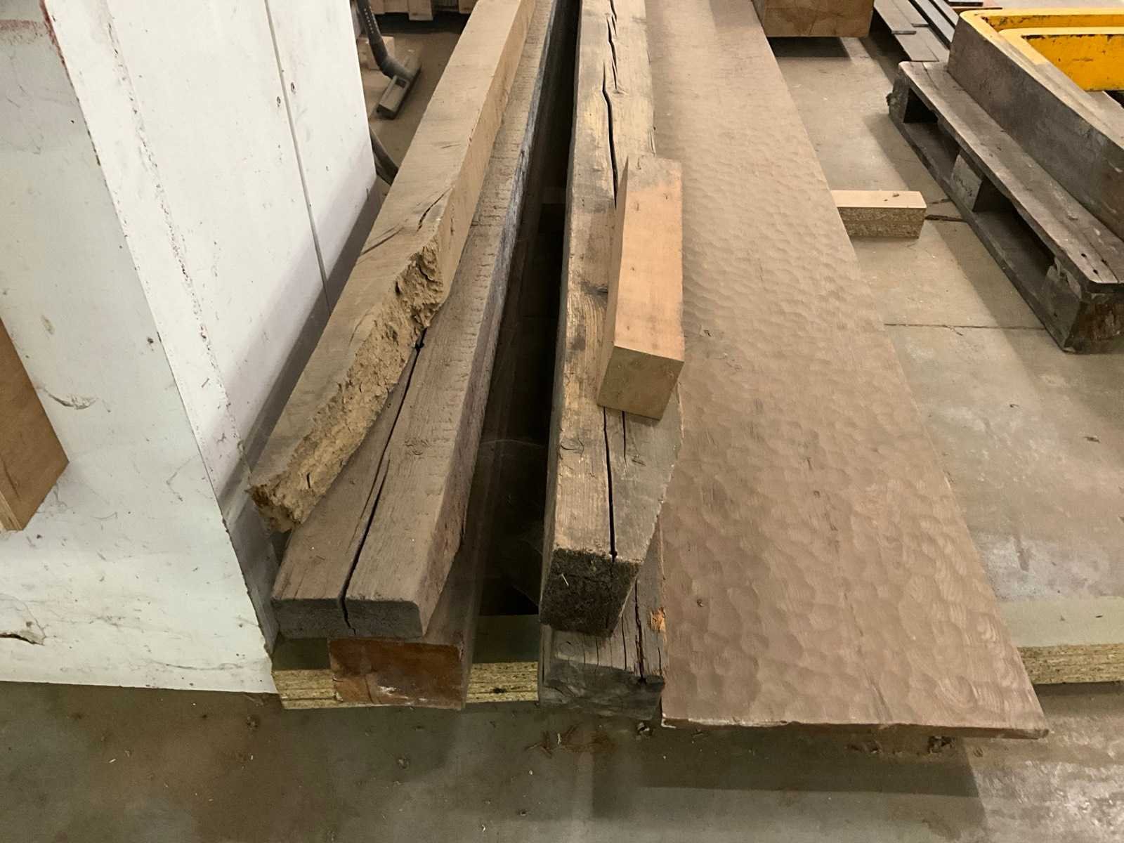 Bestaand uit 4x eiken balk 13x15 cm met lengtes t.w. 5-7 meter, +1x eiken blok 34x14 cm lengte 180 cm, + paar kleinere balken, + profiel ijzer, (heftruckvorken niet inbegrepen) Nee