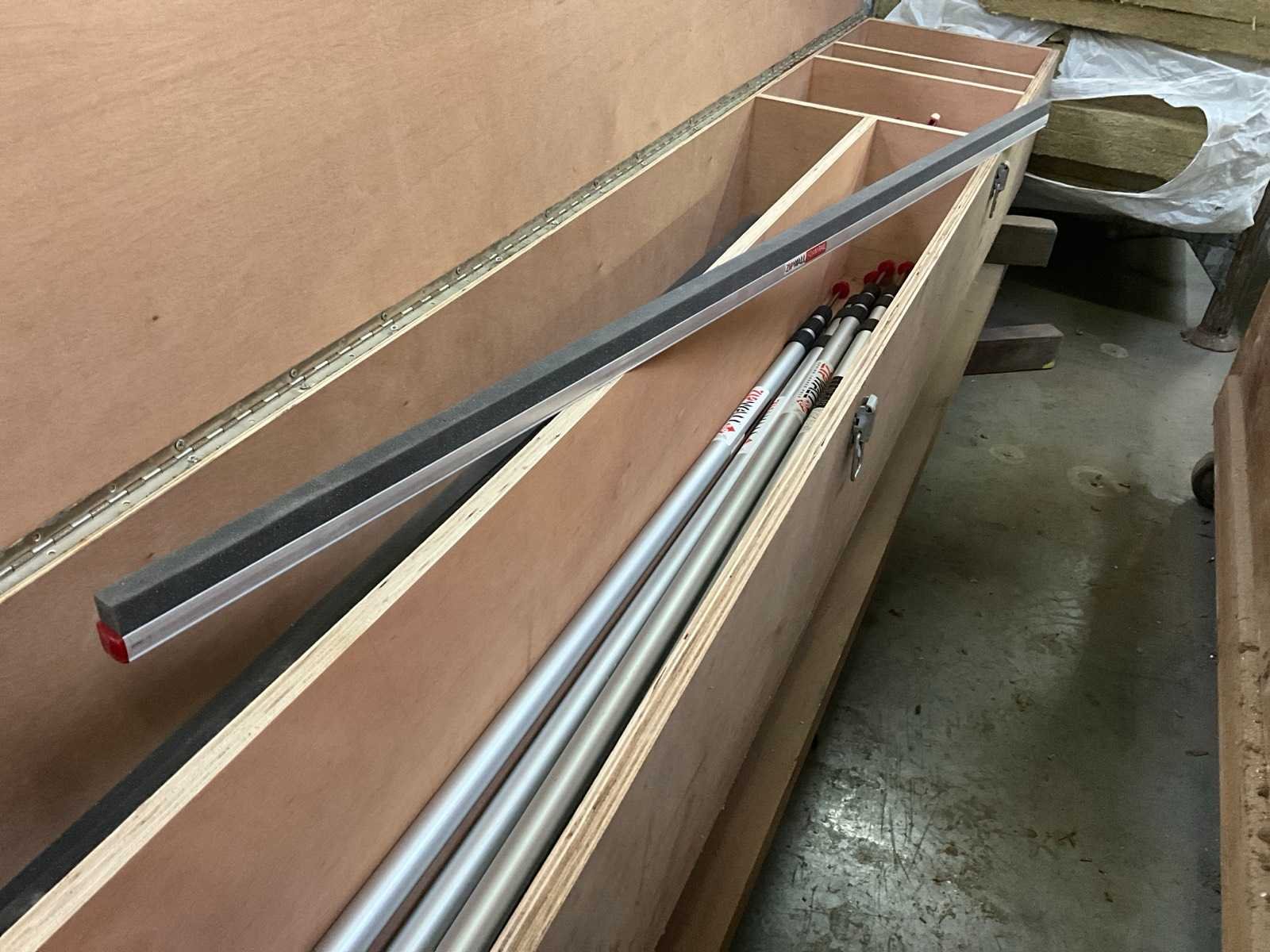 Bestaand uit set met 7 x telescopische steunen, +bijhorende tools, in houten opbergkoffer Nee Merk: Zipwall Lengte: 230cm Breedte: 40cm Hoogte: 30cm