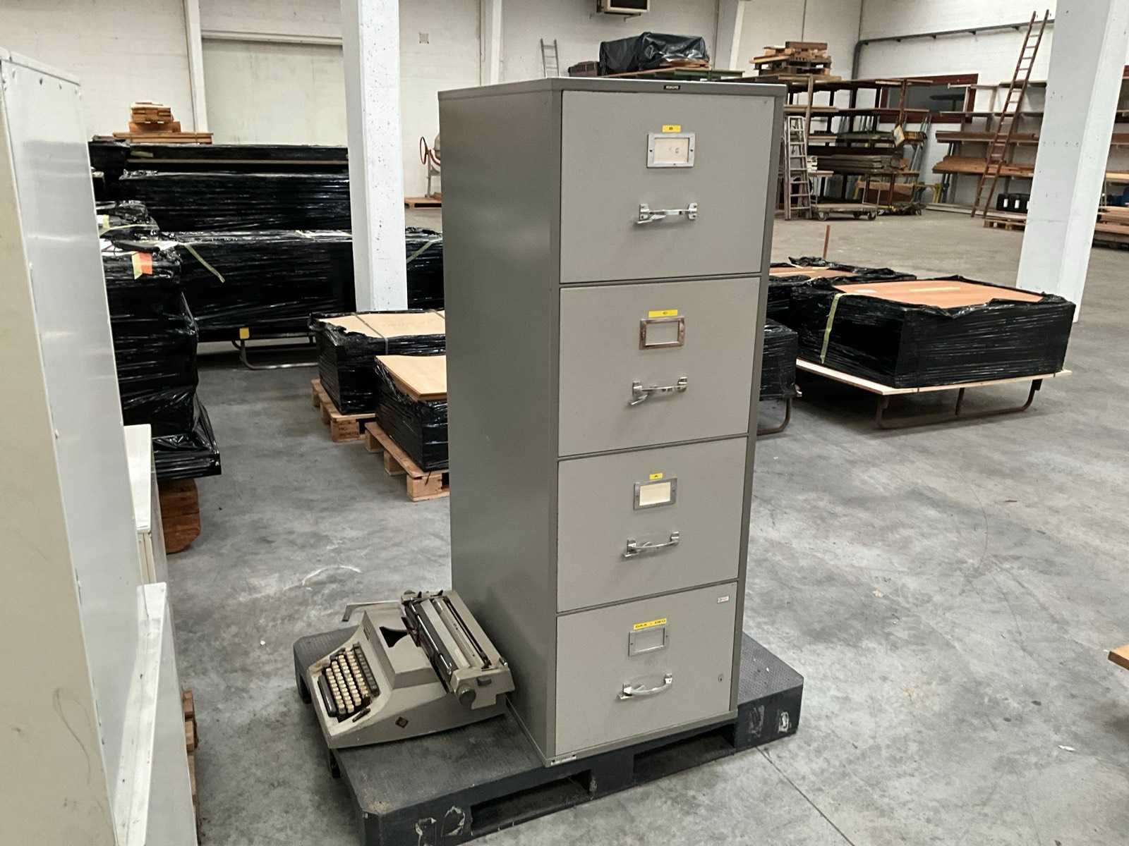 Bestaand uit 5x kast met 2 lades, +1x metalen 4 lades dossierkast, +1x typmachine Nee Lengte: 66cm Breedte: 52cm Hoogte: 73cm