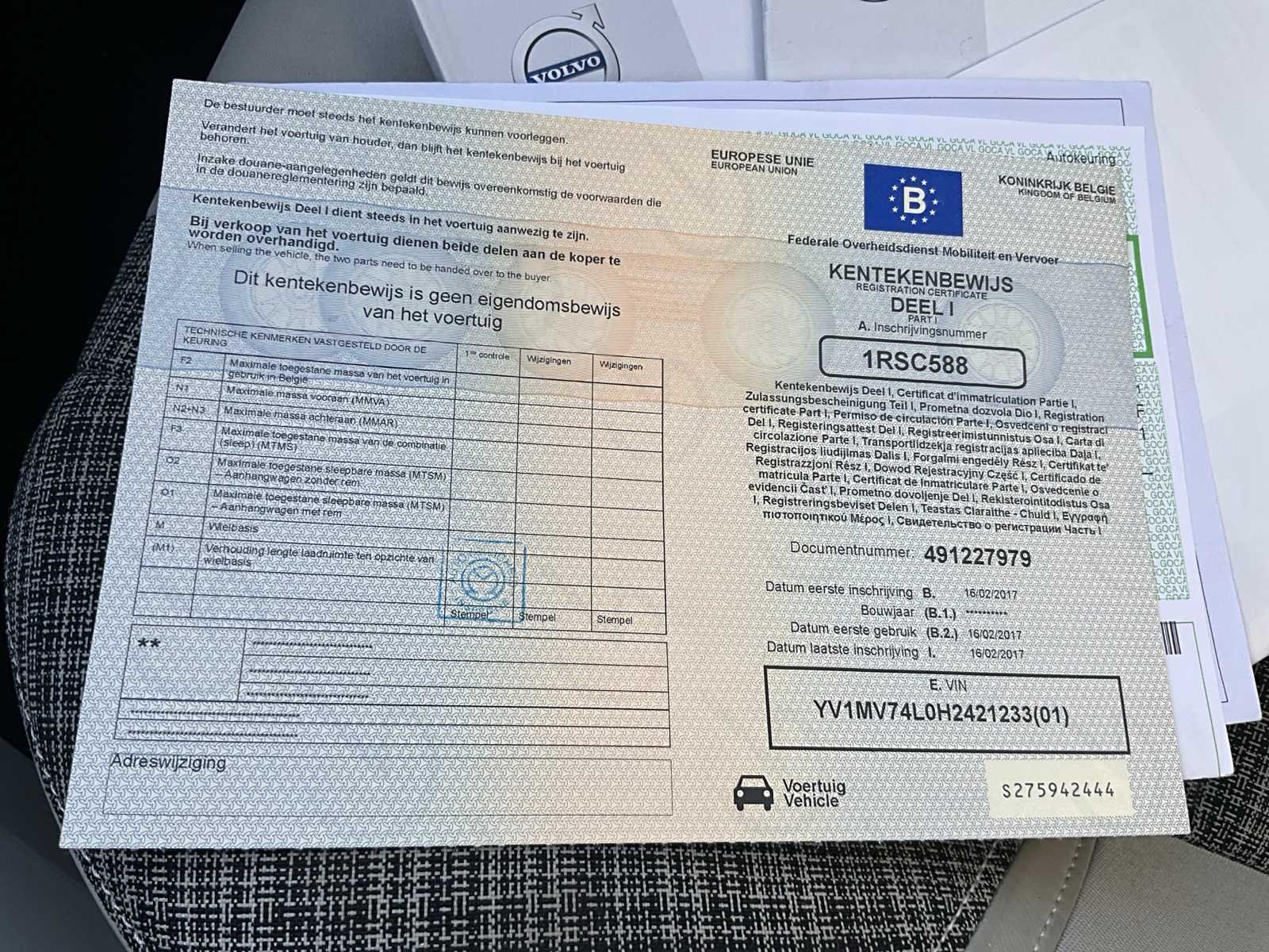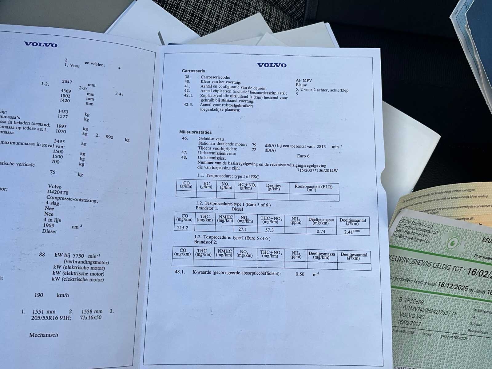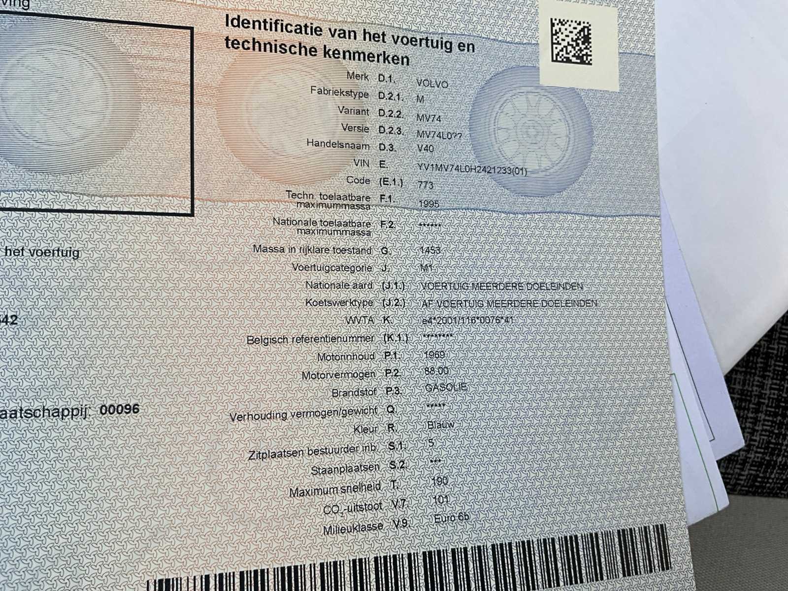 Aanwezig : kentekenbewijs deel I en II, gelijkvormigheidsattest en keuringsbewijs geldig tot 16/02/2026. Nee Kenteken: 1RSC588 Merk: Volvo Model: V40 Bouwjaar: 2017 Chassisnummer: YV1MV74L0H2421233 Afgelezen kilometerstand: 314867km Cilinderinhoud: 1969cc Vermogen (kW): 88kW Brandstof: Gasolie Datum eerste inschrijving: 16/02/2017 Aantal zitplaatsen: 5 Nationaliteit documenten: Belgisch Aantal deuren: 5 Aantal sleutels: 1 CO2-uitstoot NEDC: 101 Emissieklasse: Euro 6b Kentekenpapieren compleet?: true Boorddocumenten aanwezig?: true Onderhoudshistorie: Aanwezig Startinformatie: Rijdt