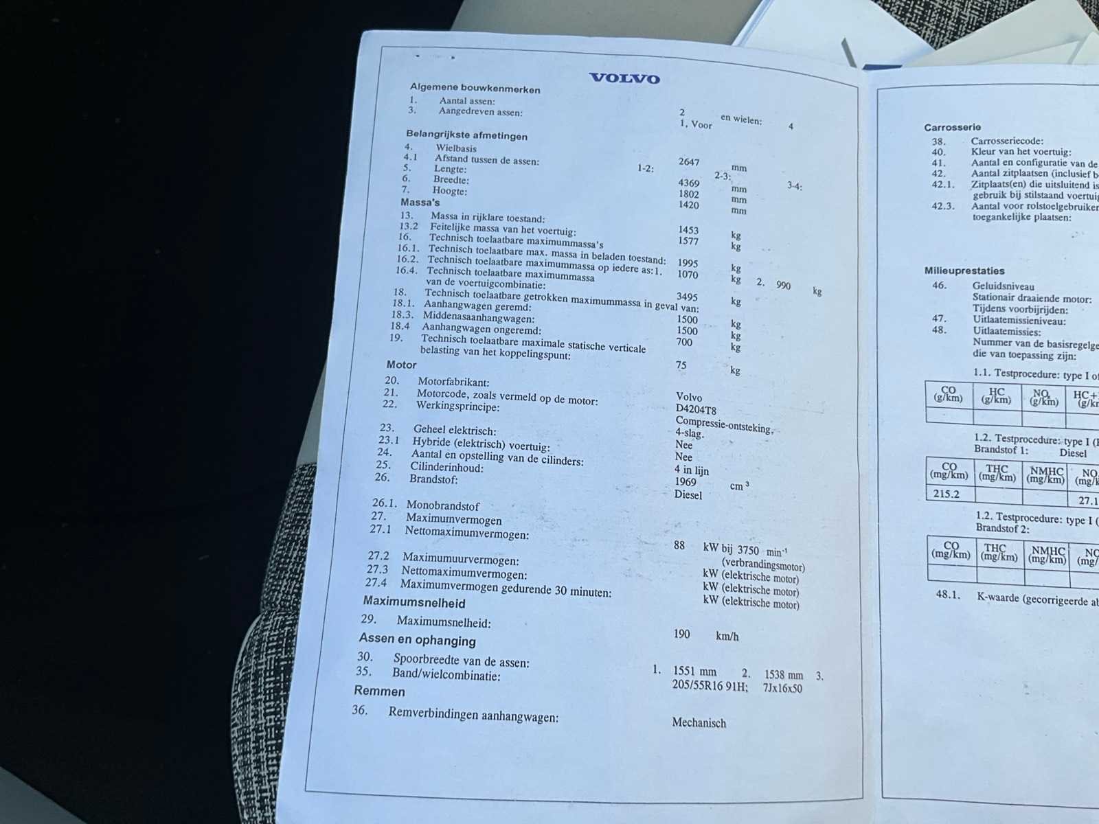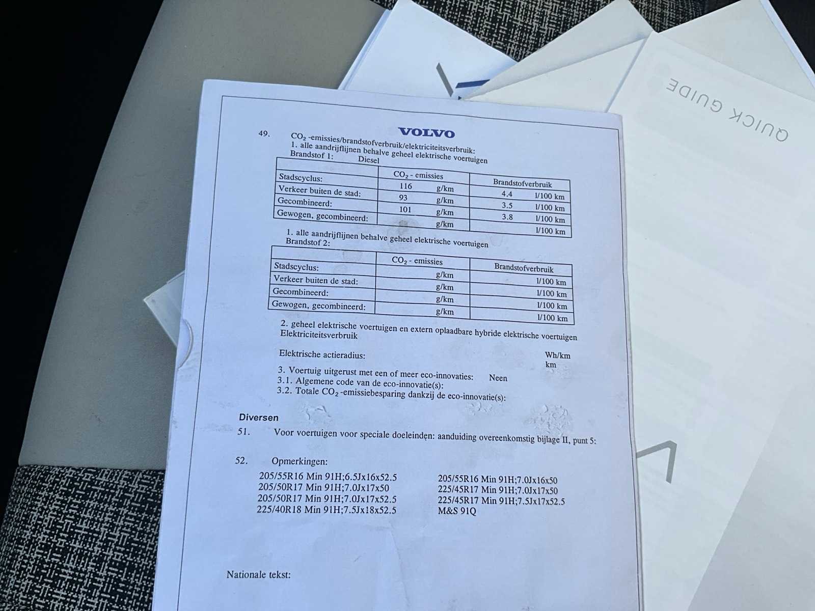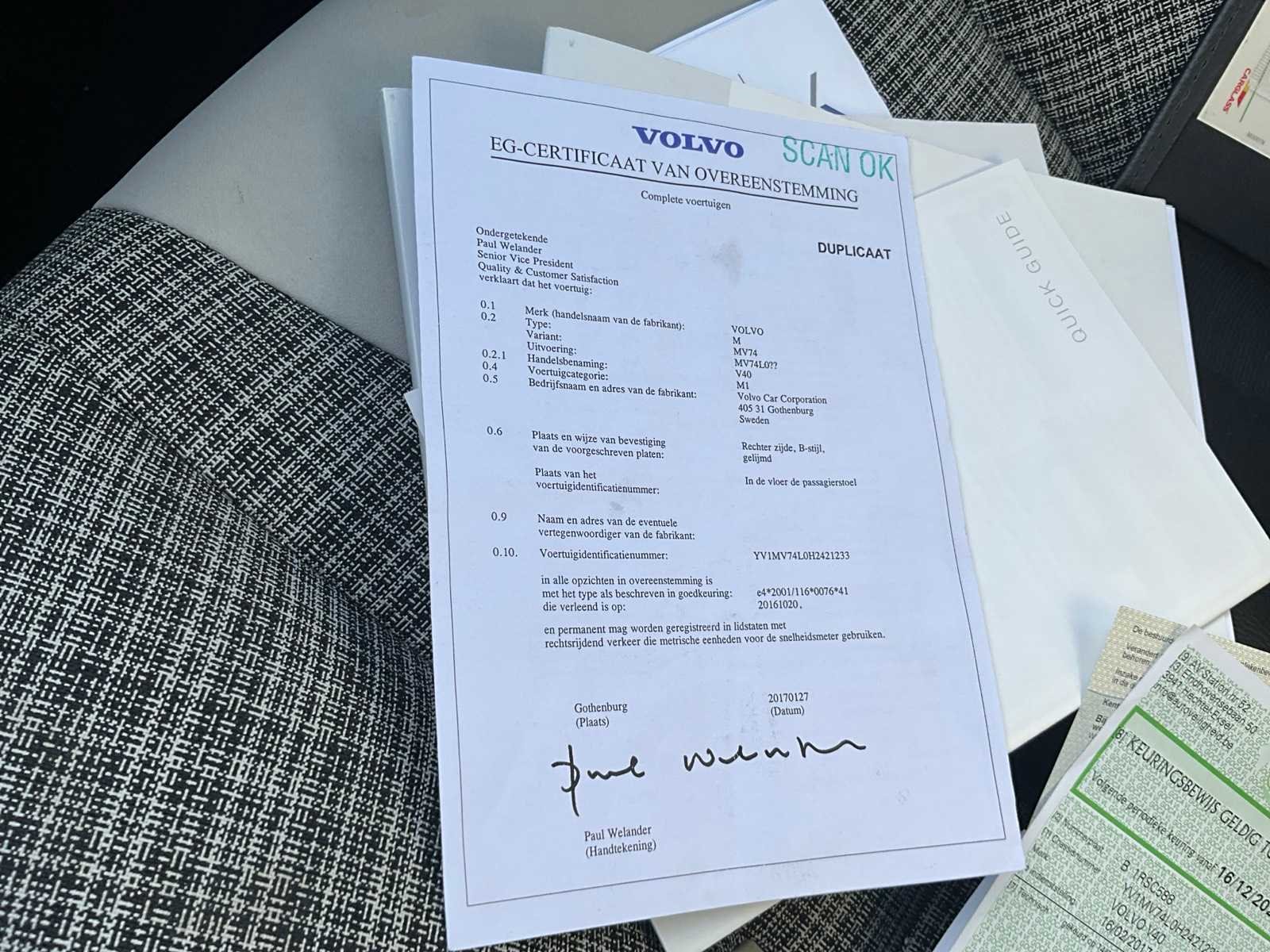 Aanwezig : kentekenbewijs deel I en II, gelijkvormigheidsattest en keuringsbewijs geldig tot 16/02/2026. Nee Kenteken: 1RSC588 Merk: Volvo Model: V40 Bouwjaar: 2017 Chassisnummer: YV1MV74L0H2421233 Afgelezen kilometerstand: 314867km Cilinderinhoud: 1969cc Vermogen (kW): 88kW Brandstof: Gasolie Datum eerste inschrijving: 16/02/2017 Aantal zitplaatsen: 5 Nationaliteit documenten: Belgisch Aantal deuren: 5 Aantal sleutels: 1 CO2-uitstoot NEDC: 101 Emissieklasse: Euro 6b Kentekenpapieren compleet?: true Boorddocumenten aanwezig?: true Onderhoudshistorie: Aanwezig Startinformatie: Rijdt