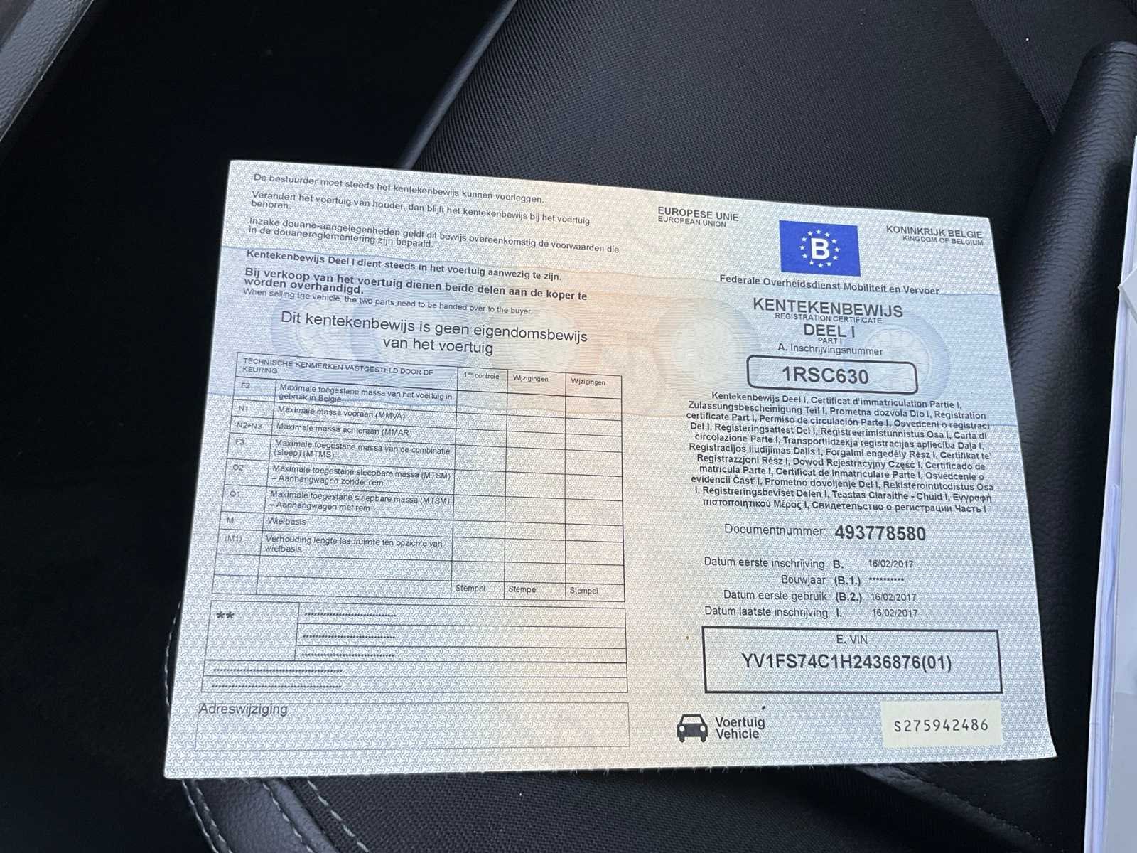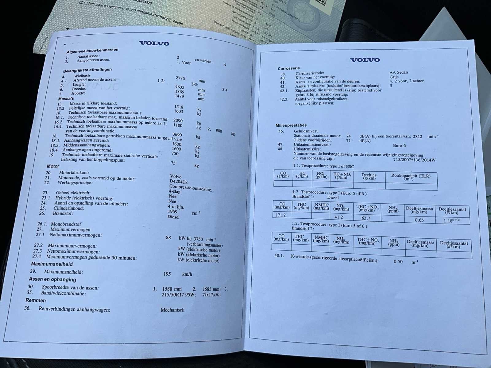 Aanwezig : kentekenbewijs deel I en II, gelijkvormigheidsattest en keuringsbewijs geldig tot 16/02/2026. Nee Kenteken: 1RSC630 Merk: Volvo Model: S60 Bouwjaar: 2017 Chassisnummer: YV1FS74C1H2436876 Afgelezen kilometerstand: 253002km Cilinderinhoud: 1969cc Vermogen (kW): 88kW Brandstof: Gasolie Datum eerste inschrijving: 16/02/2017 Aantal zitplaatsen: 5 Nationaliteit documenten: Belgisch Aantal deuren: 5 Aantal sleutels: 1 CO2-uitstoot NEDC: 99 Emissieklasse: Euro 6b Kentekenpapieren compleet?: true Boorddocumenten aanwezig?: true Onderhoudshistorie: Aanwezig Startinformatie: Rijdt