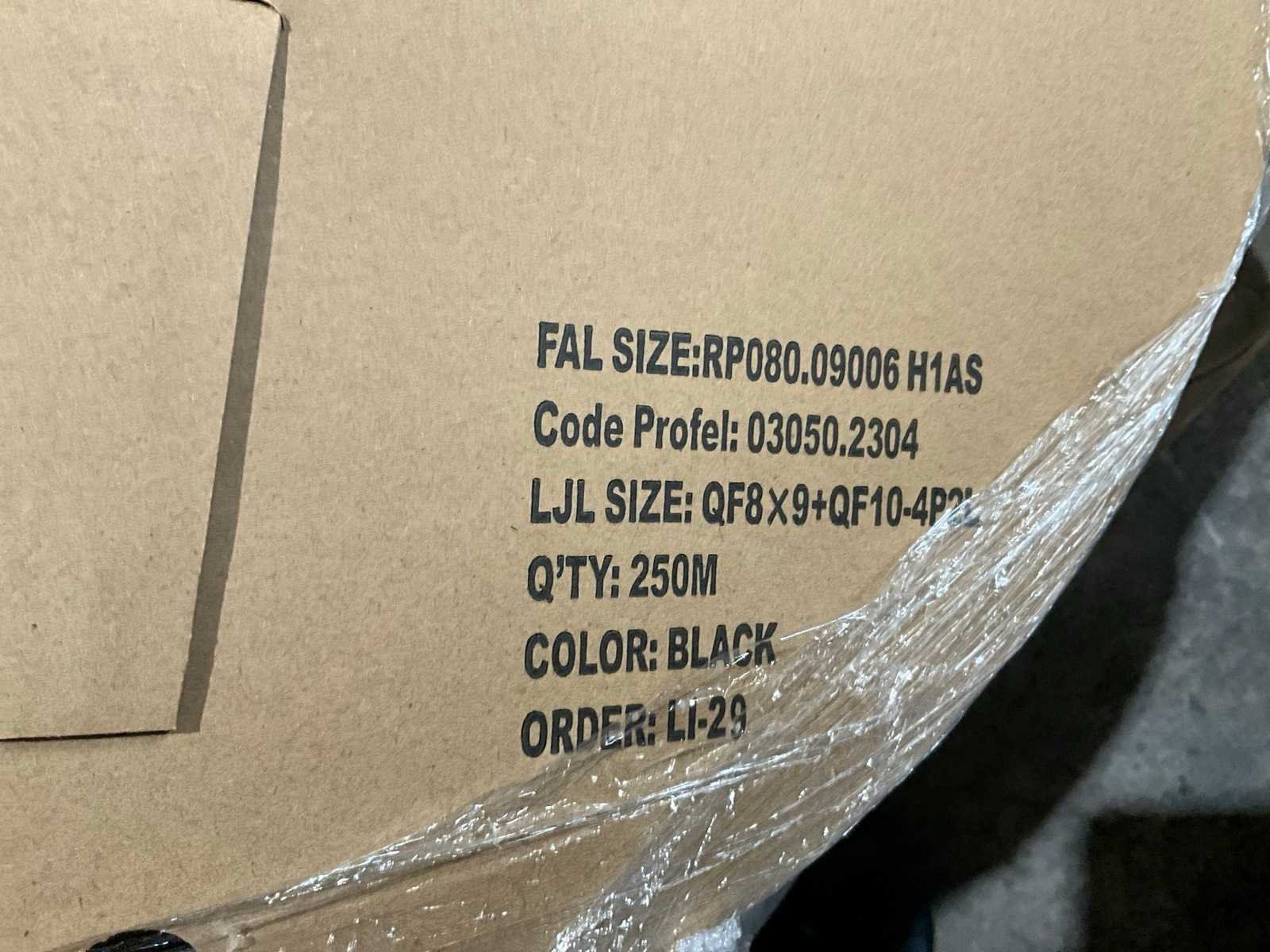 36 rollen, elk inhoudende 250 meter strip, specificaties zie foto, kleur zwart, verpakt per 2 rollen in doos. Totaal : 9000 lpm. Nee