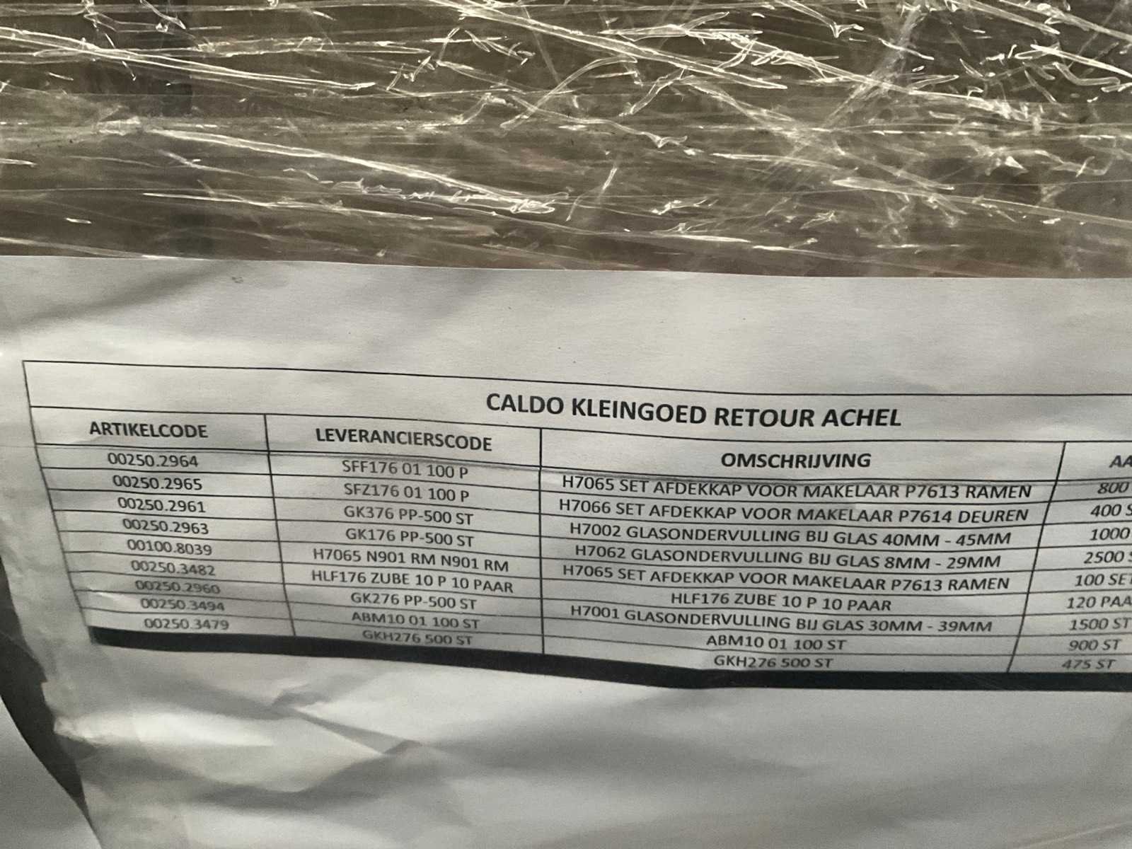 Waaronder sets afdekkappen, glasondervullingen bij glas in diverse mm, enz. Allemaal in dozen verpakt. Voor detail : zie foto met specificatie van de inhoud. Nee Merk: Caldo
