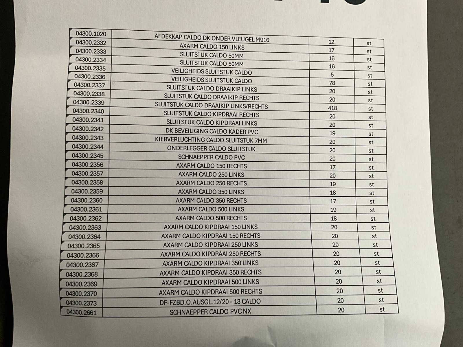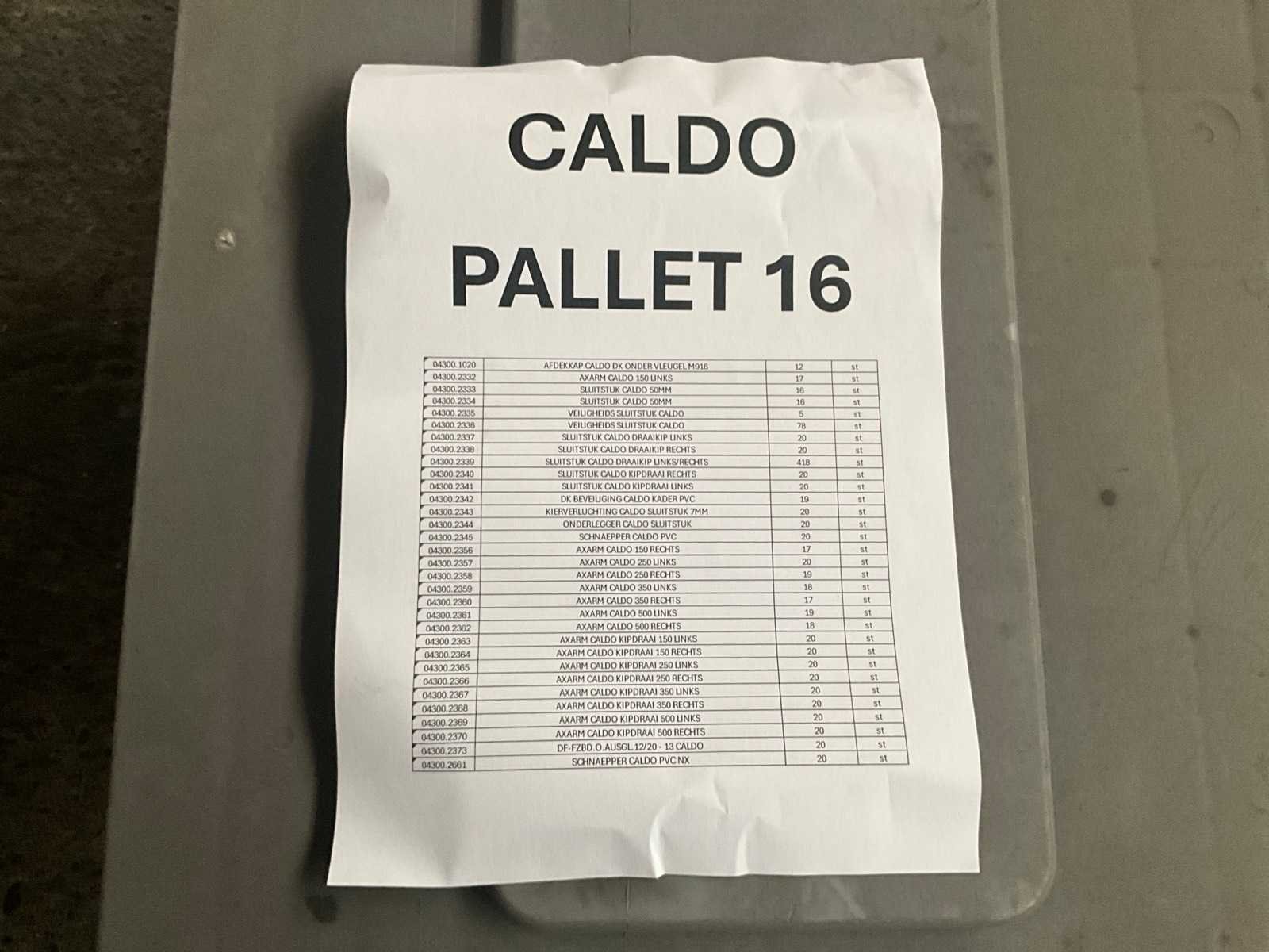 Waaronder sluitstukken, veiligheids sluitstukken, draaikip, axarmen, kipdraai, en toebehoren. Allemaal in dozen verpakt. Voor detail : zie foto met specificatie van de inhoud. Nee Merk: Caldo