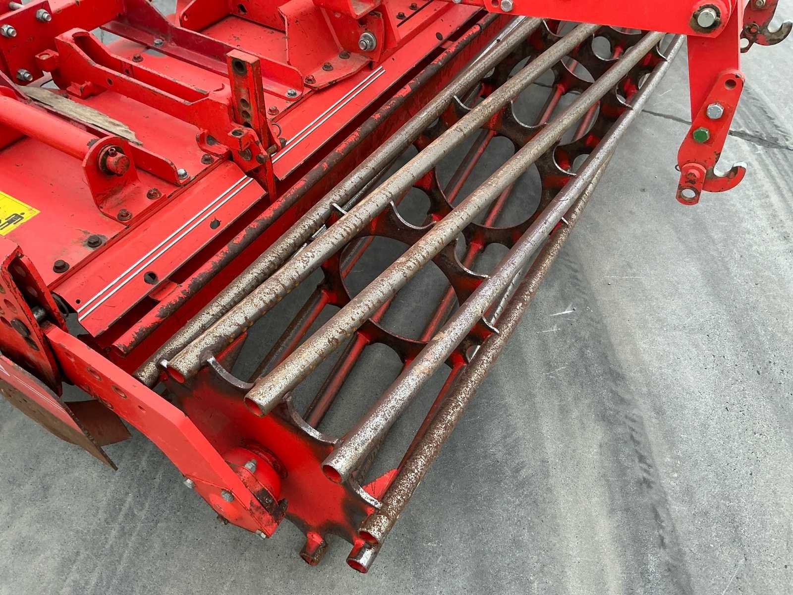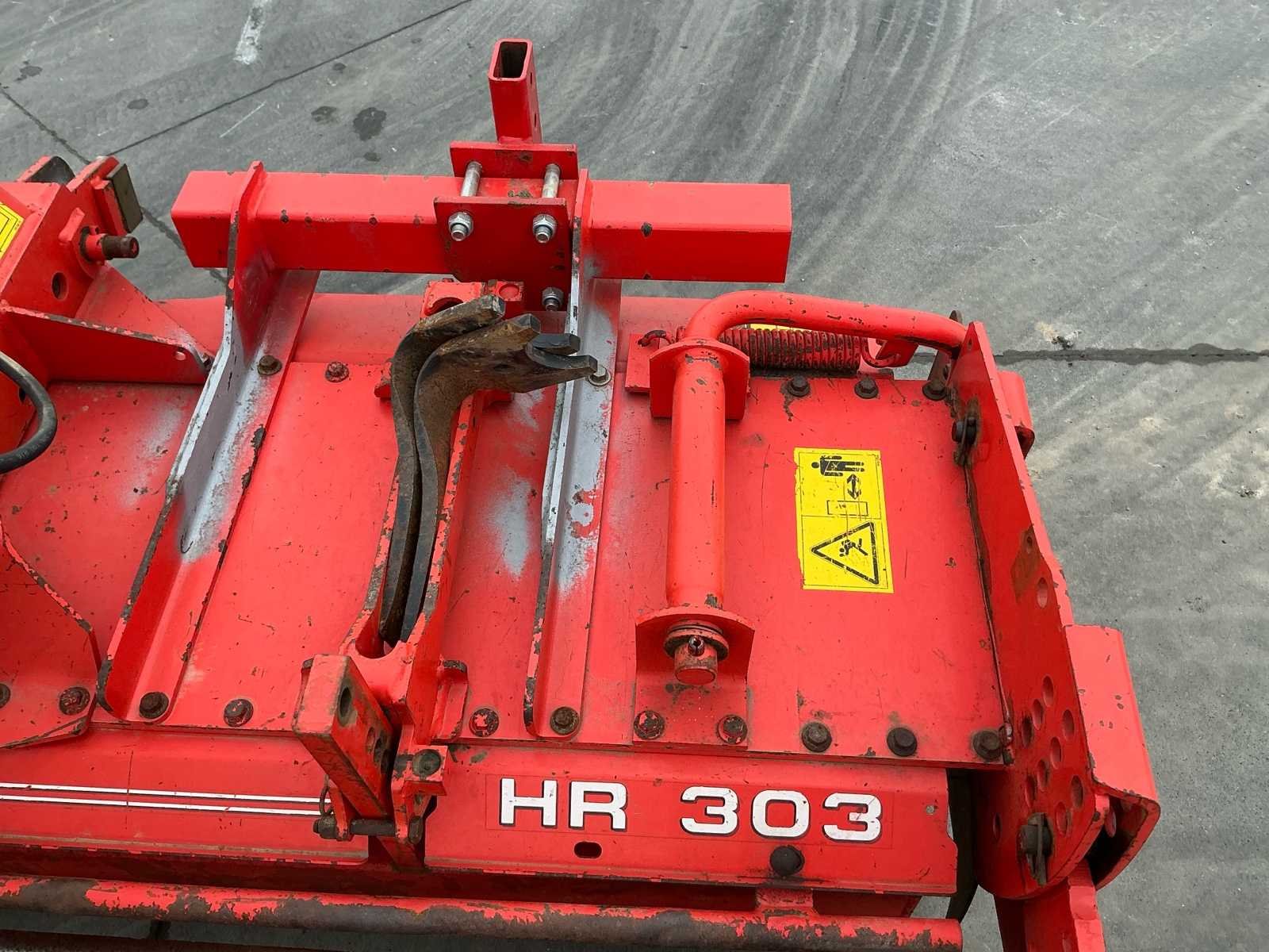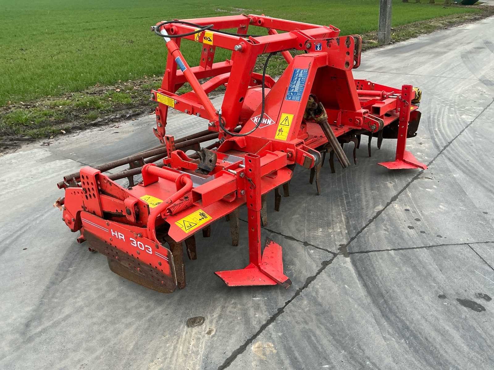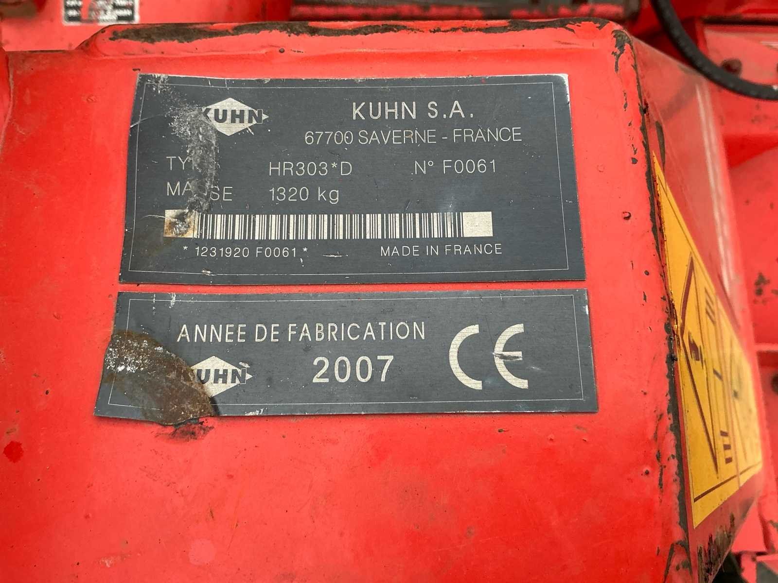 Werkbreedte van 3meter - kooirol - hydraulische lift - egalisatiebalk en spoorwissers - boîte met 2 versnellingen en doorlopende aftakas - 10 rotoren No Merk: Kuhn Type: HR303 Bouwjaar: 2007 Eigen gewicht: 1320kg Totale afmeting Breedte: 3005mm