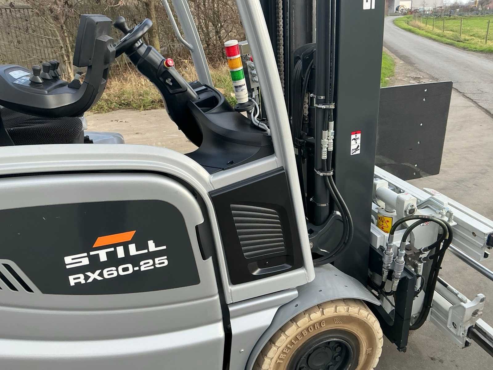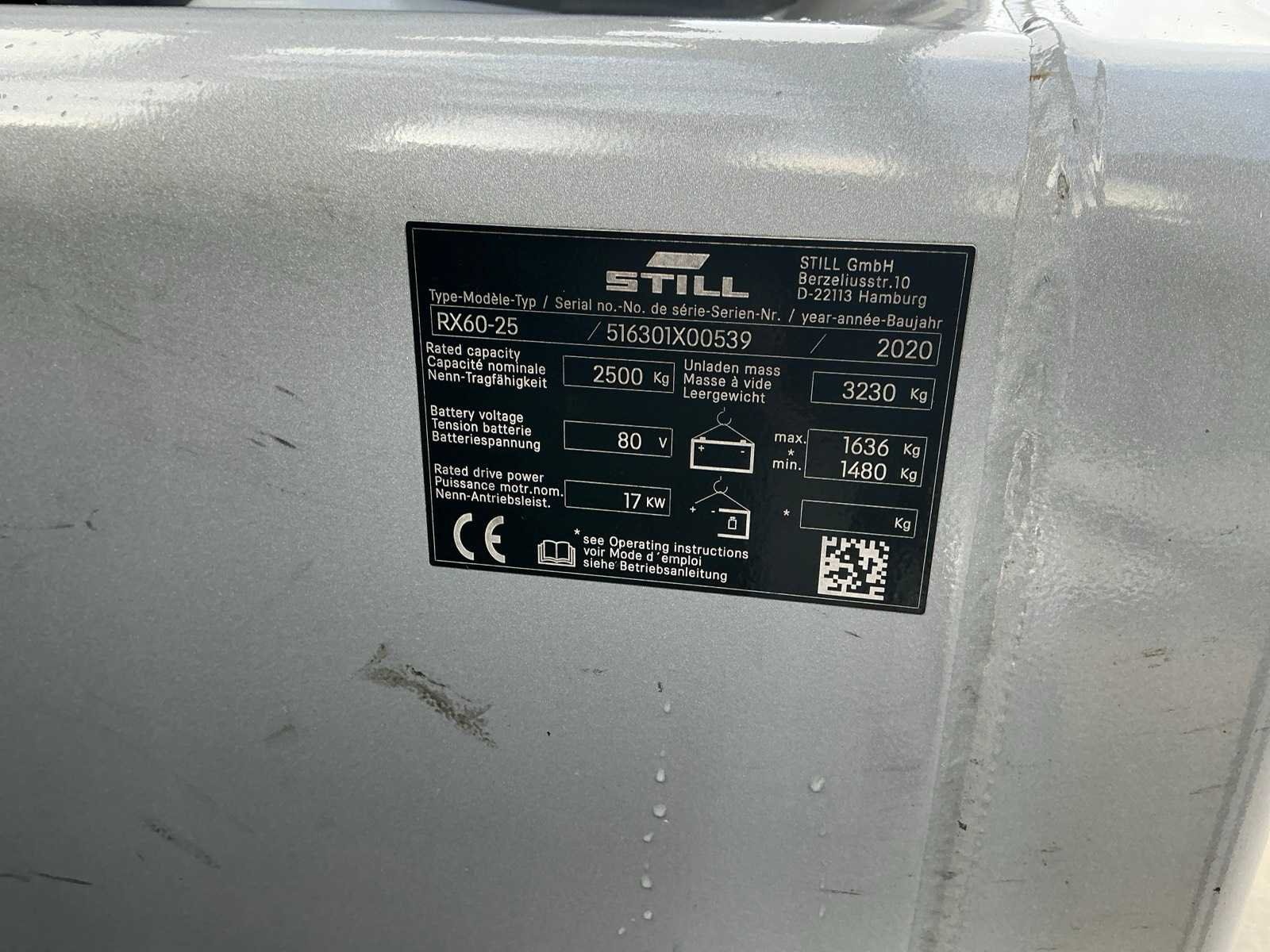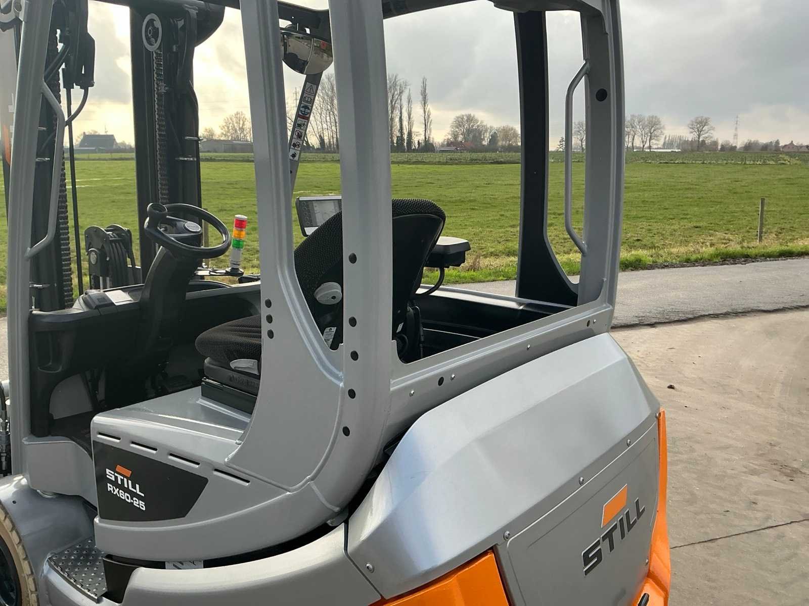 Cascade Klem met druk regeling en voorover kippen , 5 valven , led werklichten , blue spot , flash light , hoppecke trac air accu met passende lader Nee Merk: Still Type: RX60-25 Bouwjaar: 2020 Serienummer: 516301X00539 Brandstof: Elektrisch Mast: Triple Soort band: Volrubber banden Aantal wielen: 4 Afgelezen urenstand: 4500 Accu lader: true Side-shift: true Roterend vorkenbord: true Hydraulisch verstelbare lepels: true Triple mast: true Eigen gewicht: 5000kg Hefvermogen: 2500kg Lepellengte: 1400mm Min. hefhoogte: 0mm Max. hefhoogte: 4890mm Vol rubber banden: true Totale afmeting L: 3000mm Totale afmeting Breedte: 1150mm Totale afmeting Hoogte: 2250mm