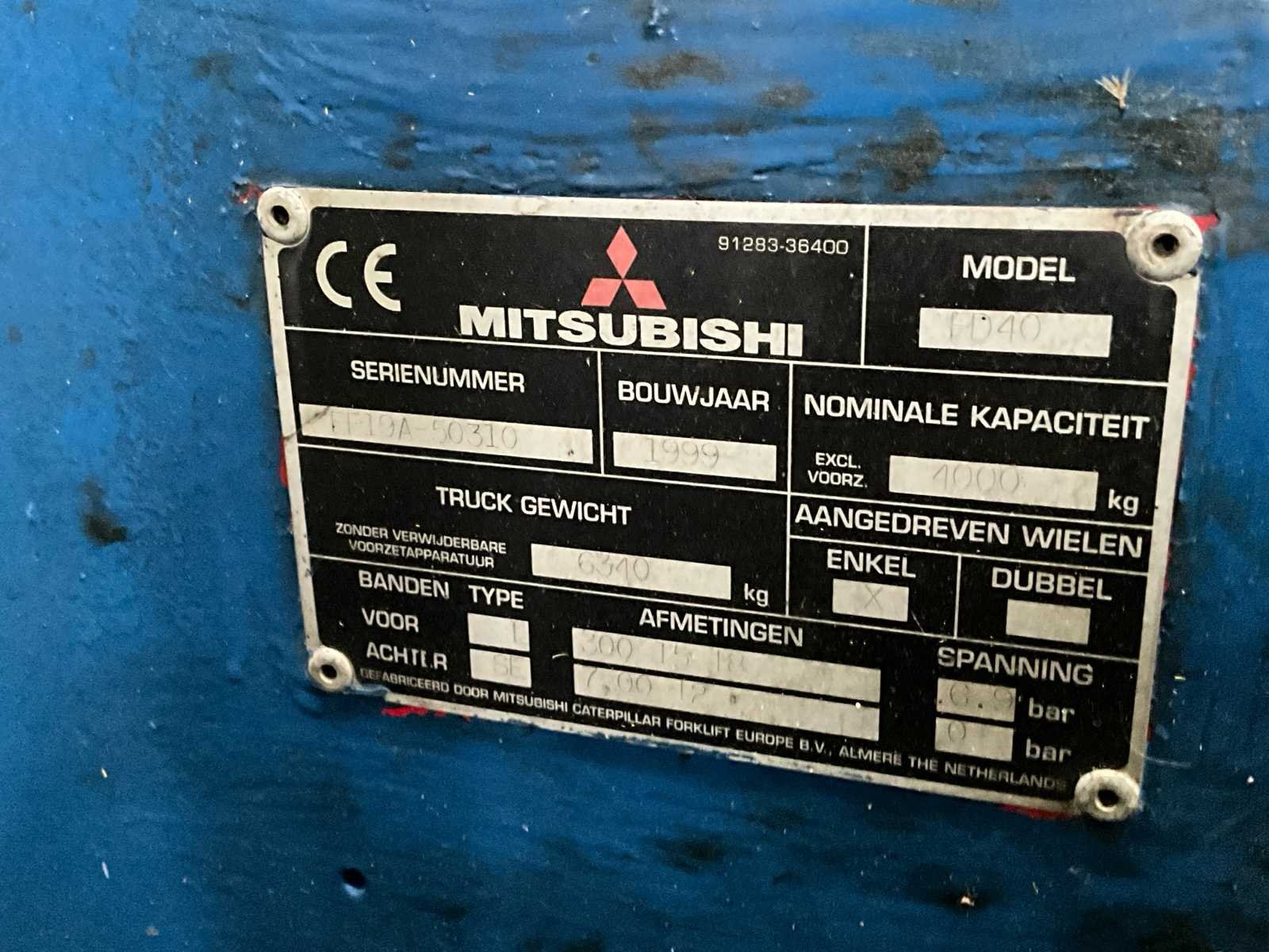 In werkende staat. No Merk: Mitsubishi Type: FD40 Bouwjaar: 1999 Brandstof: Diesel Eigen gewicht: 6030kg Hefvermogen: 4000kg Lepellengte: 1200mm Vol rubber banden: true Totale afmeting L: 4030mm Totale afmeting Breedte: 1040mm Totale afmeting Hoogte: 2250mm Diesel: true