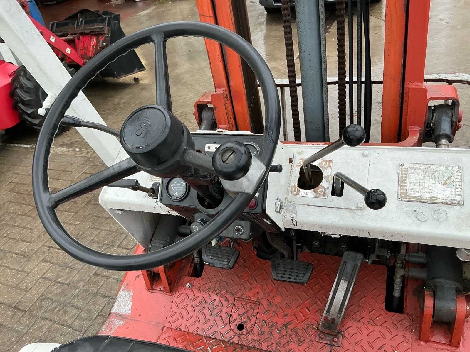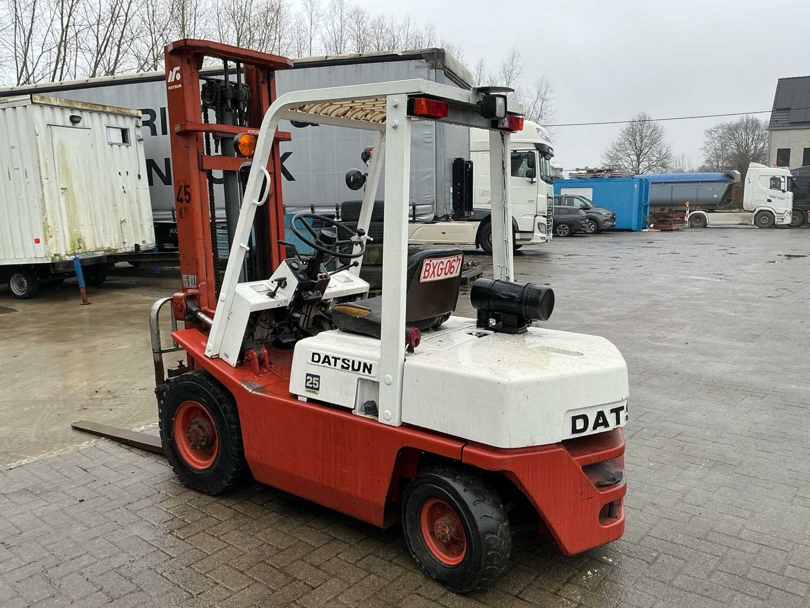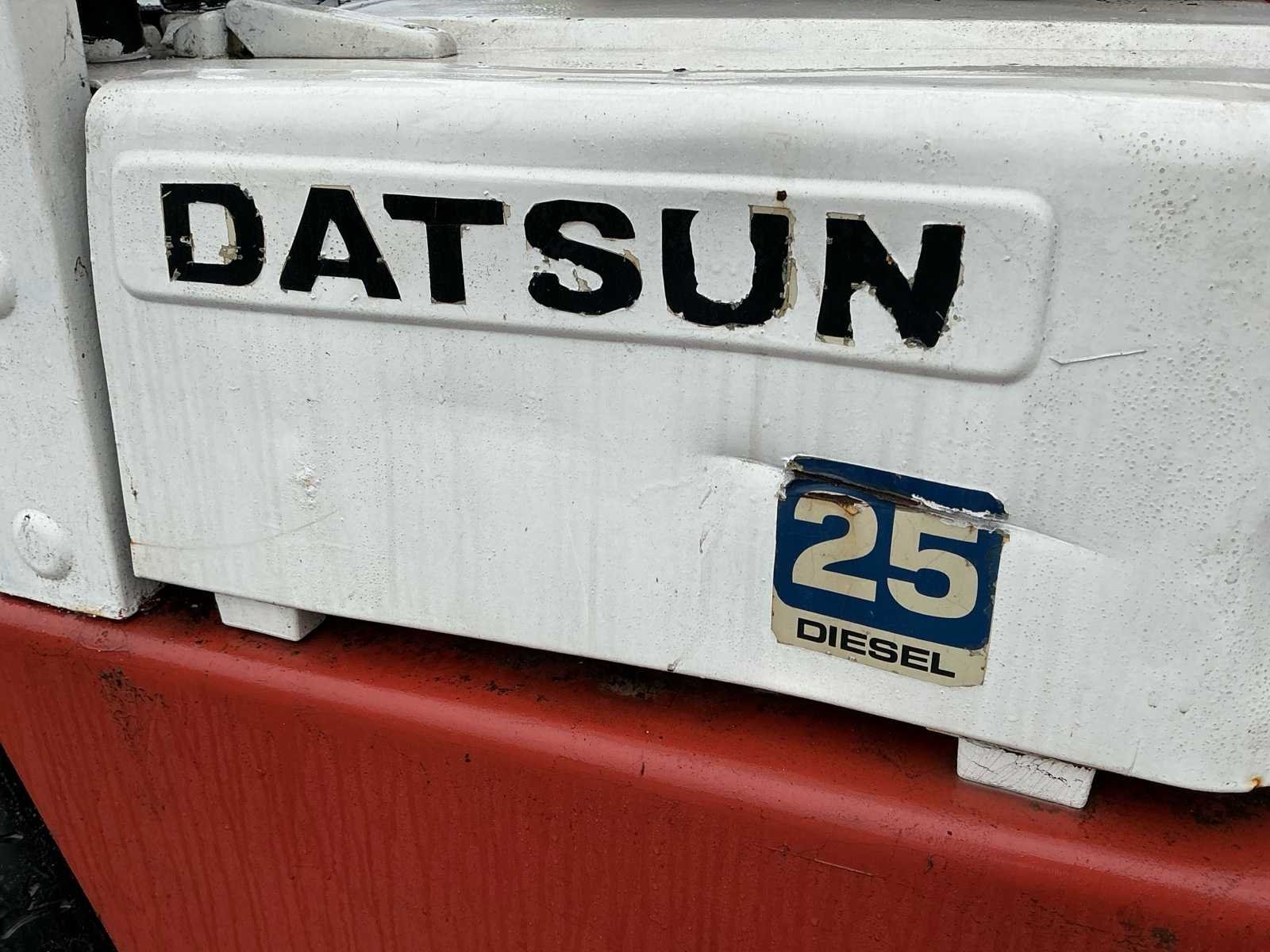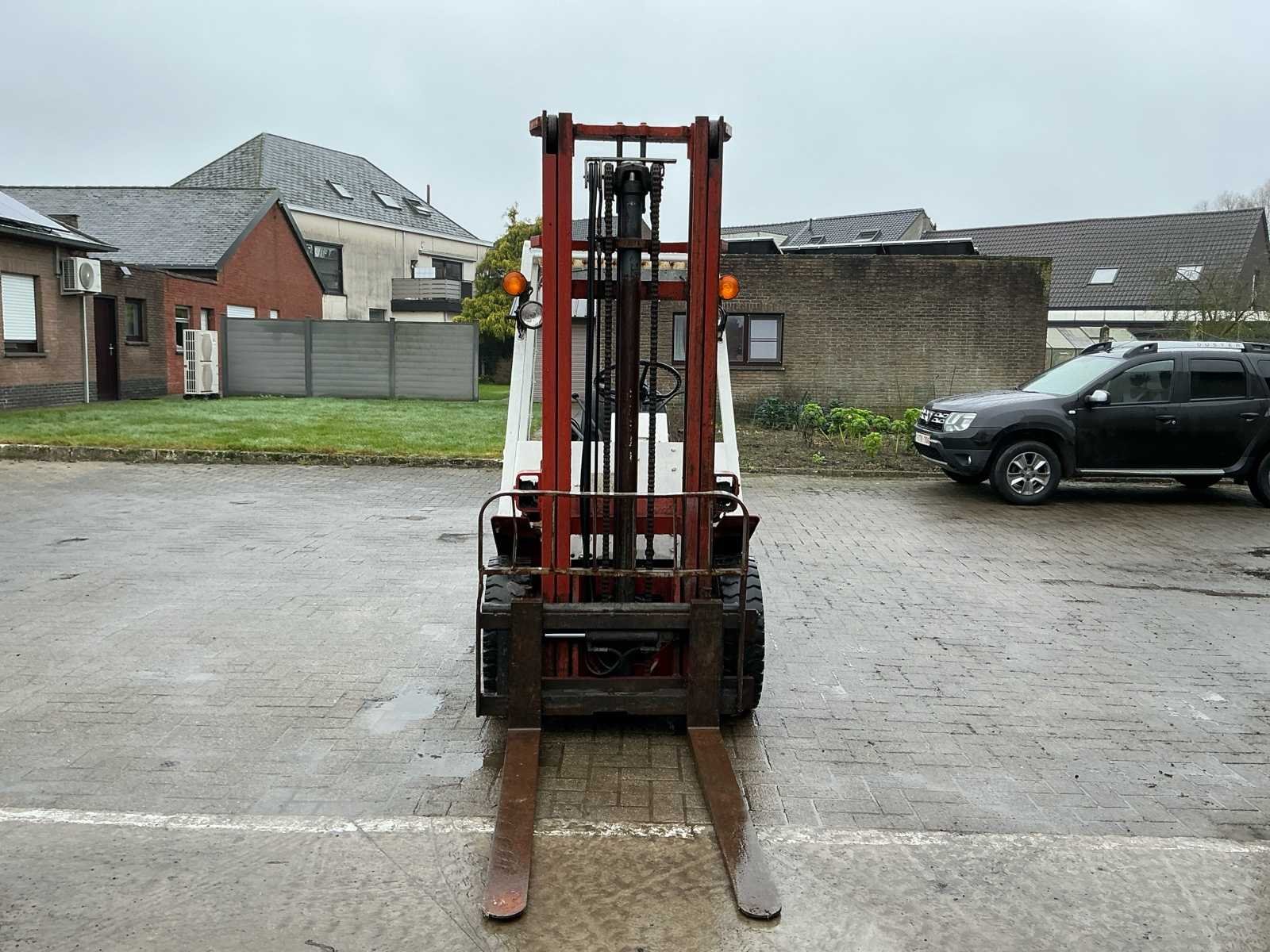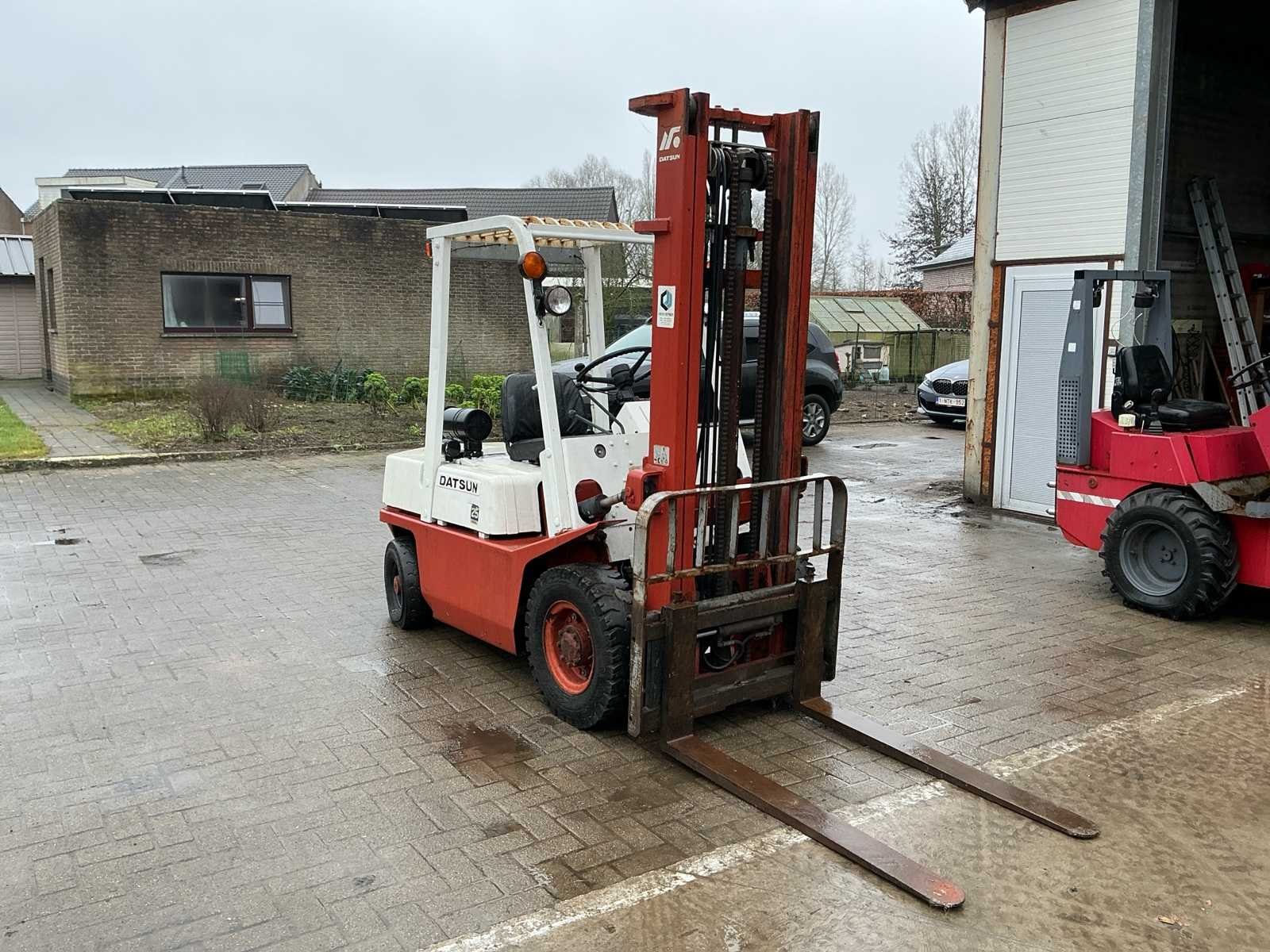 Opgelet: Stuurhuis lekt. Deze Datsun (Nissan) EF02 A25U dieselheftruck is een robuuste en betrouwbare machine met een hefvermogen van 2.500 kg en een maximale hefhoogte van 4.000 mm. De afgelezen urenstand bedraagt 3.781,3 uur. De heftruck is uitgerust met een duplex mast, vorken en een lastrek. Het eigen gewicht bedraagt 3.825 kg. Dankzij de dieselmotor is deze machine geschikt voor zwaarder werk en langdurige inzet, voornamelijk in buitentoepassingen of goed geventileerde magazijnen. De bediening is mechanisch met handgeschakelde transmissie. De machine vertoont normale gebruikssporen passend bij leeftijd en inzet. De bestuurdersstoel vertoont slijtage. Een degelijke en onderhoudsvriendelijke heftruck, geschikt voor magazijnwerk, logistiek of industriële toepassingen. No Merk: Datsun Type: EF02 Brandstof: Diesel Afgelezen urenstand: 3781 Duplex mast: true Luchtbanden: true Diesel: true