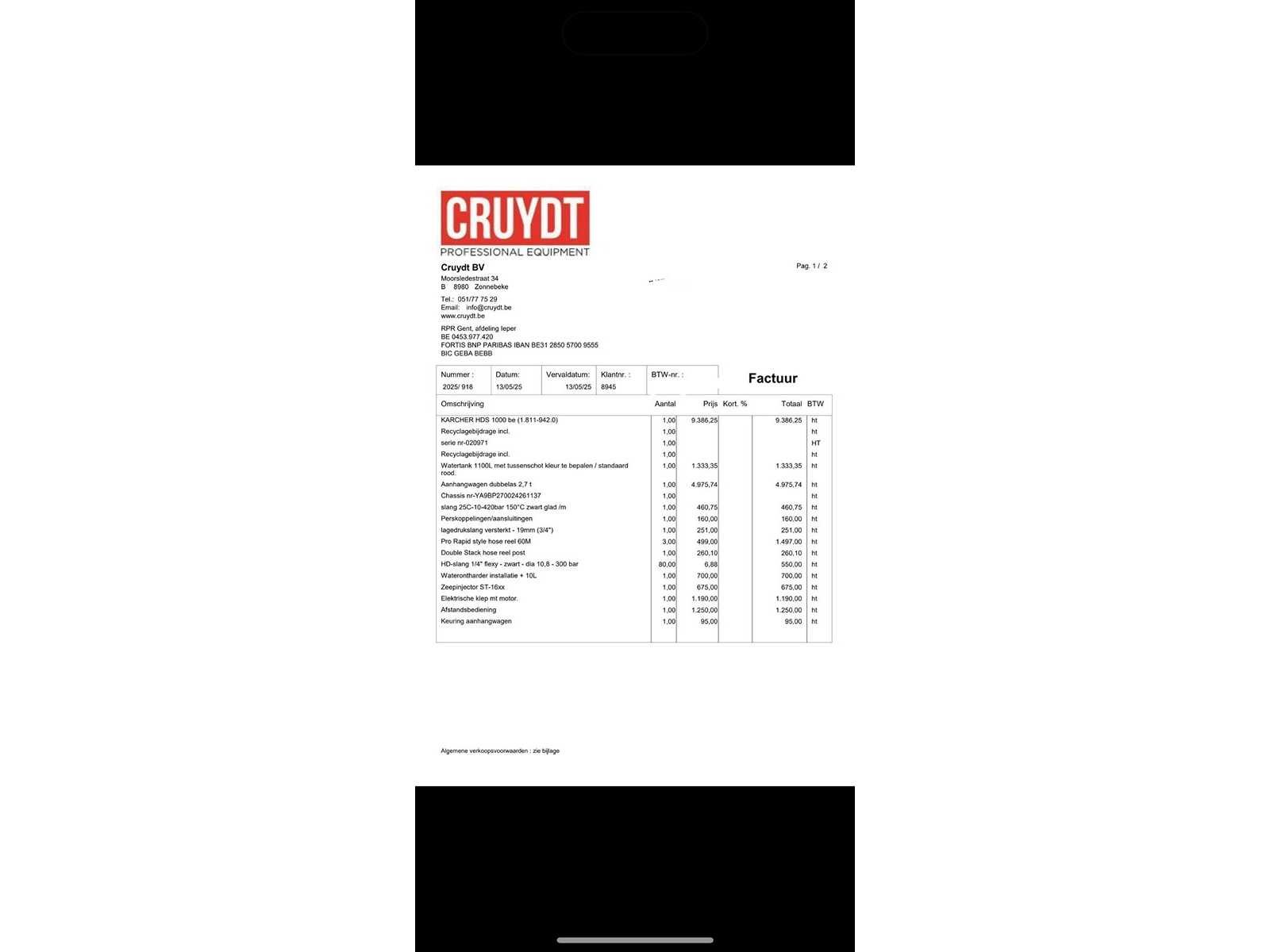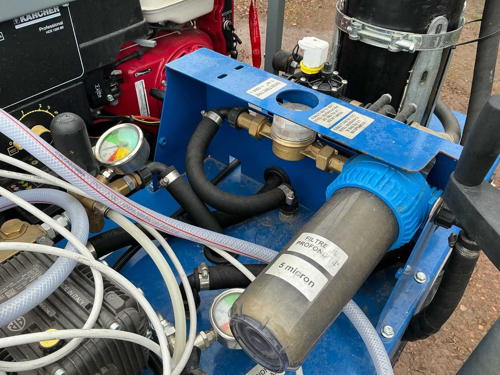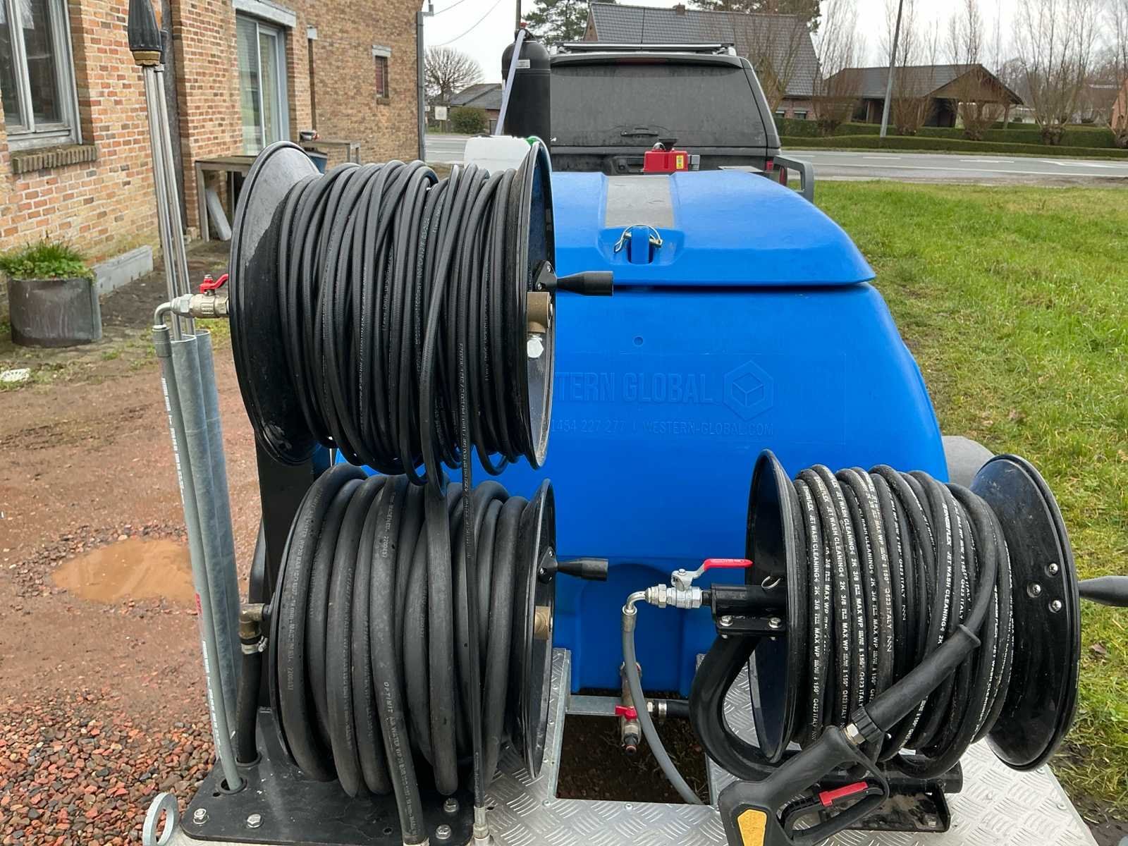 MTML 2700KG - 200 bar druk - Elektronische sluiting water aan/uit (zie rode bakje op foto) - Osmose systeem geeft 12,5L/min - Gaspel 80M voor Drone - 2x 30M Gaspel aanvul - 1100L vat - Warm water tot 90° C Nee Merk: Vandaele