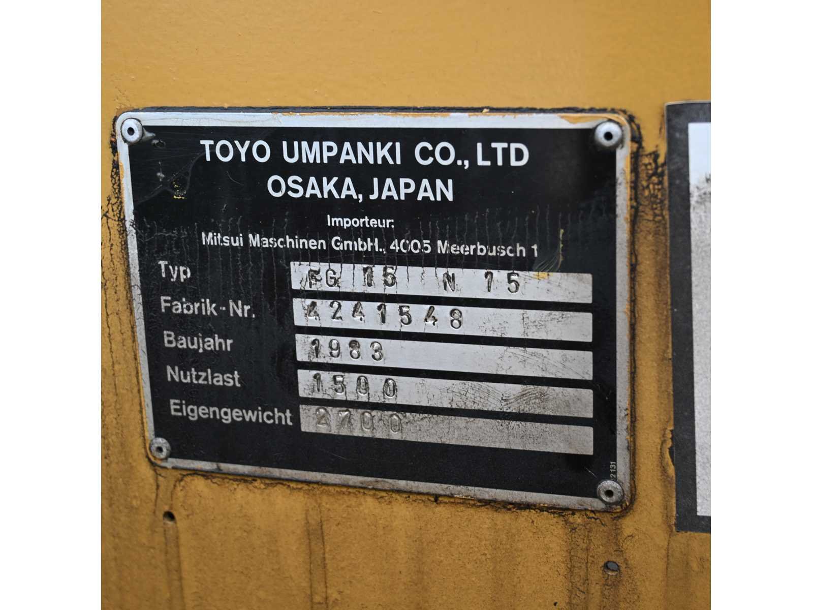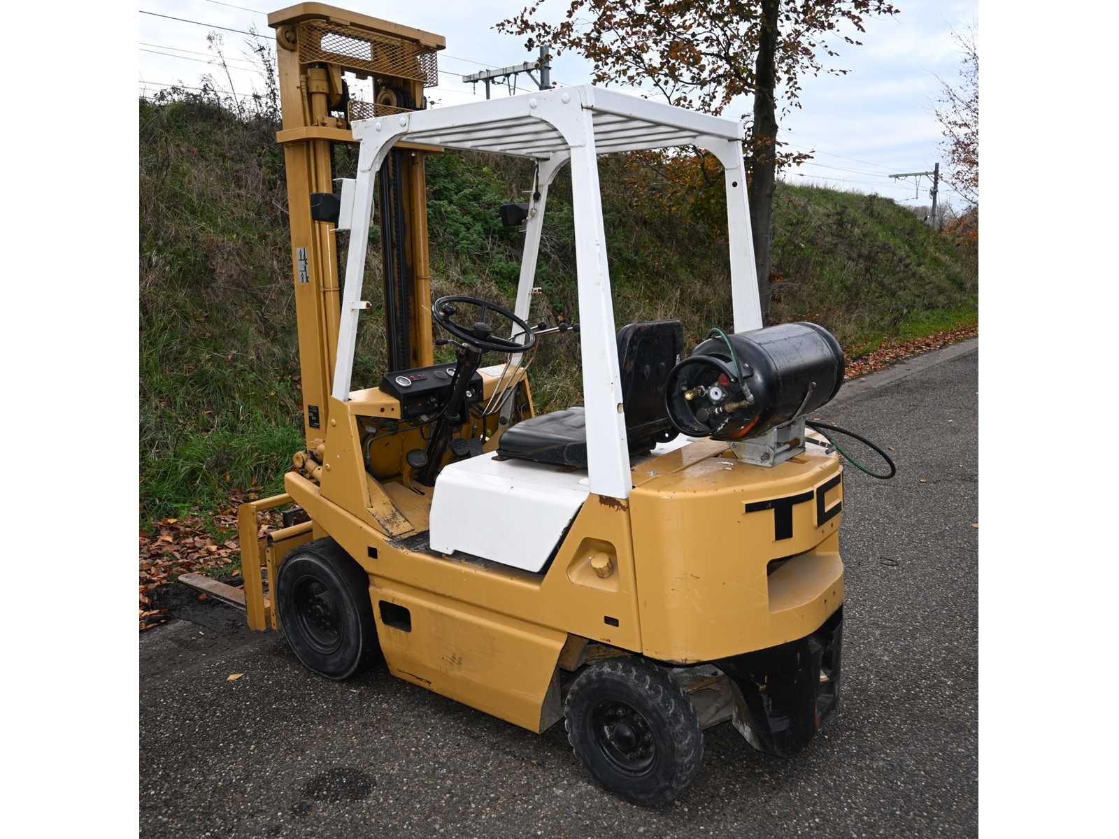 No Merk: TCM Type: FG15 Bouwjaar: 1983 Serienummer: 4241548 Brandstof: LPG Aantal wielen: 4 Afgelezen urenstand: 6111 Side-shift: true Eigen gewicht: 2700kg Hefvermogen: 1500kg Hefhoogte: 4000mm Luchtbanden: false Minimale doorrijhoogte: 2545mm LPG: true Leveringsvoorwaarden: Gratis op vrachtwagen