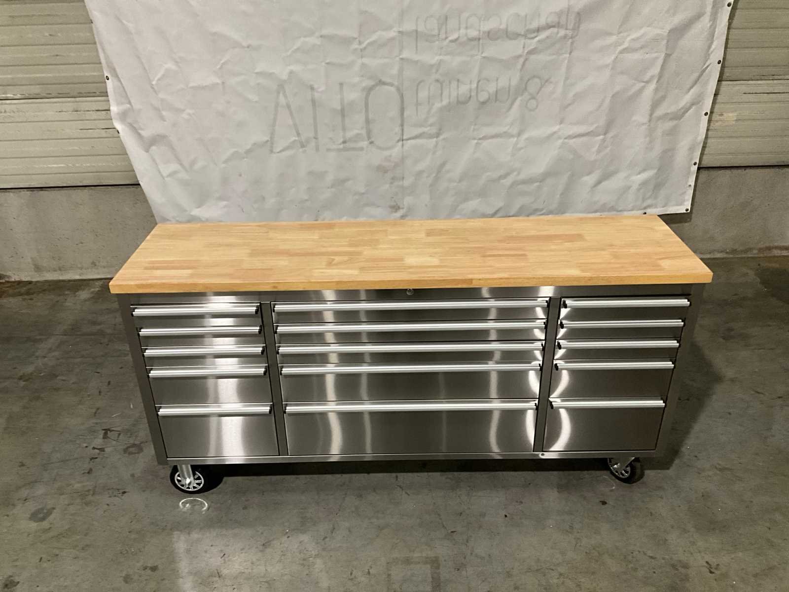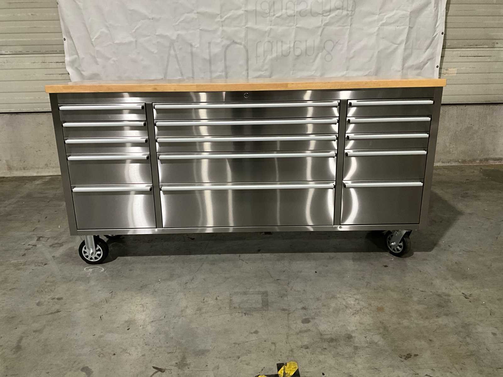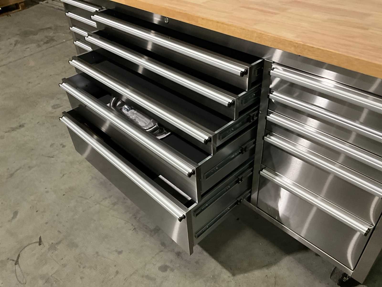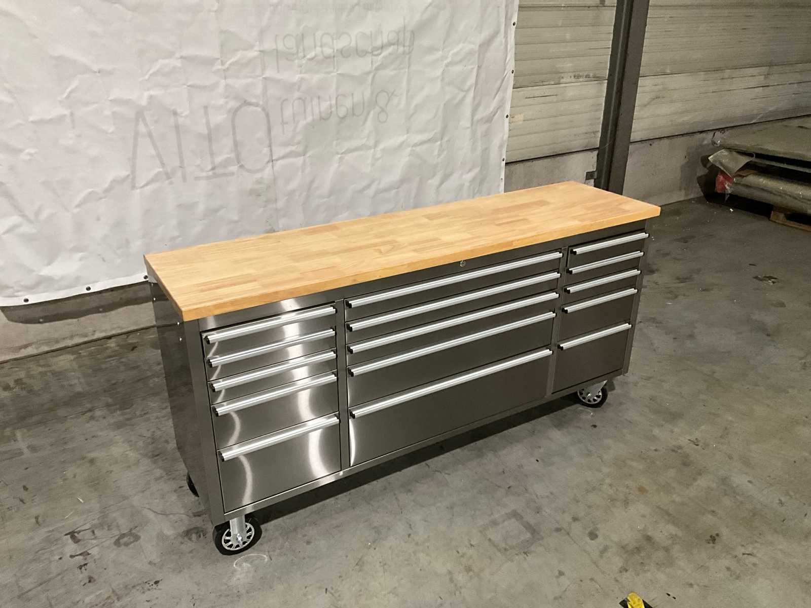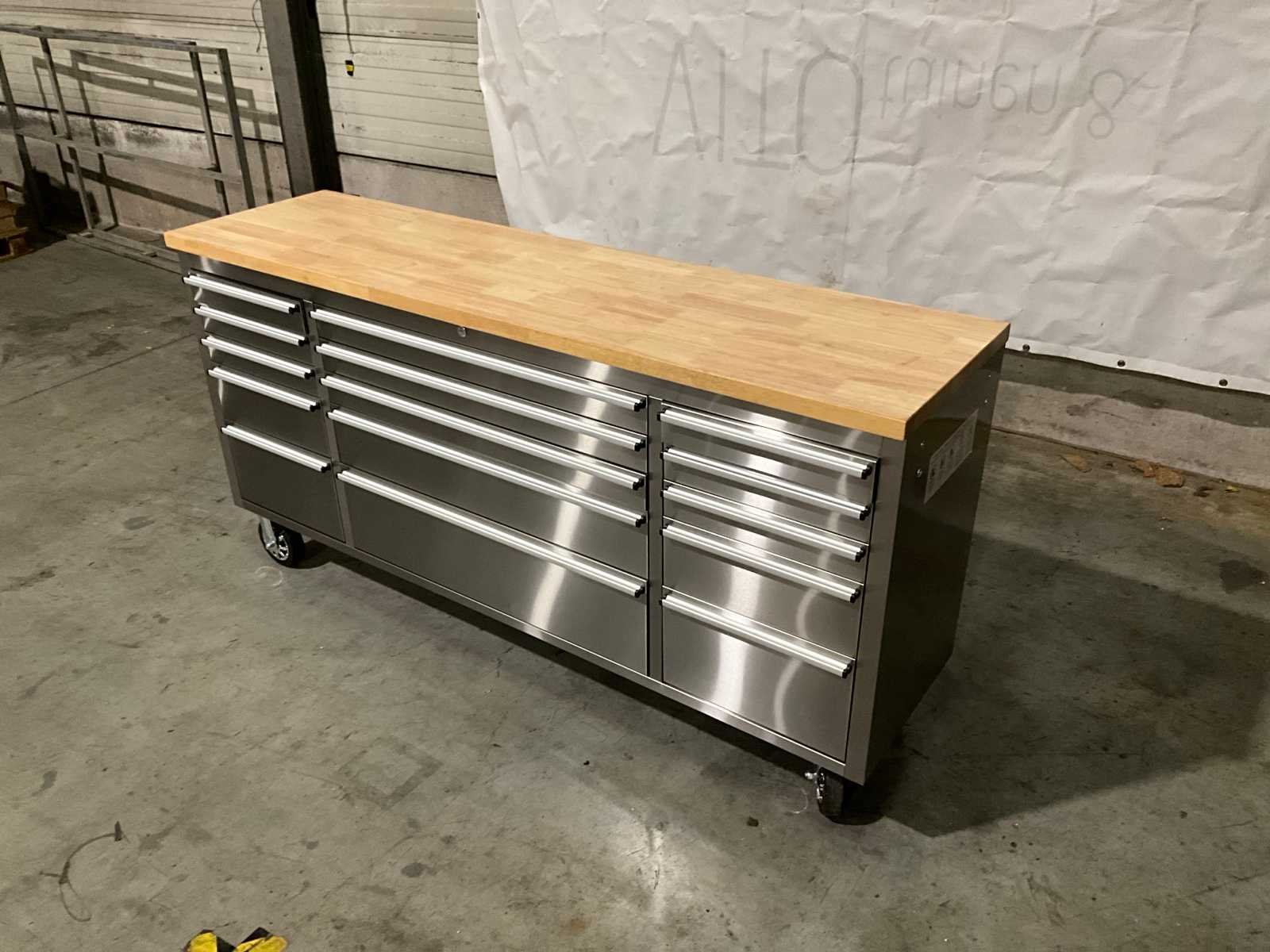 RVS gereedschapwagen - 2 wznkwielen en 2 vaste wielen - rubberwood werkblad - 6 lades : 40x40x8 cm - 2 lades : 40x40x15,5 cm - 2 lades 40x40x23,5 - 3 lades : 86x40x8 cm - 1 lade : 86x4015,5 - 1 lade 86x40x23,5 - slot inbegrepen - 2 handvaten inbegrepen - laadmogelijkheden aanwezig Nee Merk: Optimus Lengte: 184cm Breedte: 49cm Hoogte: 95cm Materiaal: RVS