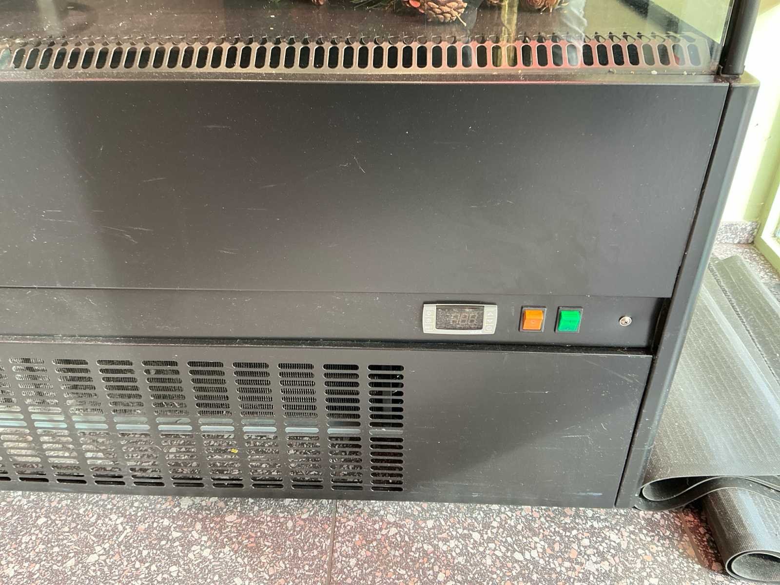 Professionele Mafirol wandkoelvitrine in zwarte uitvoering, geschikt voor gebruik in delicatessenzaken, traiteurs, slagerijen, bakkerijen of speciaalzaken. Dankzij het open front en de glazen zijpanelen worden producten optimaal gepresenteerd en blijft de zichtbaarheid maximaal voor klanten. De vitrine beschikt over meerdere verstelbare legniveaus, waardoor u de indeling flexibel kan aanpassen aan uw assortiment. De geïntegreerde ventilatiekoeling zorgt voor een gelijkmatige temperatuurverdeling over alle schappen. De temperatuur is regelbaar via een digitale thermostaat. De onderbouw bevat de geïntegreerde koelunit en ventilatie, wat zorgt voor een compacte en zelfstandige installatie zonder externe motorunit. De zwarte afwerking geeft een moderne en professionele uitstraling die in vrijwel elk interieur past. Geschikt voor presentatie van koude producten zoals kazen, charcuterie, desserts, dranken of andere gekoelde voedingswaren. Toestel vertoont normale gebruikssporen passend bij professioneel gebruik. No Merk: Mafirol