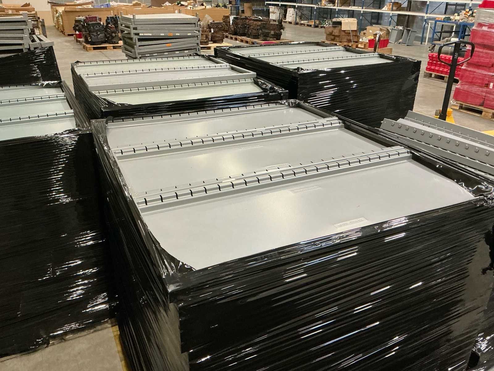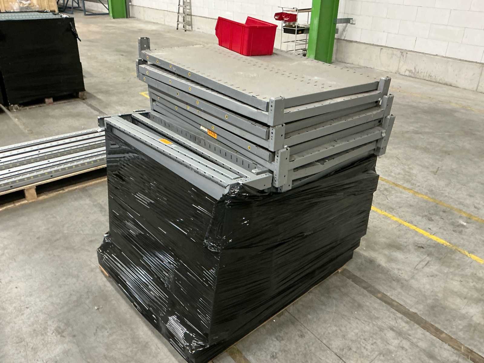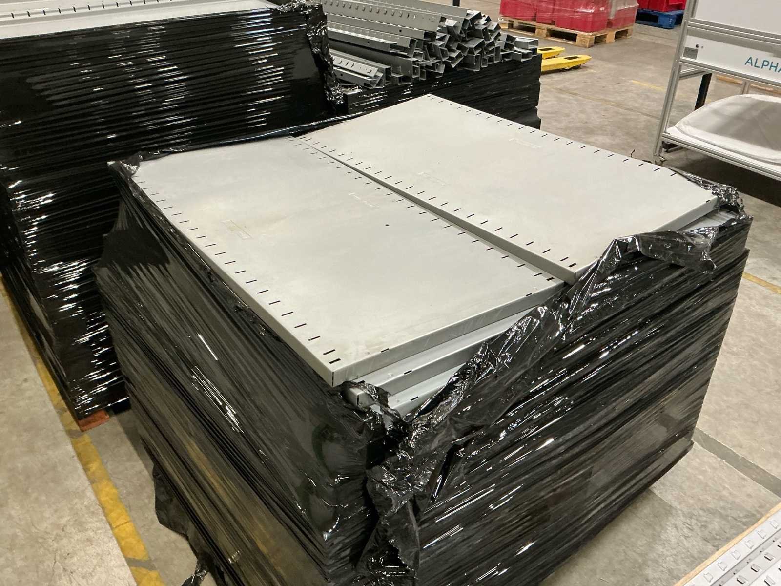 Planken: 468 stuks. Opstaande kant op rek: 56 stuks. Onder en bovenstuk: 70 stuks. Staander: 37 x breed, 82 x small. No Merk: Schaeffer