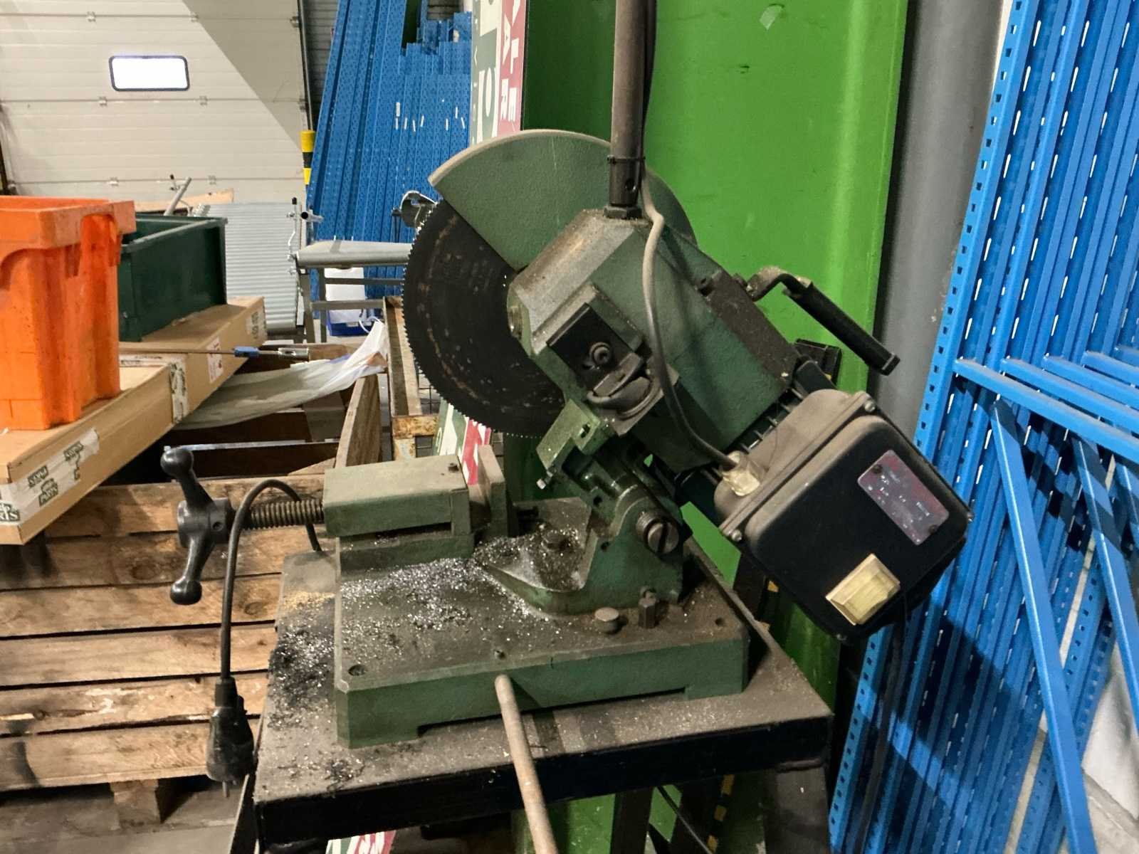 Industriële metaalafkortzaag (koudzaag) met cirkelzaagblad, geschikt voor het nauwkeurig afkorten van stalen buizen, kokers en profielen. Uitgerust met krachtige elektromotor (0,75 kW / 1 PK), verstelbare zaagkop en geïntegreerde bankschroef voor stabiele materiaalfixatie. Geplaatst op stevig stalen onderstel. Ideaal voor werkplaats- en magazijntoepassingen. No
