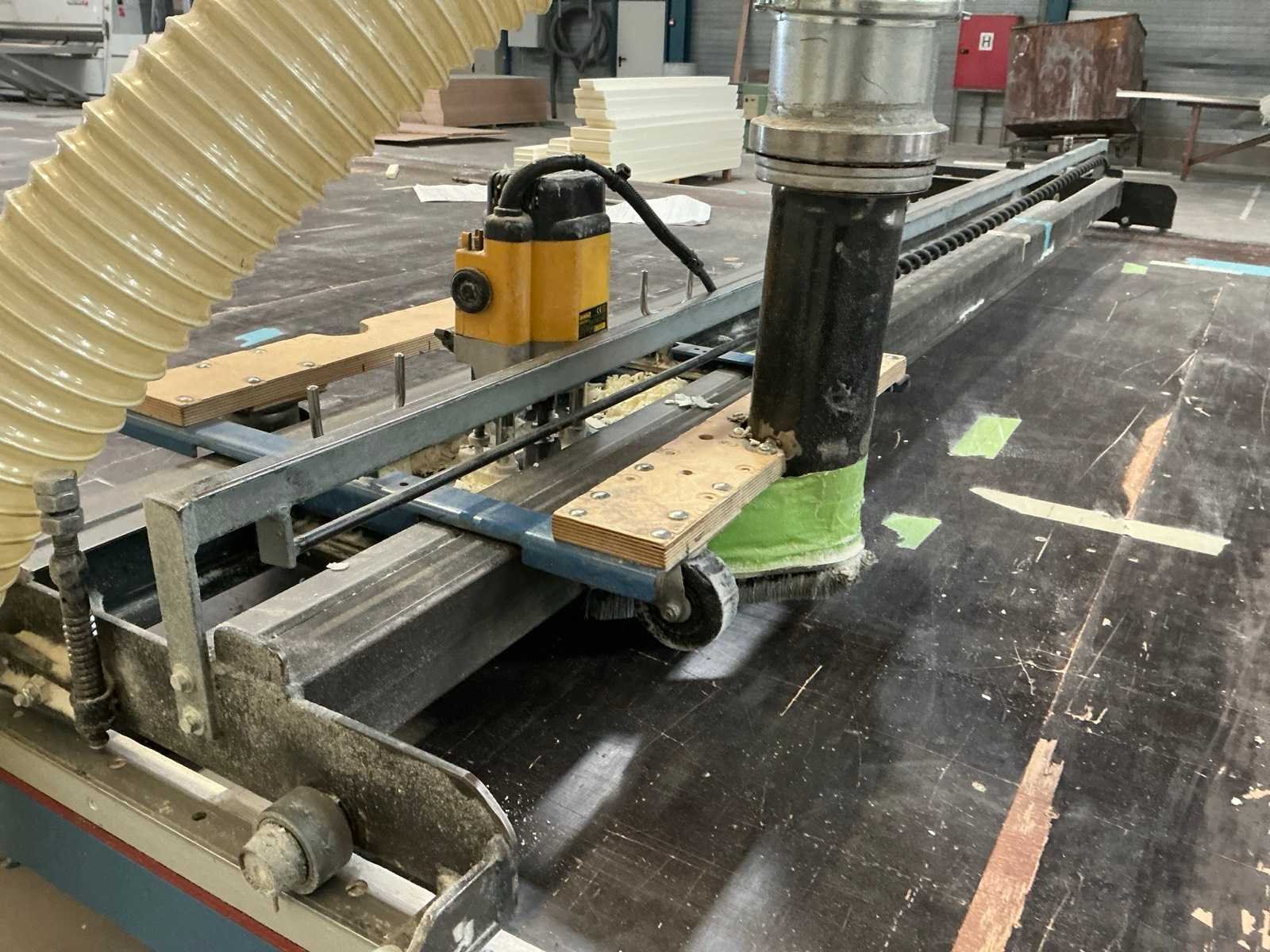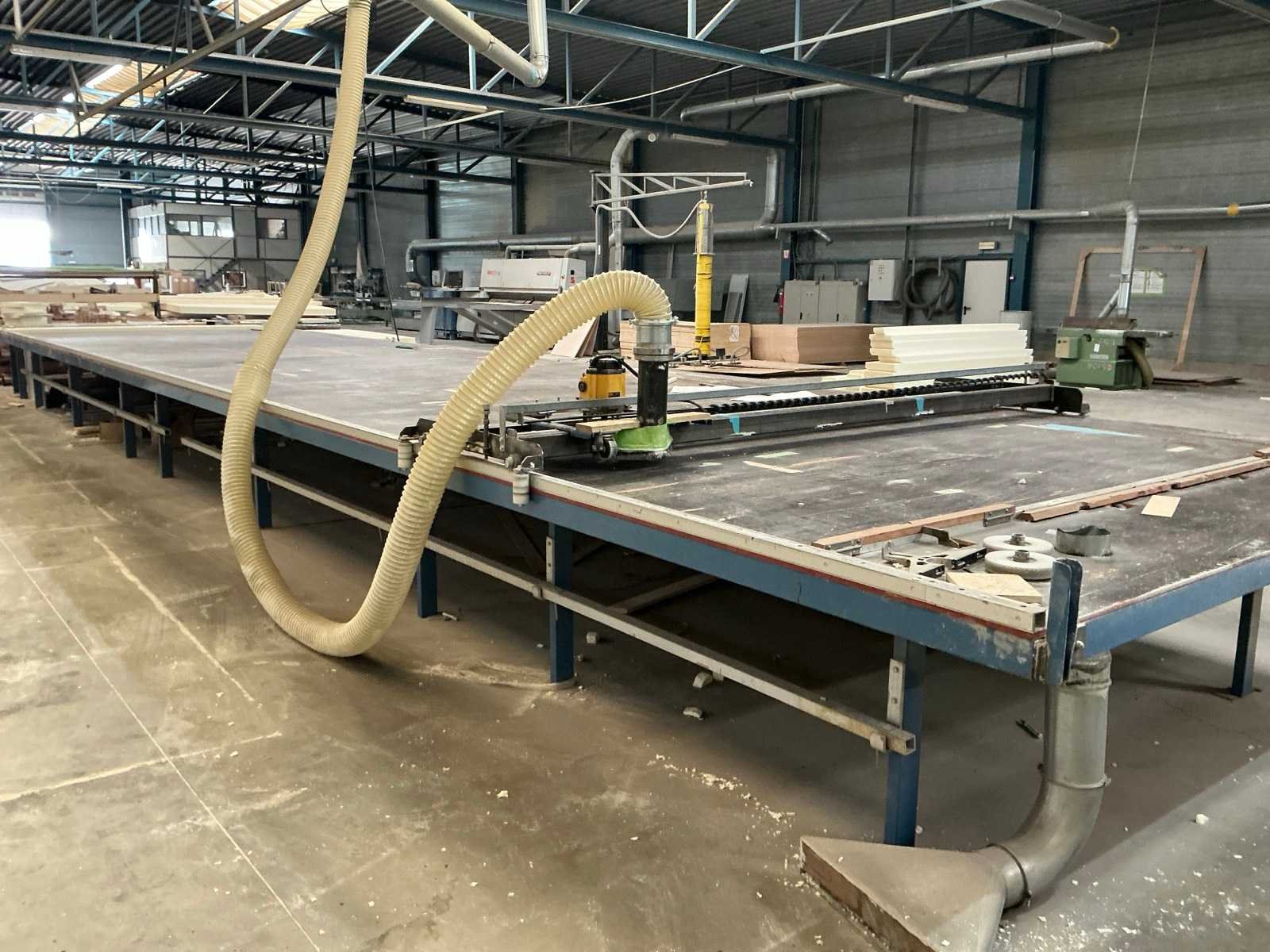 Voorzien van houten werkblad en metalen onderstel/ uitgerust met Dewalt type DW625E bovenfrees/ bovenfrees gemonteerd op verrijdbare rail/ flexibele buis naar stofafzuiging inbegrepen Nee Breedte: 3200mm Lengte: 14700mm Hoogte: 1250mm