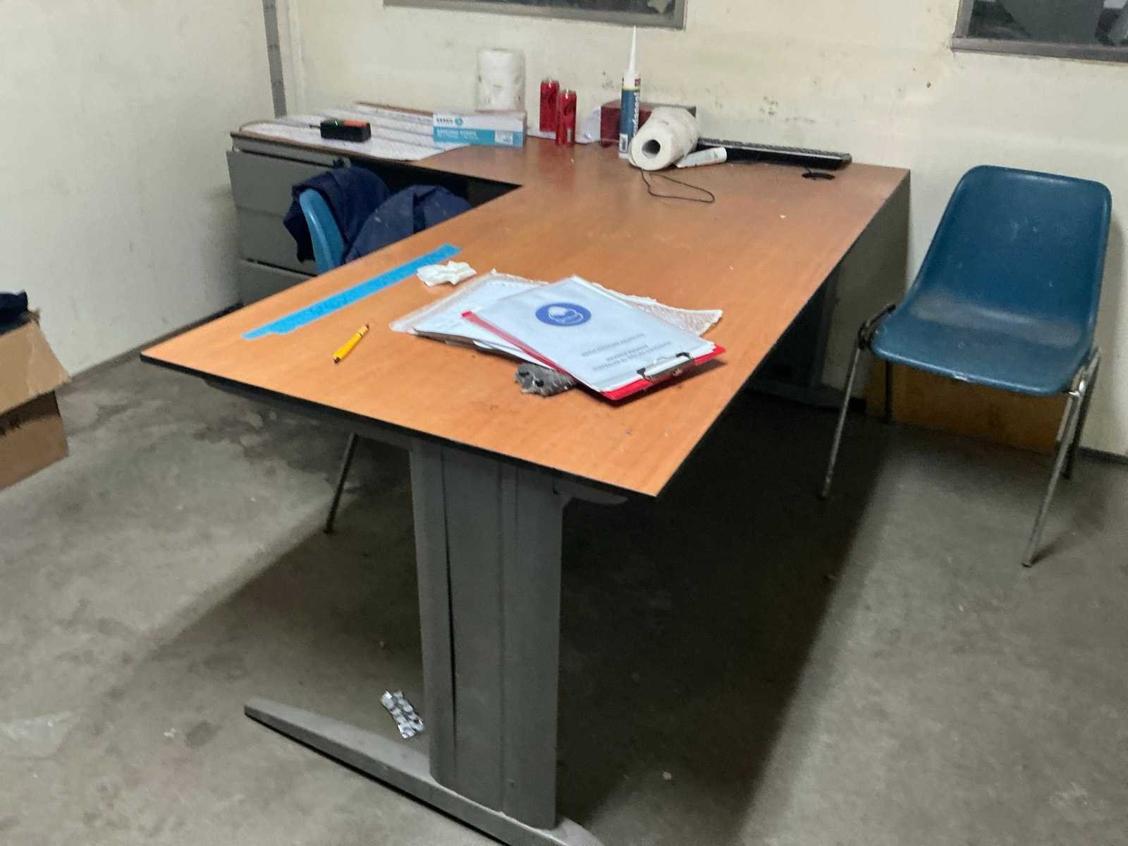 Bestaande uit: bureautafel, 3 x stoel, 2-deurs metalen kast, Magazijnstelling met inbegrip van onderhande diverse elektrokabels, koelkast Nee