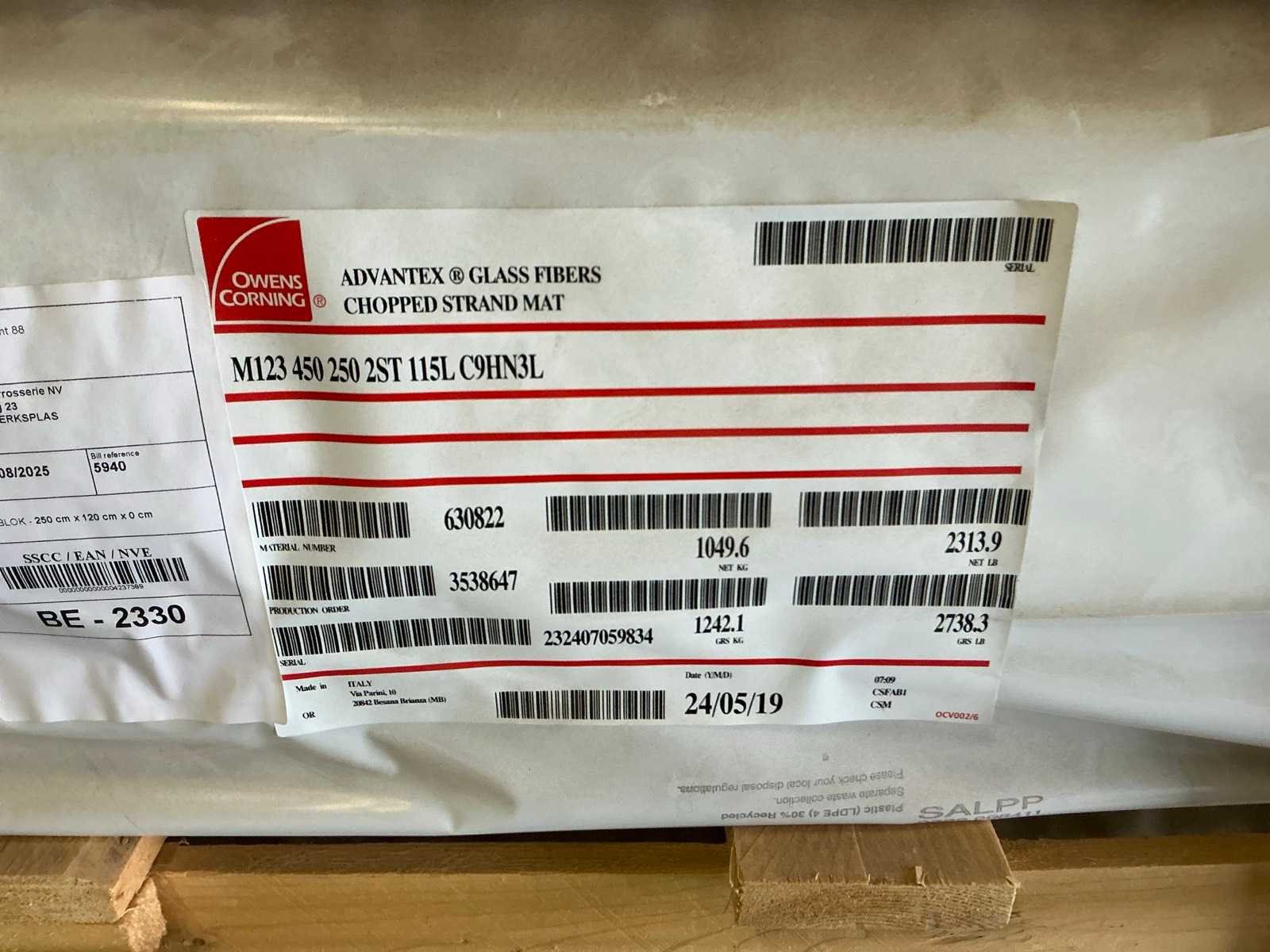 9 rollen in houten pallet krat. Lengte per rol circa 115 lopende meter. Nee Merk: Owens Corning Gewicht: 1242kg Type: M123 450 250 2ST Afmeting b: 2500mm