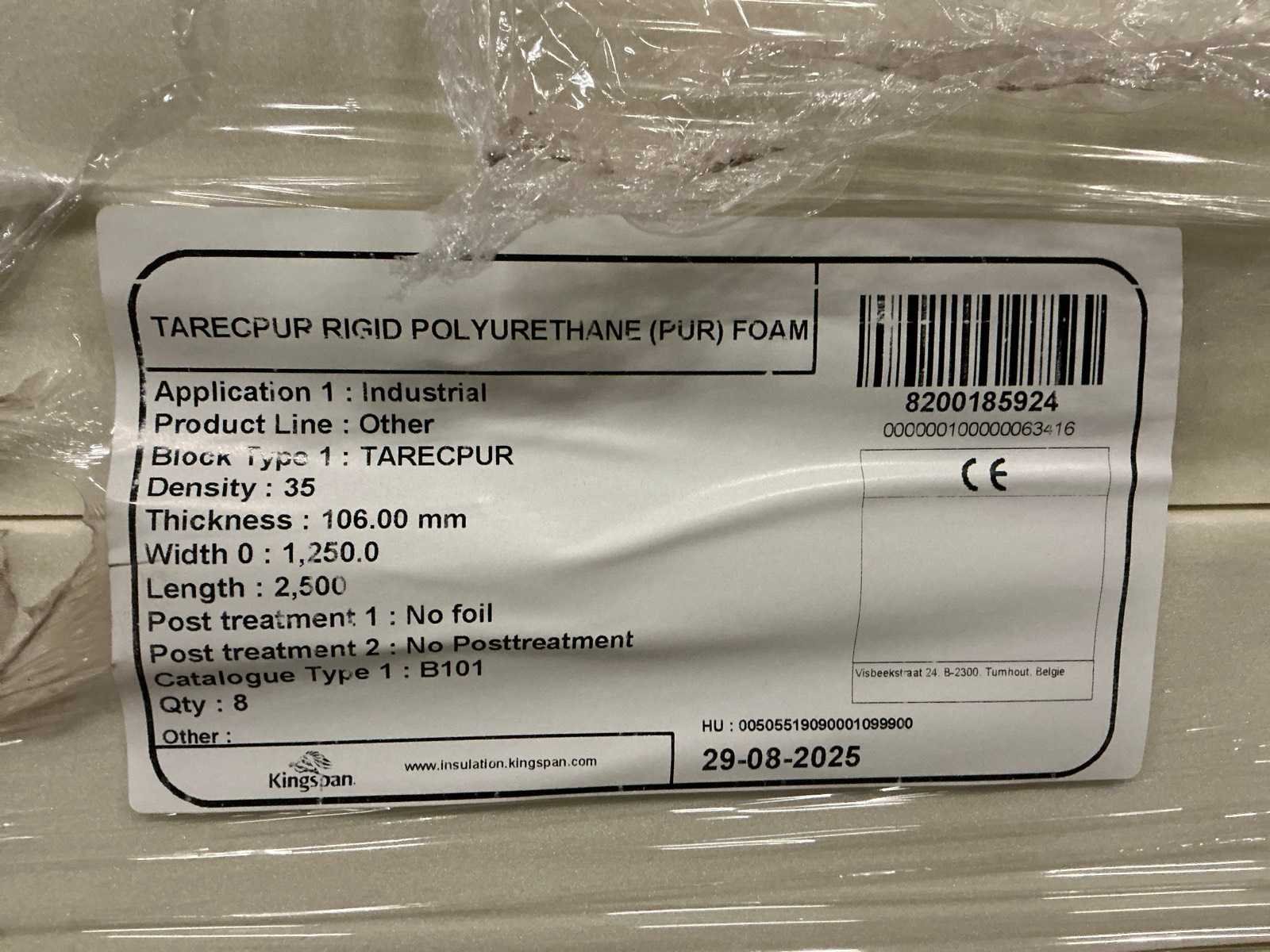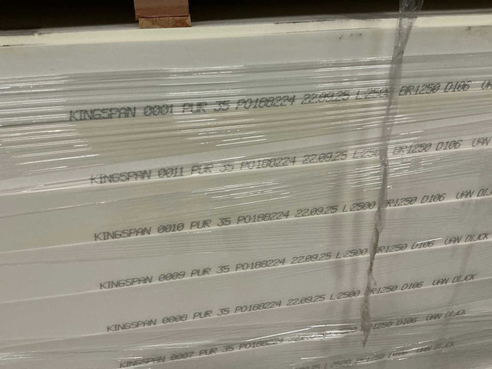 Gestapeld op 9 pallets. Nee Merk: Kingspan Model: PUR 35 Lengte: 250cm Breedte: 125cm Hoogte: 10.6cm