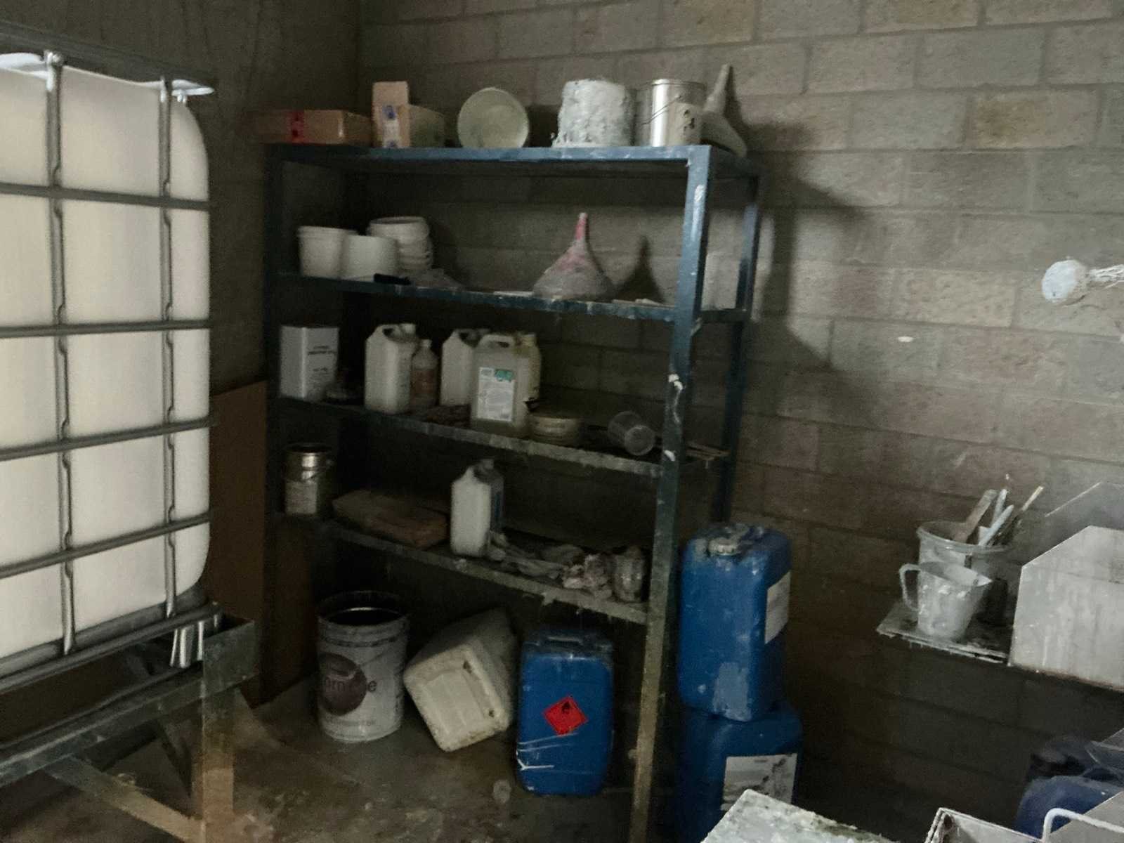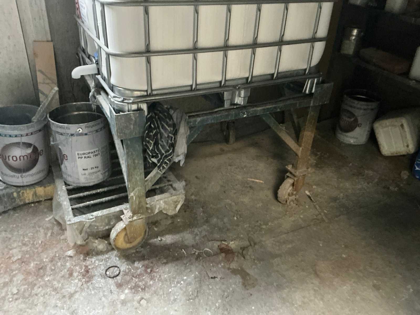 Bestaande uit: IBC container op mobiel onderstel, diverse bidons en verfresten, profielstalen rek No