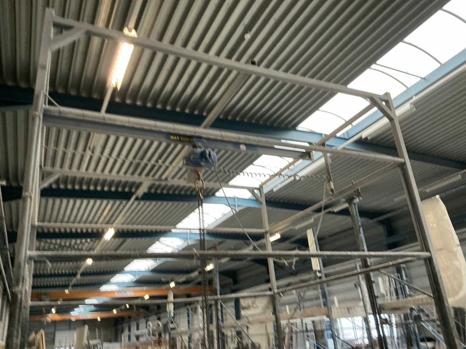 Profiel stalen verrijdbaar frame met verplaatsbare (circa 3400 mm) Kettingtakel Abus. No Merk: Abus Hijsvermogen: 500kg Totale afmeting L: 350mm Totale afmeting Breedte: 3000mm Totale afmeting Hoogte: 4250mm