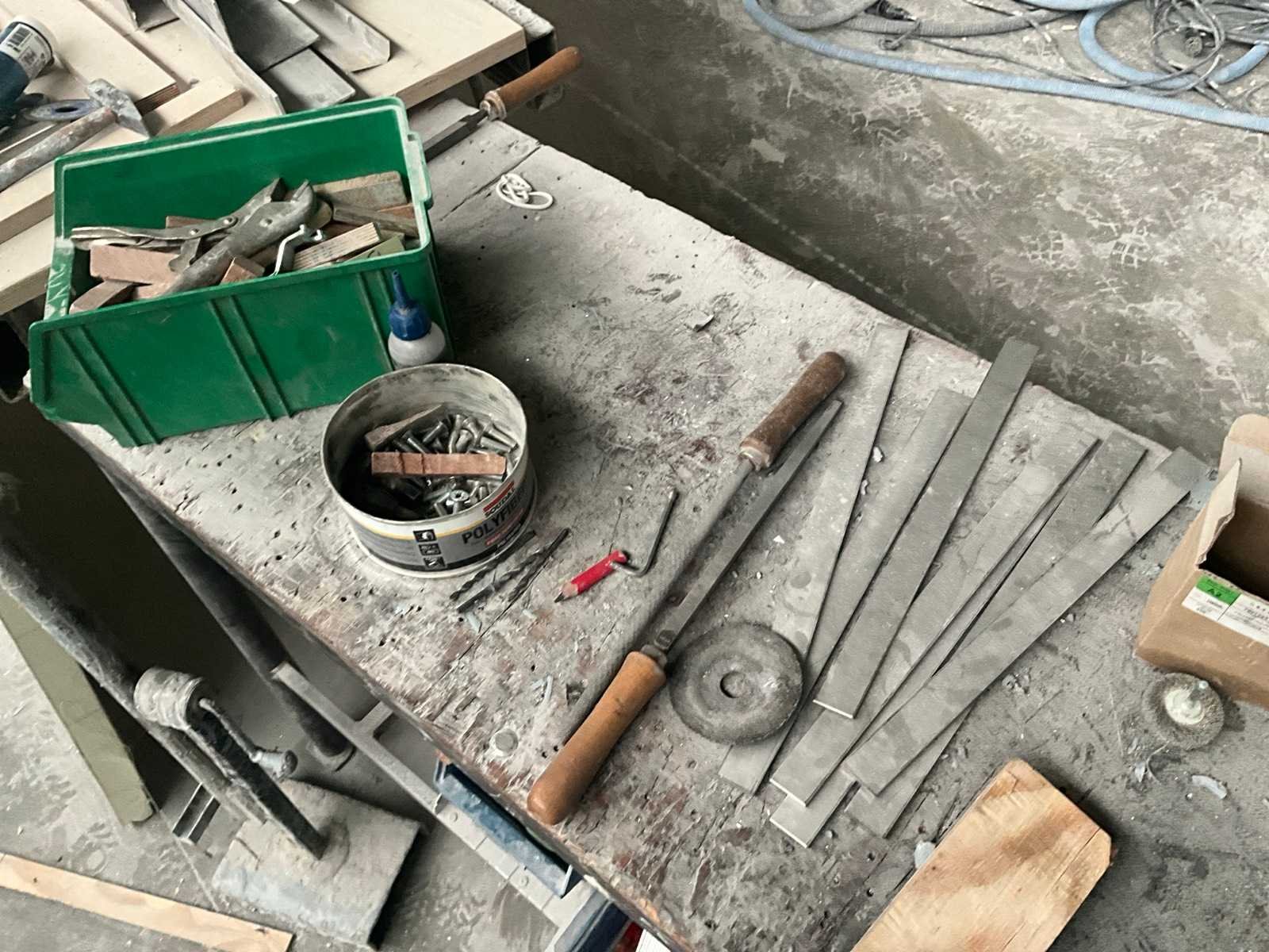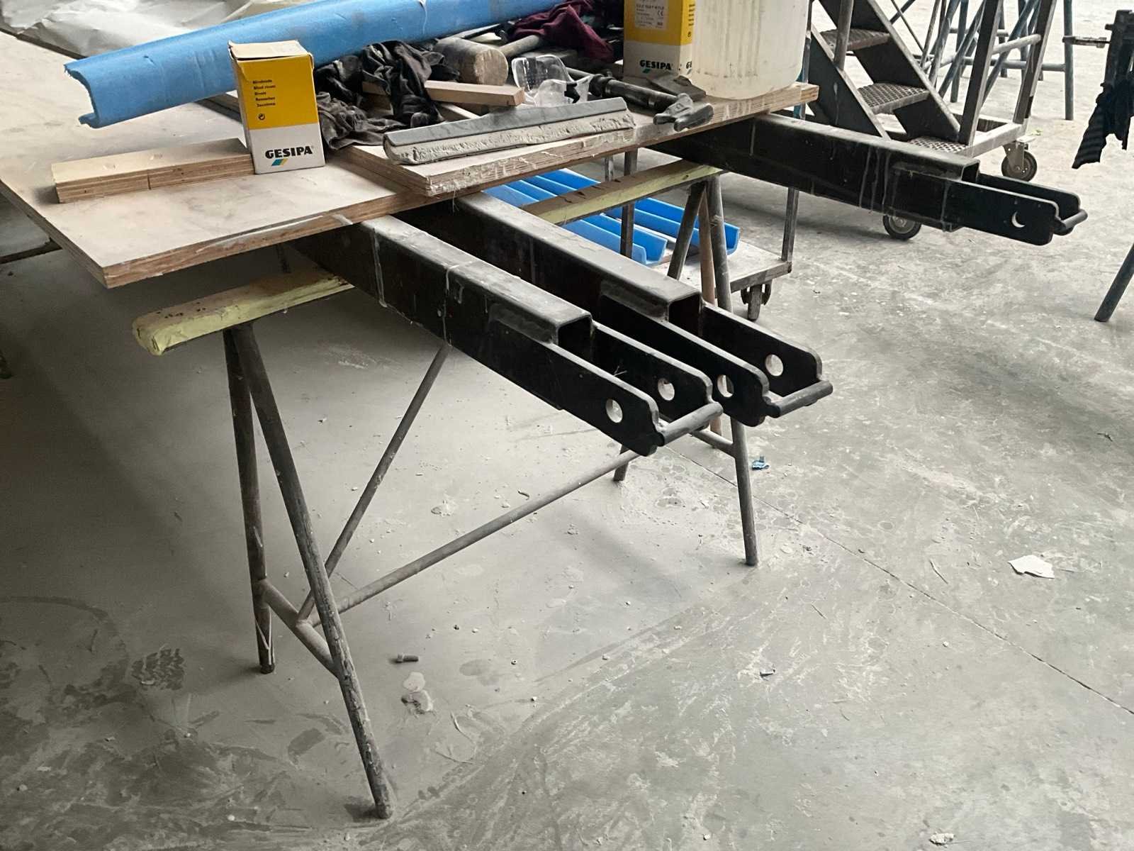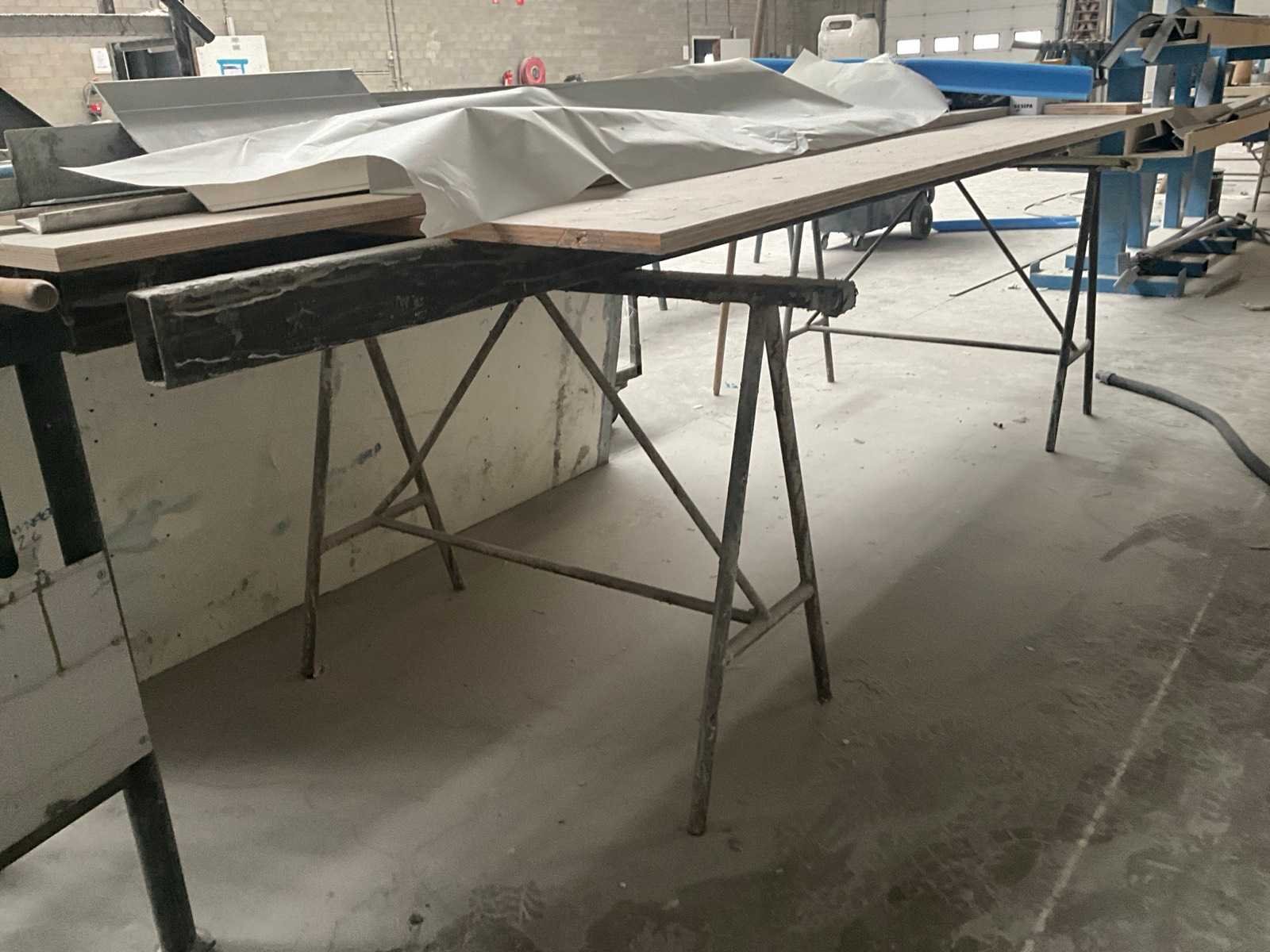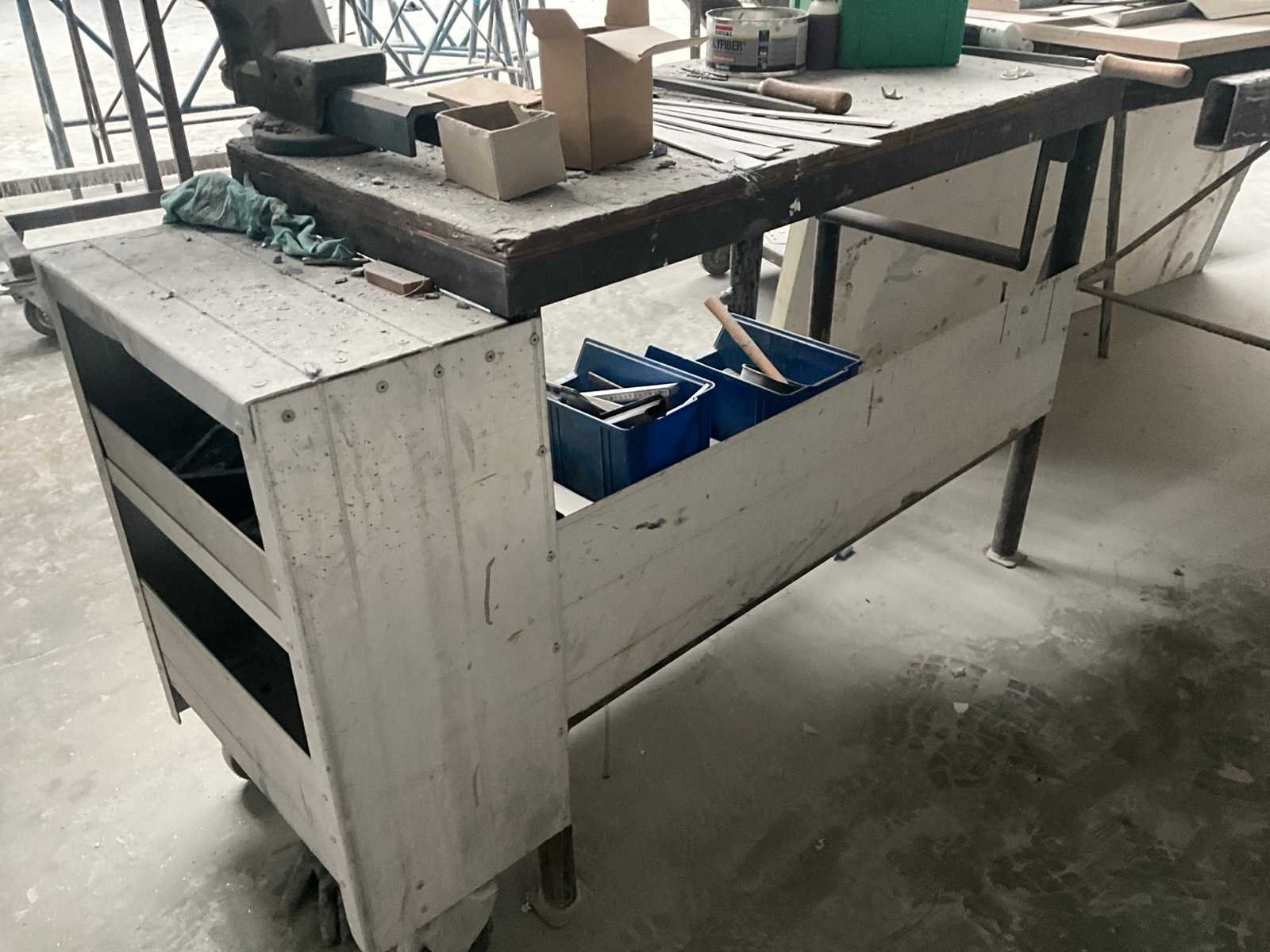 Bestaande uit: Werkbank voorzien van bankschroef, compleet met inhoud. Transportkar 185 x 64 x 100cm. 2 metalen schragen voorzien van houten bovenblad en 3 metalen balken lengte circa 350cm Nee Breedte: 550mm Lengte: 1500mm Hoogte: 900mm