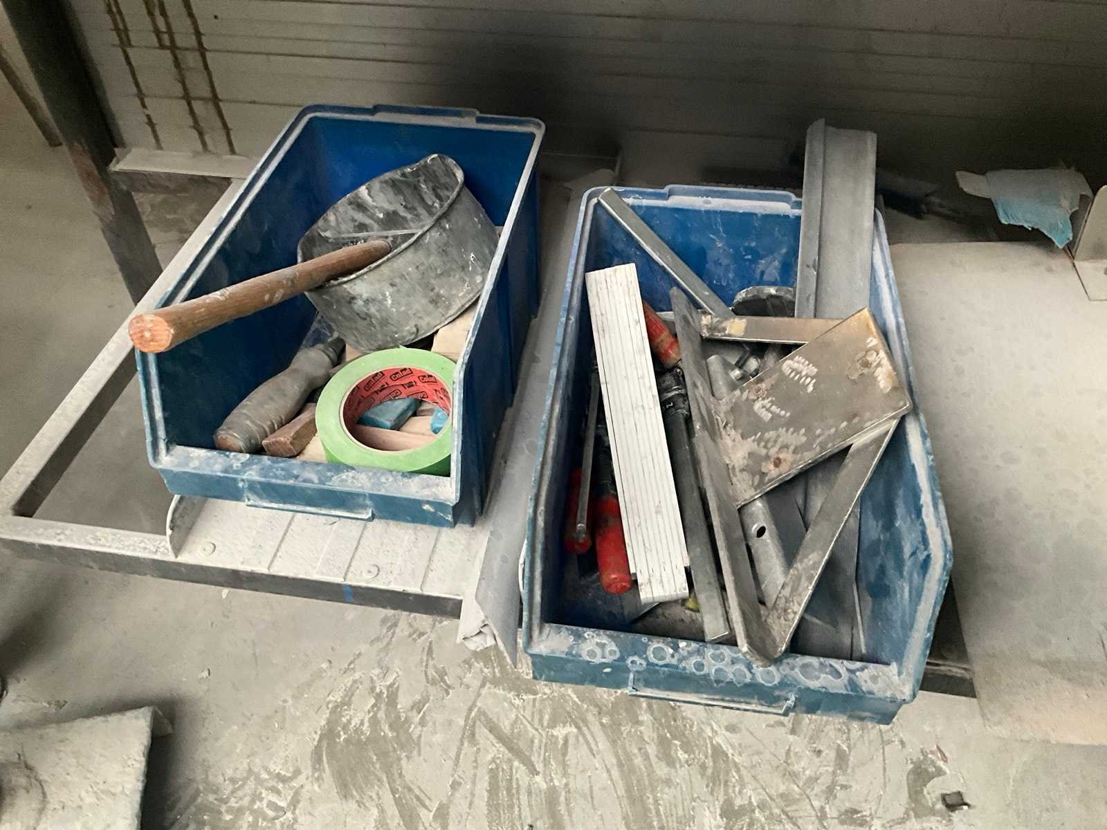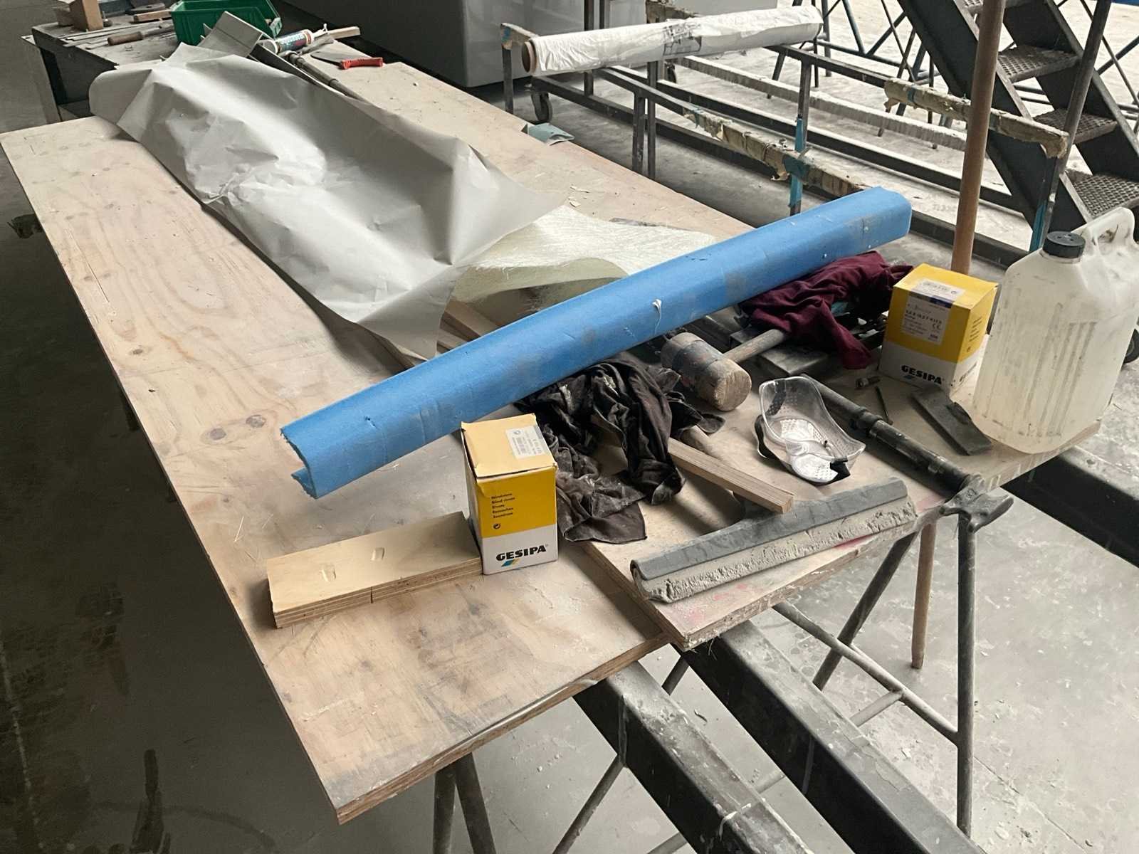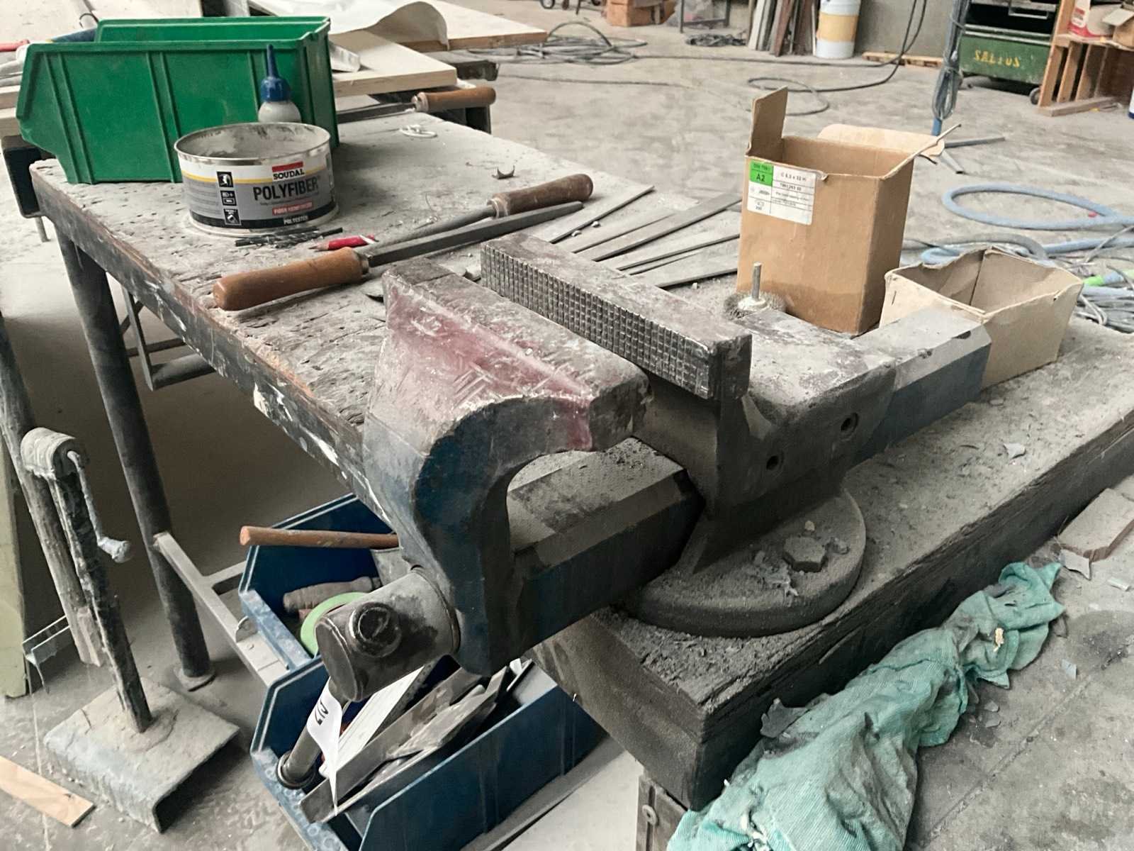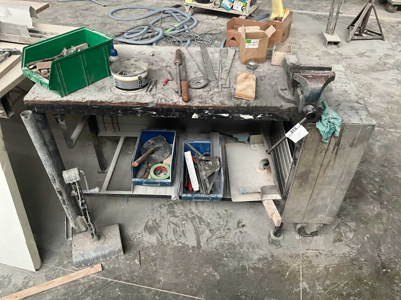 Bestaande uit: Werkbank voorzien van bankschroef, compleet met inhoud. Transportkar 185 x 64 x 100cm. 2 metalen schragen voorzien van houten bovenblad en 3 metalen balken lengte circa 350cm Nee Breedte: 550mm Lengte: 1500mm Hoogte: 900mm