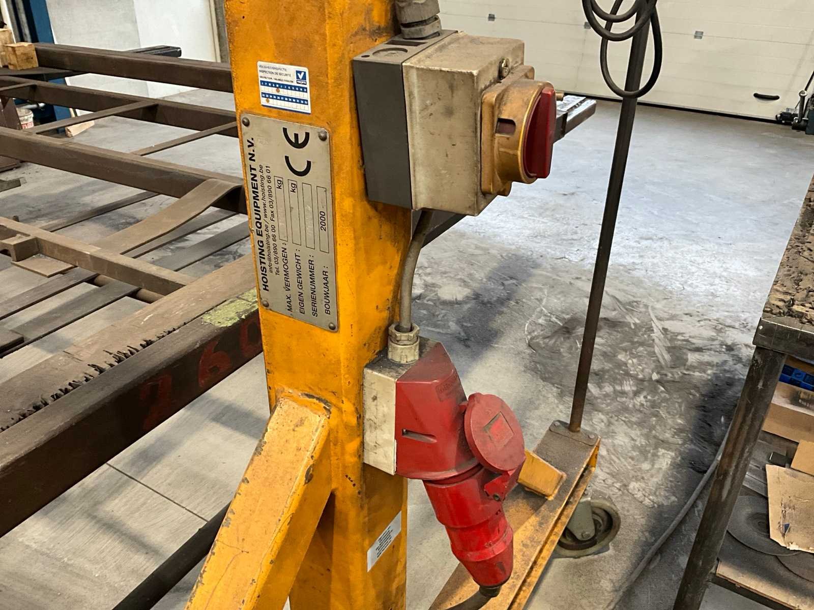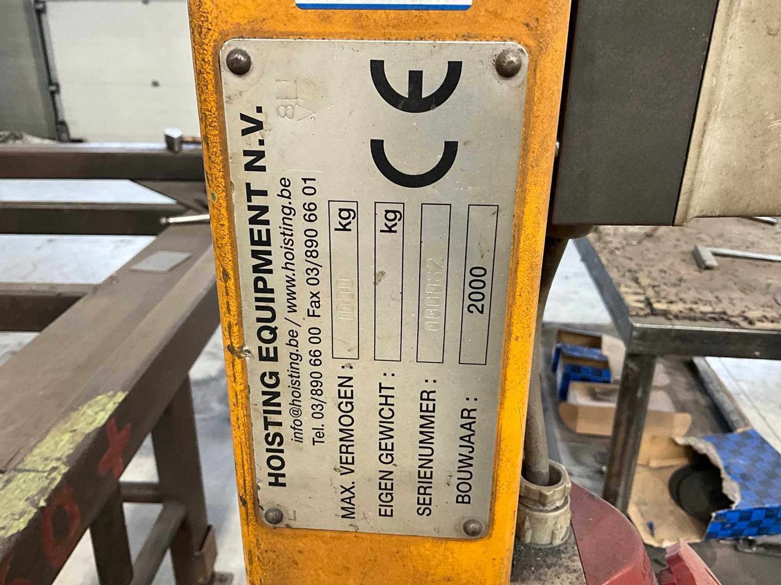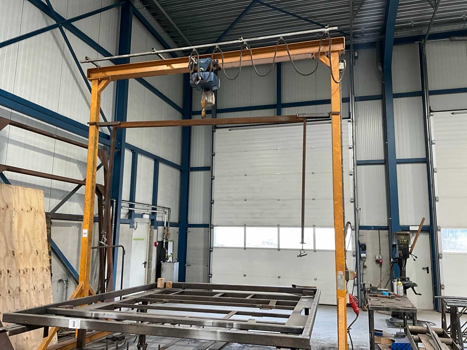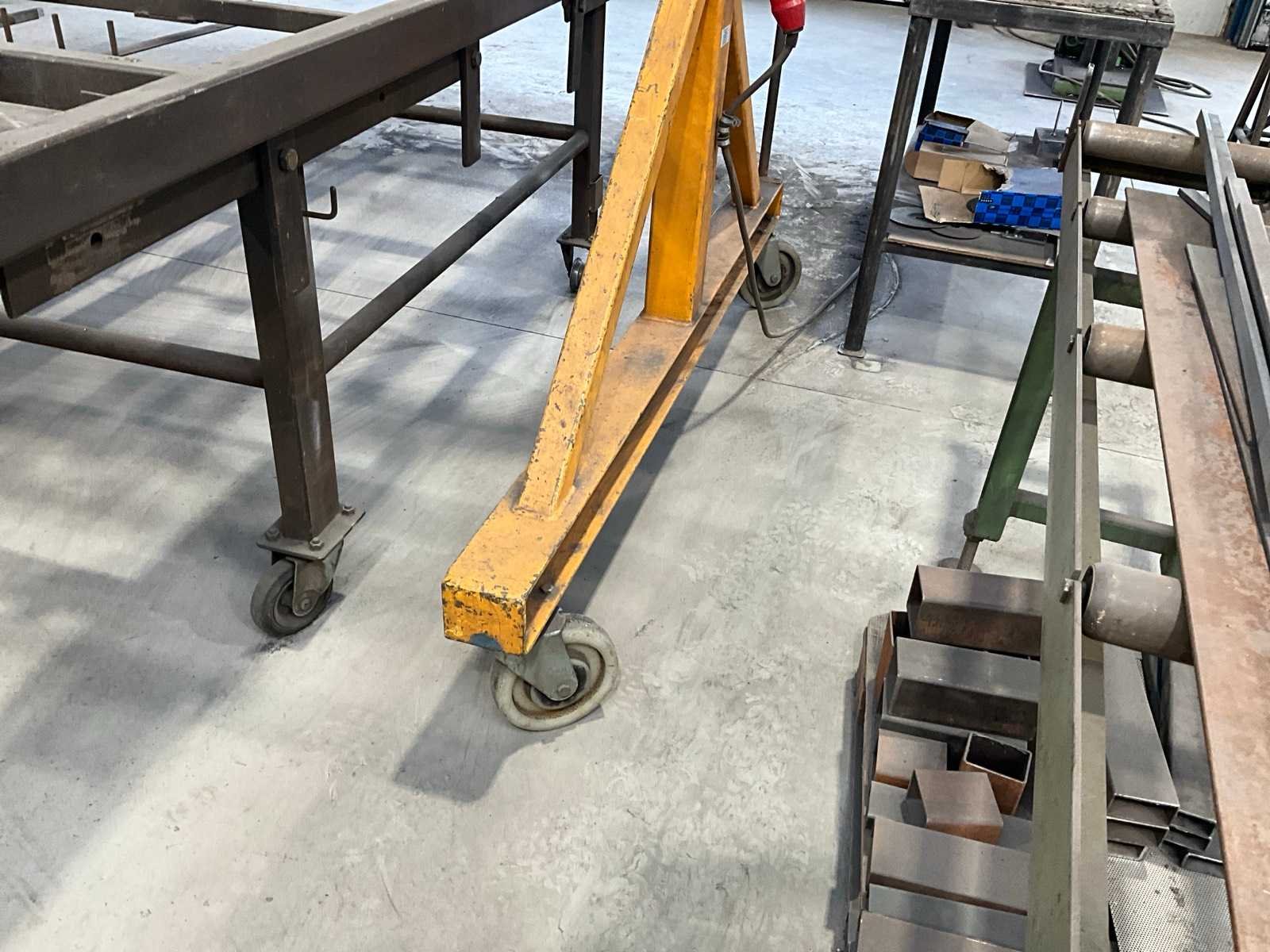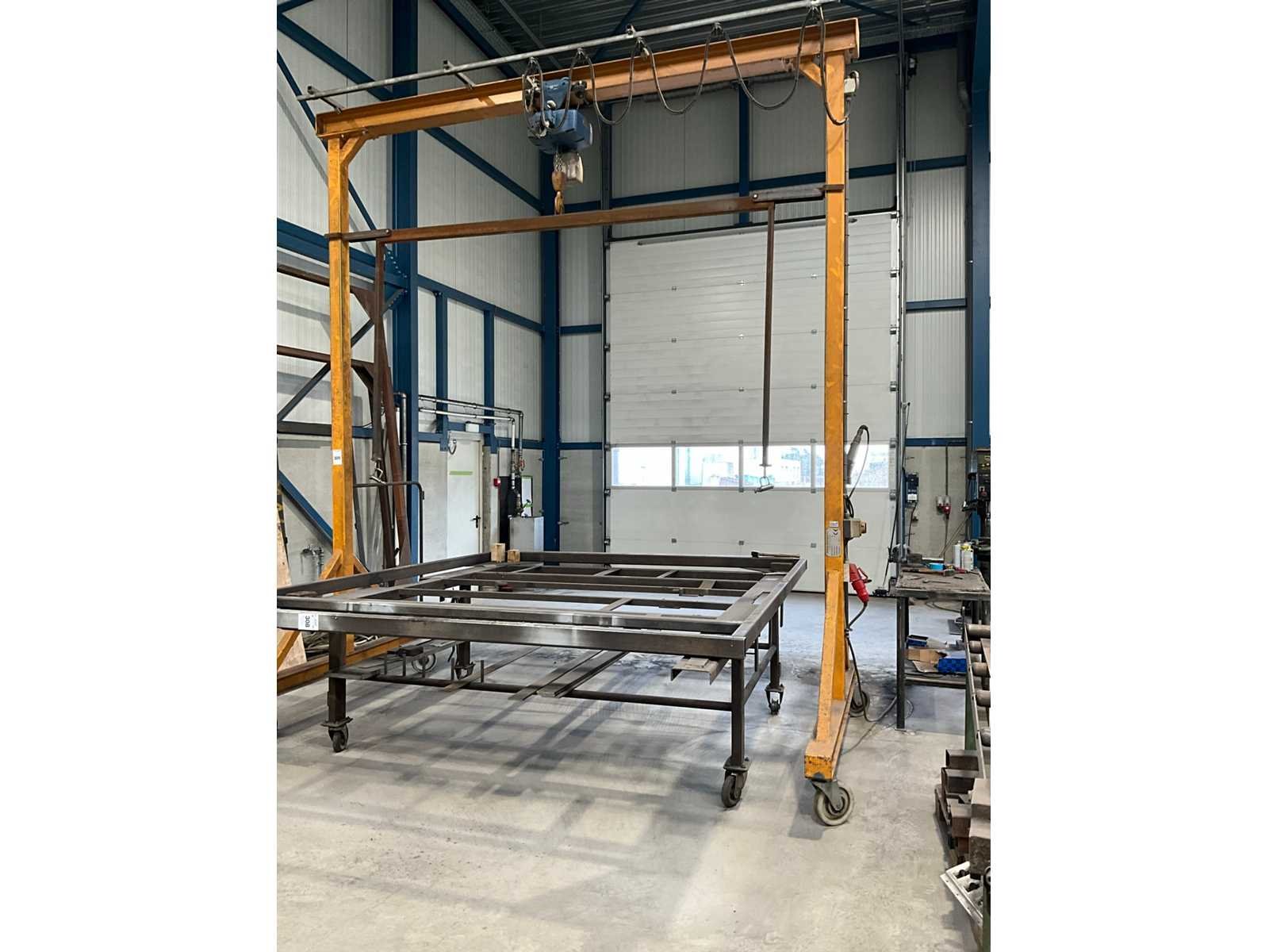 Voorzien van 4x loop zwenkwiel, demonteerbare constructie Nee Merk: Hoisring Equipment / Abus Bouwjaar: 2000 Serienummer: 000082 Capaciteit.: 1000kg Hijshoogte: 3m Aansluiting: 400V Totale afmeting L: 2000mm Totale afmeting Breedte: 3500mm Totale afmeting Hoogte: 4000mm