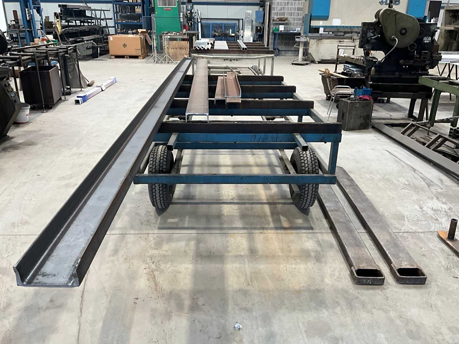 Voorzien van 2x zwenk en 2x loopwiel, +2x vorkverlengsels, 1x heftruck lepel lengte 1200 mm, 6x metalen schraag, karren met inhoud Nee Totale afmeting L: 3200mm Totale afmeting Breedte: 1500mm Totale afmeting Hoogte: 1000mm