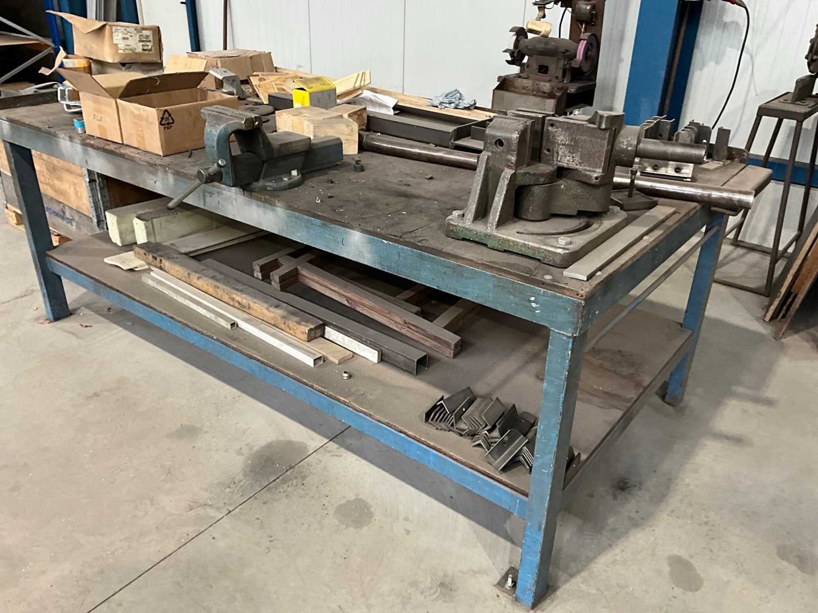 Bestaande uit 2x werktafel met inhoud, gemonteerde plooimodule, bankschroef, +plaatschaar, + dubbele slijpmolen Nee Totale afmeting L: 2460mm Totale afmeting Breedte: 1220mm Totale afmeting Hoogte: 900mm