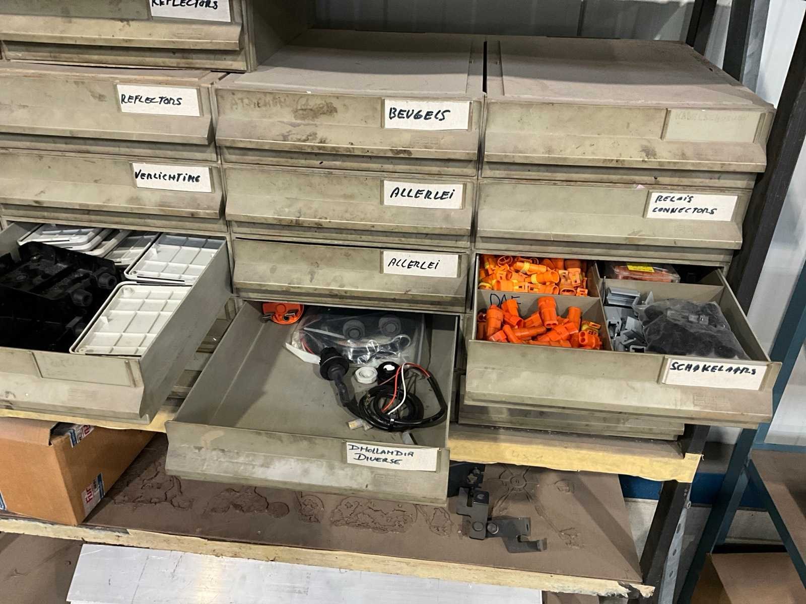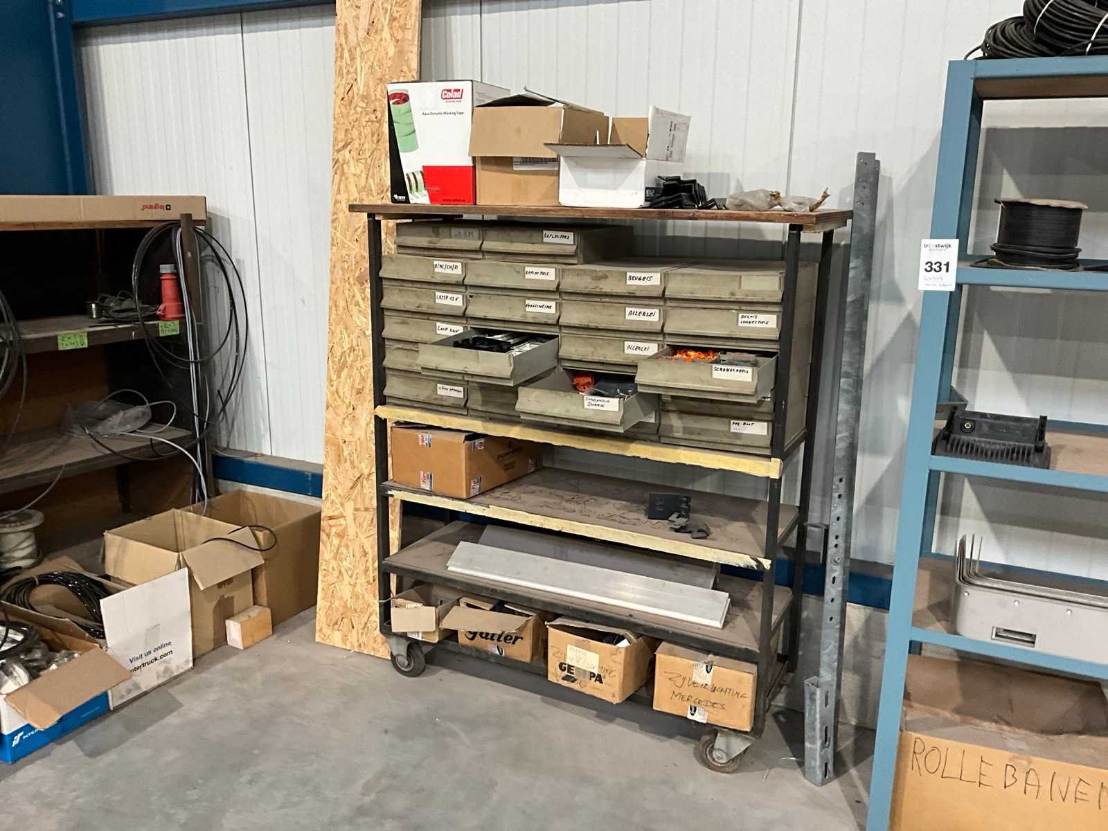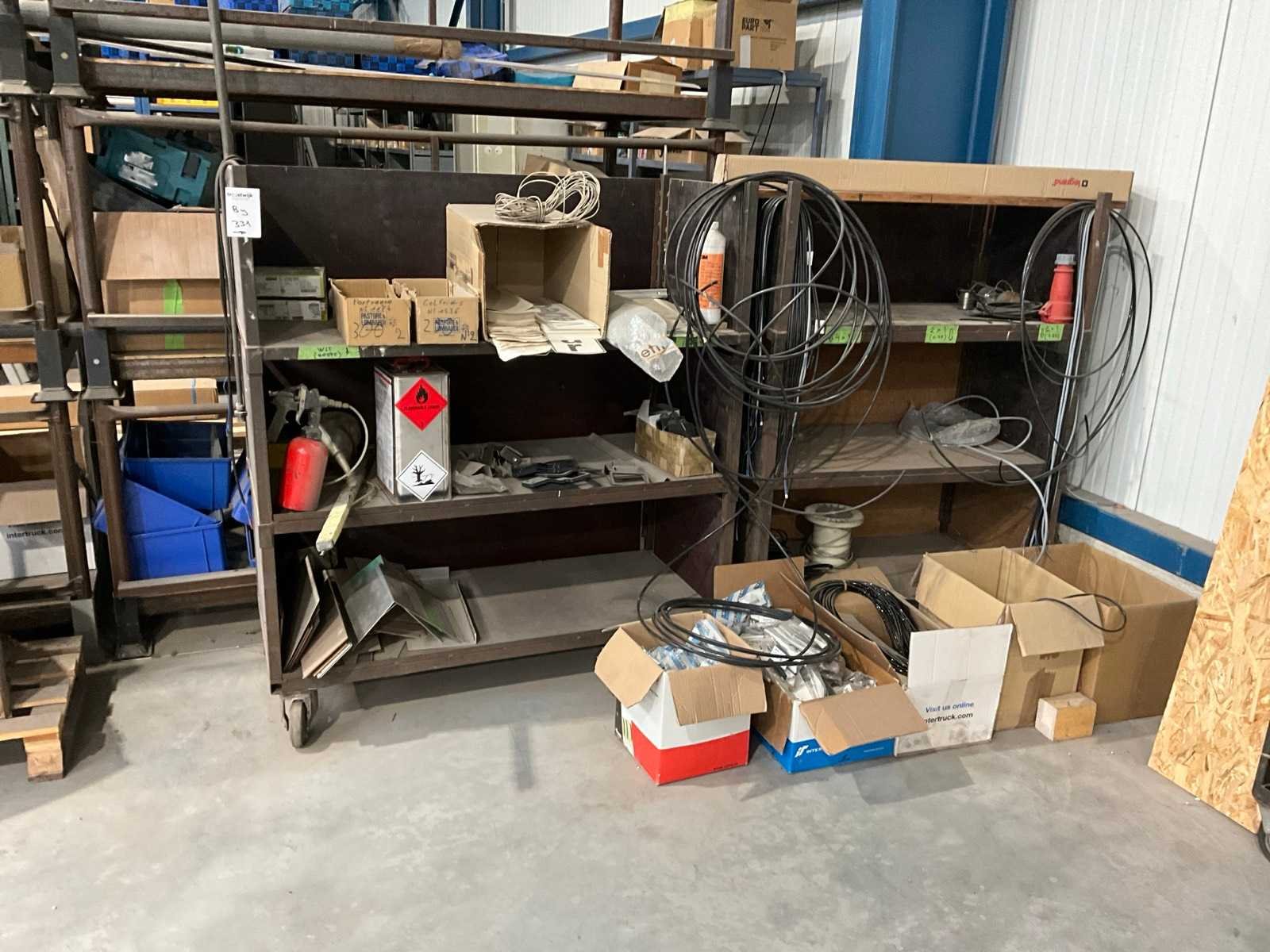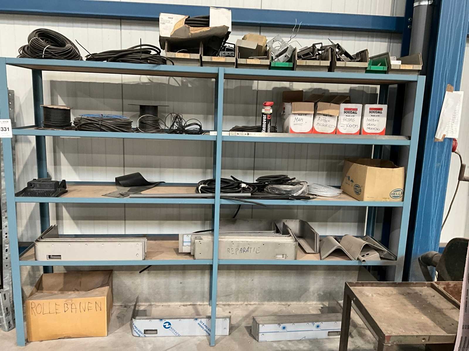 Bestaand uit geconstrueerd rek afmetingen 540x2500x1800 mm met diverse inhoud, +3x mobiel rek afmetingen 420x1250x1500 mm met inhoud bestaande uit luchtdruk slangen, stikkers, diverse electro componenten, enz.. Nee