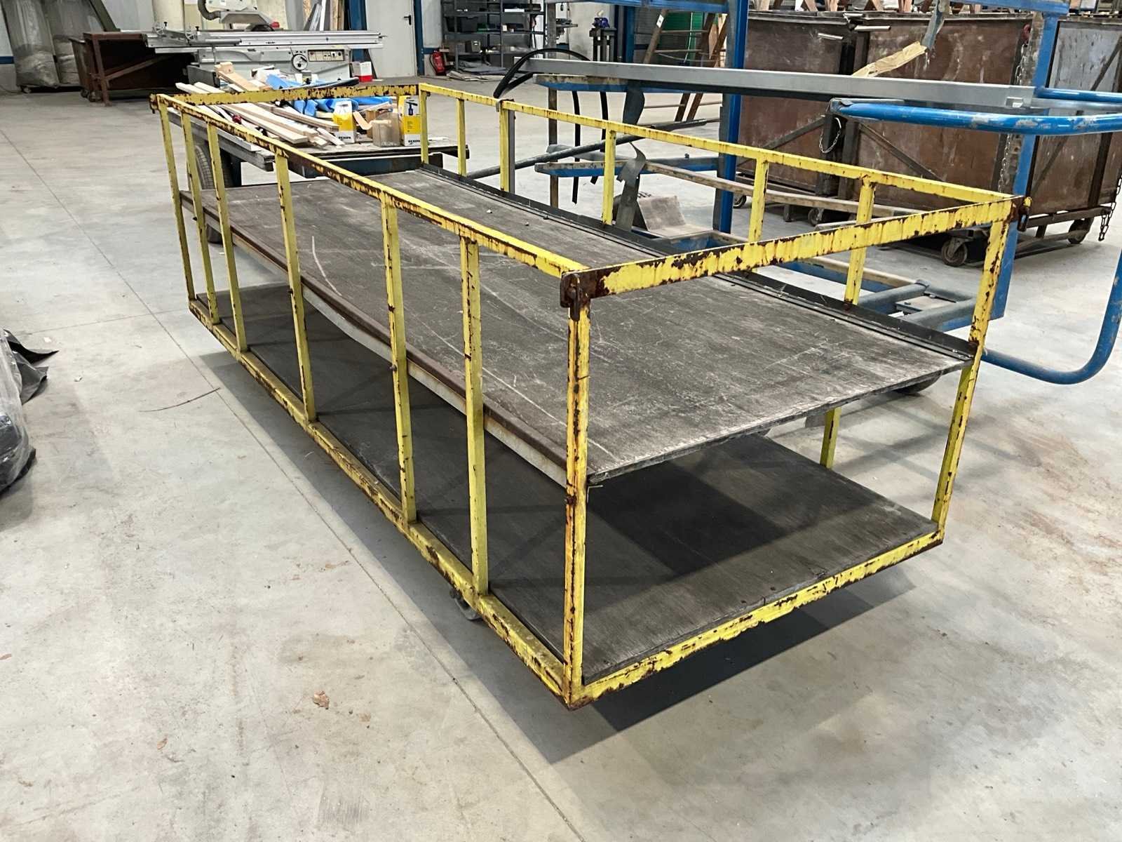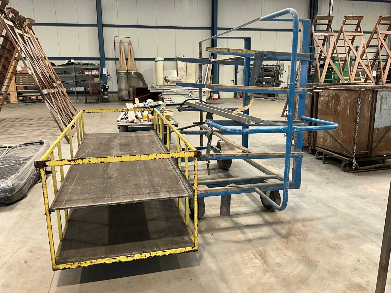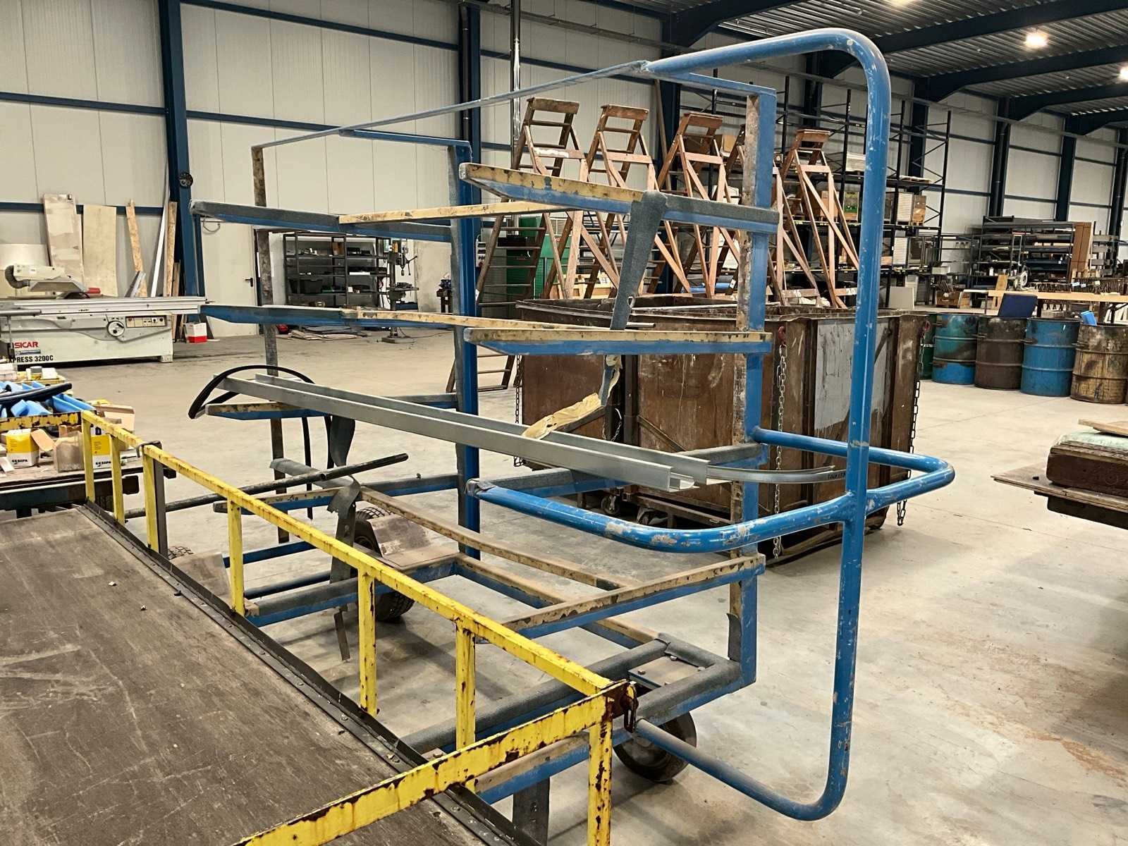 Bestaand uit 1x 3-wielwagen met inhoud afmetingen 2700x1100x1000 mm, +1x 4-wiels paneelwagen met 5 secties totaal afmetingen 1400x2900x2000 mm, +1x 2 sectie plateau wagen afmetingen 1100x2800x1200 mm Nee