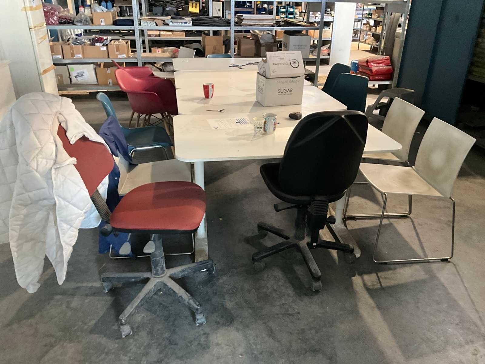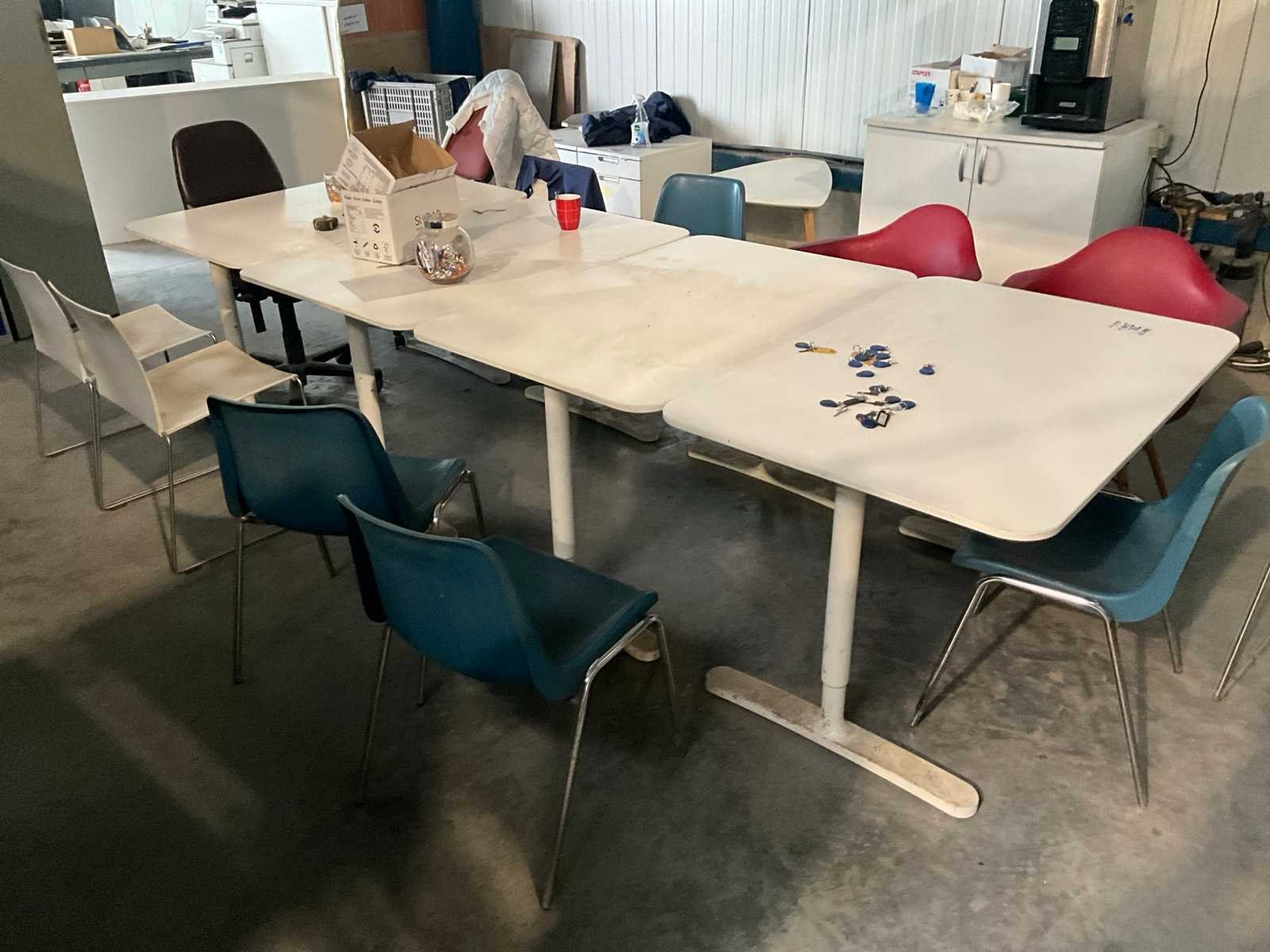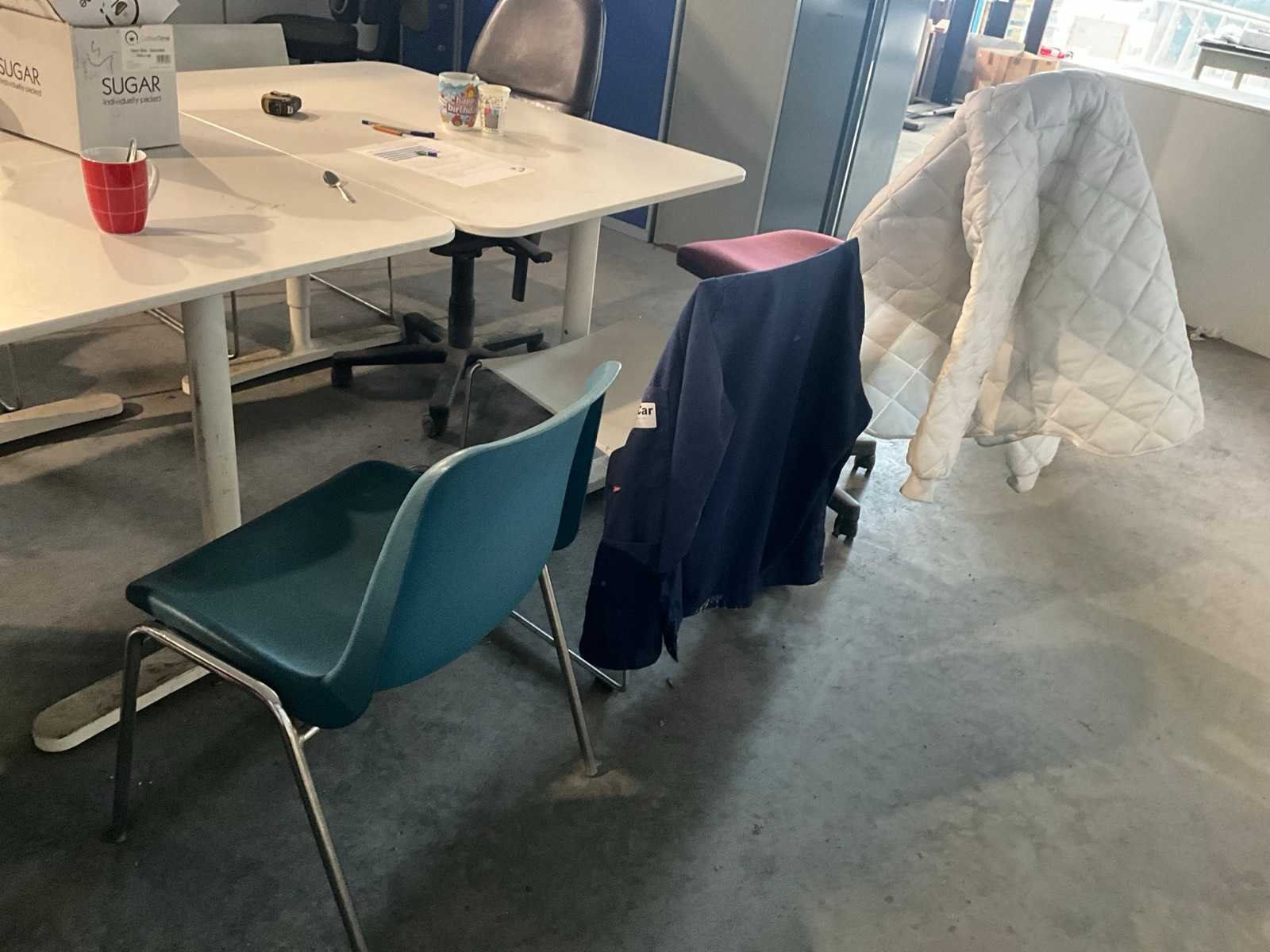 Bestaande uit: 4x bureautafel 120 x 80 x 75cm, 13 diverse bijzetstoelen, opbergkast voorzien van 2 deuren, 2x ladeblok en salontafel Nee