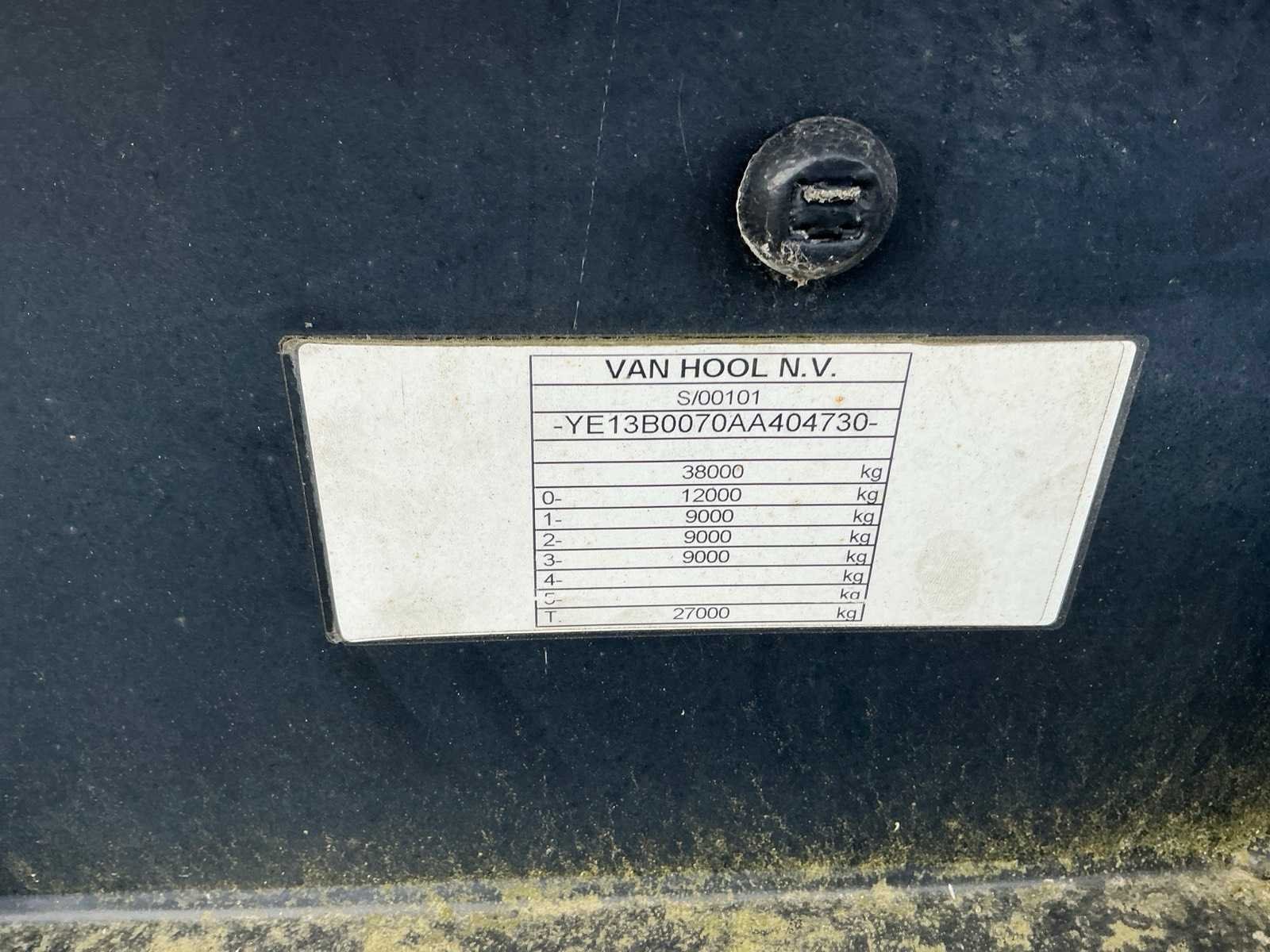 Zonder boorddocumenten! Zonder verdere gegevens Nee Merk: VanHool Type: S/00101 Type aanhangwagencarrosserie: Open Aanhangwagen Chassisnummer VIN: YE13B0070AA404730 Aantal assen: 3 Laadvermogen: 38000kg