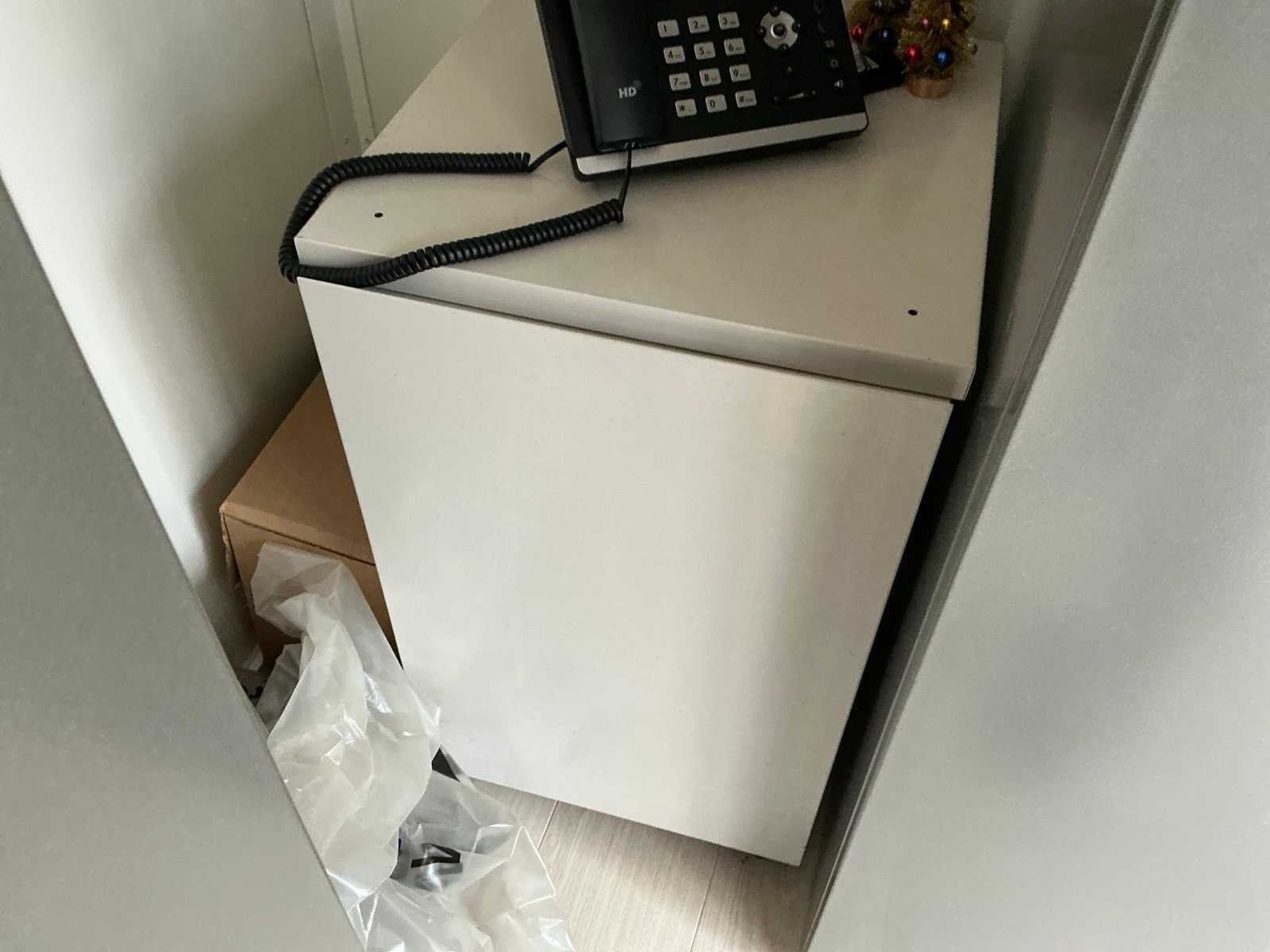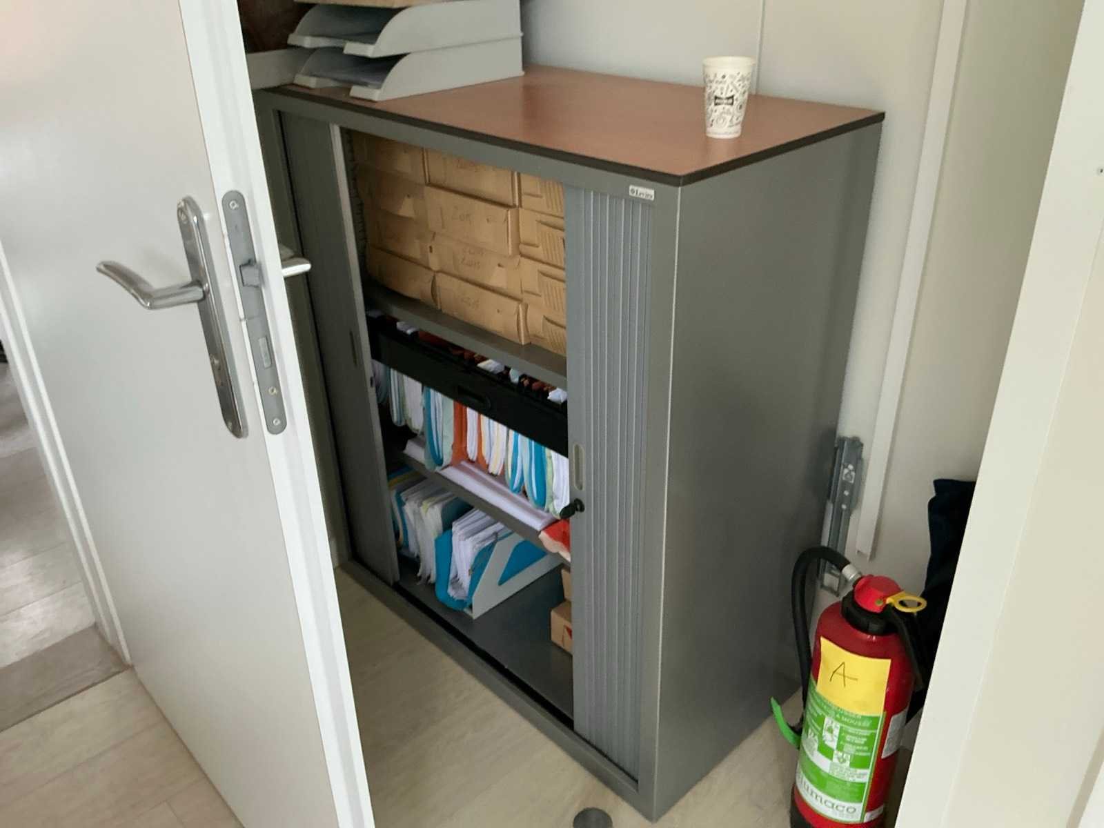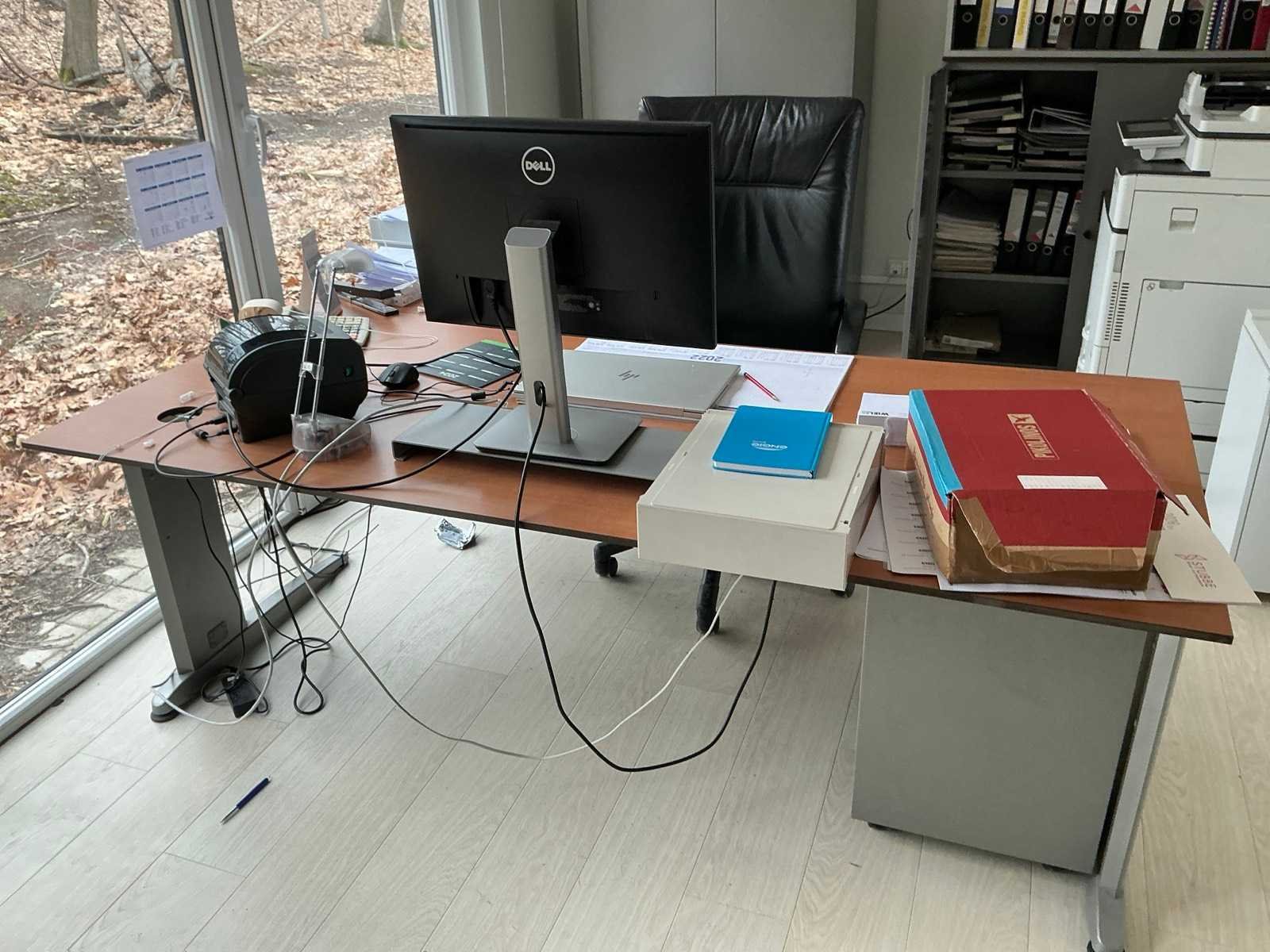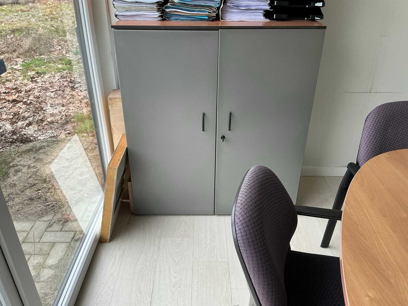 Bestaande uit: ronde tafel met 6 stoelen 200x120 cm. 3x lage dossierkast circa 114x100 cm. 2x lage dossierkast circa 150x100 cm. Hoekbureau 200x205 cm. met stoel. Computerscherm Dell. Papierversnipperaar IDEAL 2465CC. Dossierkast met 8 deuren 225x200 cm in 4 delen. Nee