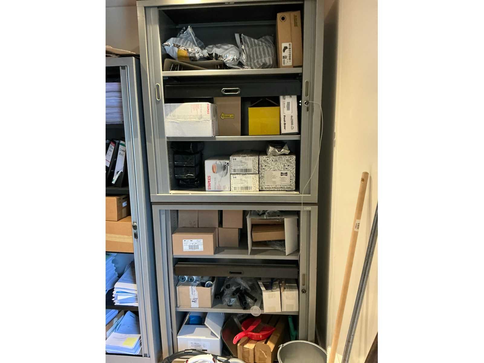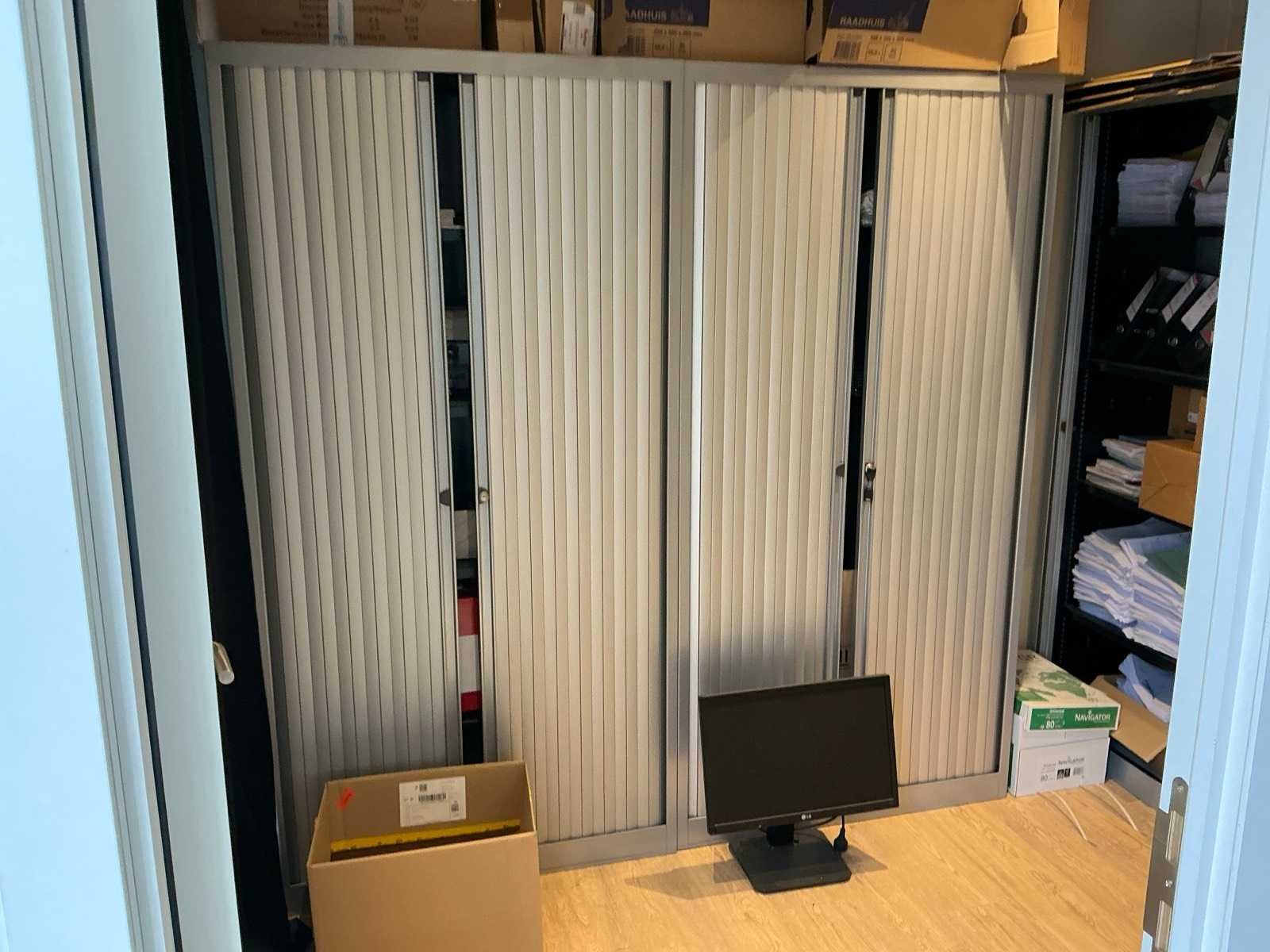 Inhoud bestaande uit: 3x hoge dossierkast 198x100 cm. 2x lage dossierkast 114x100 cm. Stofzuiger, waterkoker, Nespresso Machine, 5x dossierkast 126x80 cm. 3x dossierkast 72x80 cm. Hoekbureau. 2x computerscherm Ilyama. Bureaustoel. 2x wachtstoel, computerscherm LG…. Nee