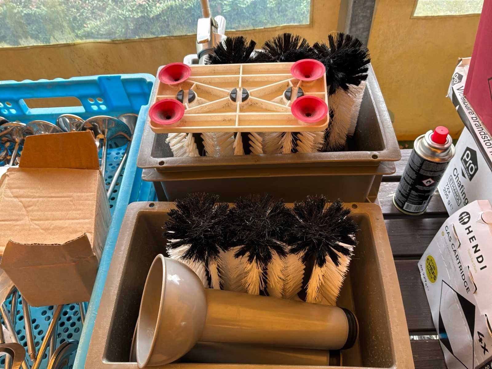 Waaronder circa 40x tafelafvalemmer, 3x 3-delige spoelborstel Nee
