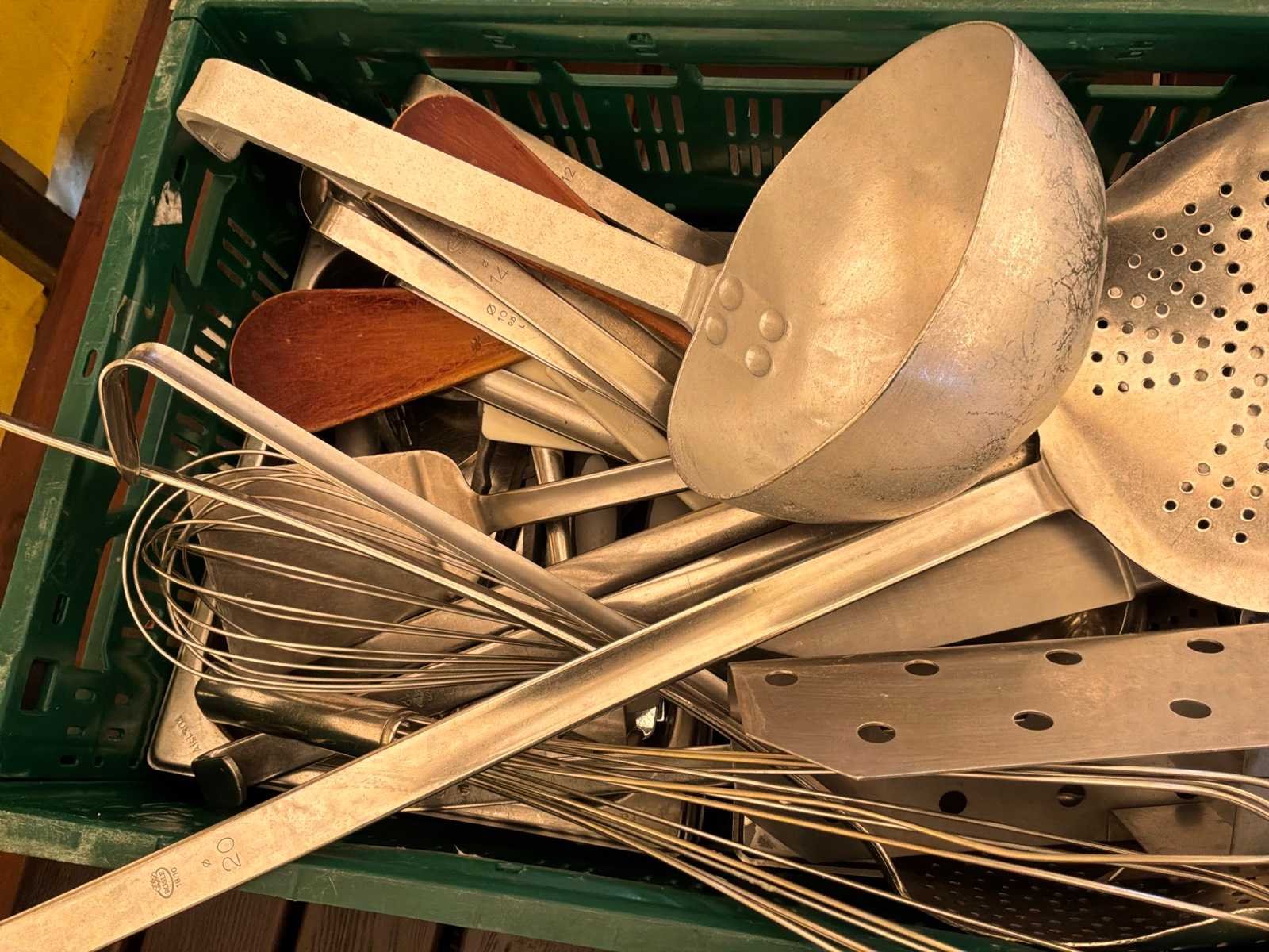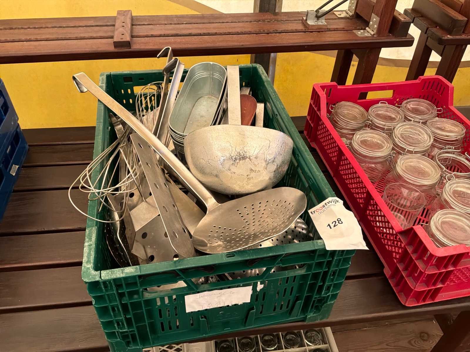 1x kist met keukengerei waaronder diverse pollepels, diverse gardes, diverse schuimspanen,… Nee