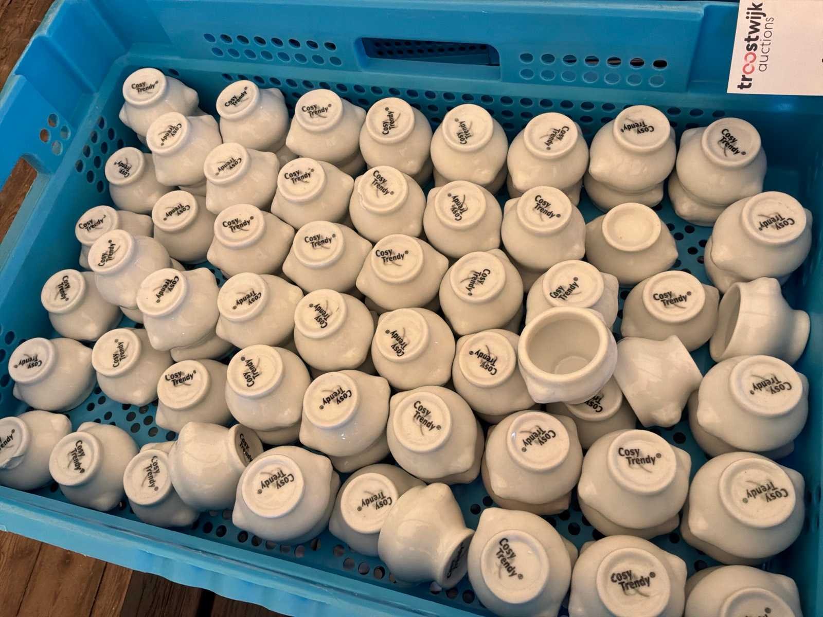 3x kist met circa 100 porseleinen potjes (diameter x hoogte circa 4 x 4,5 cm) Nee