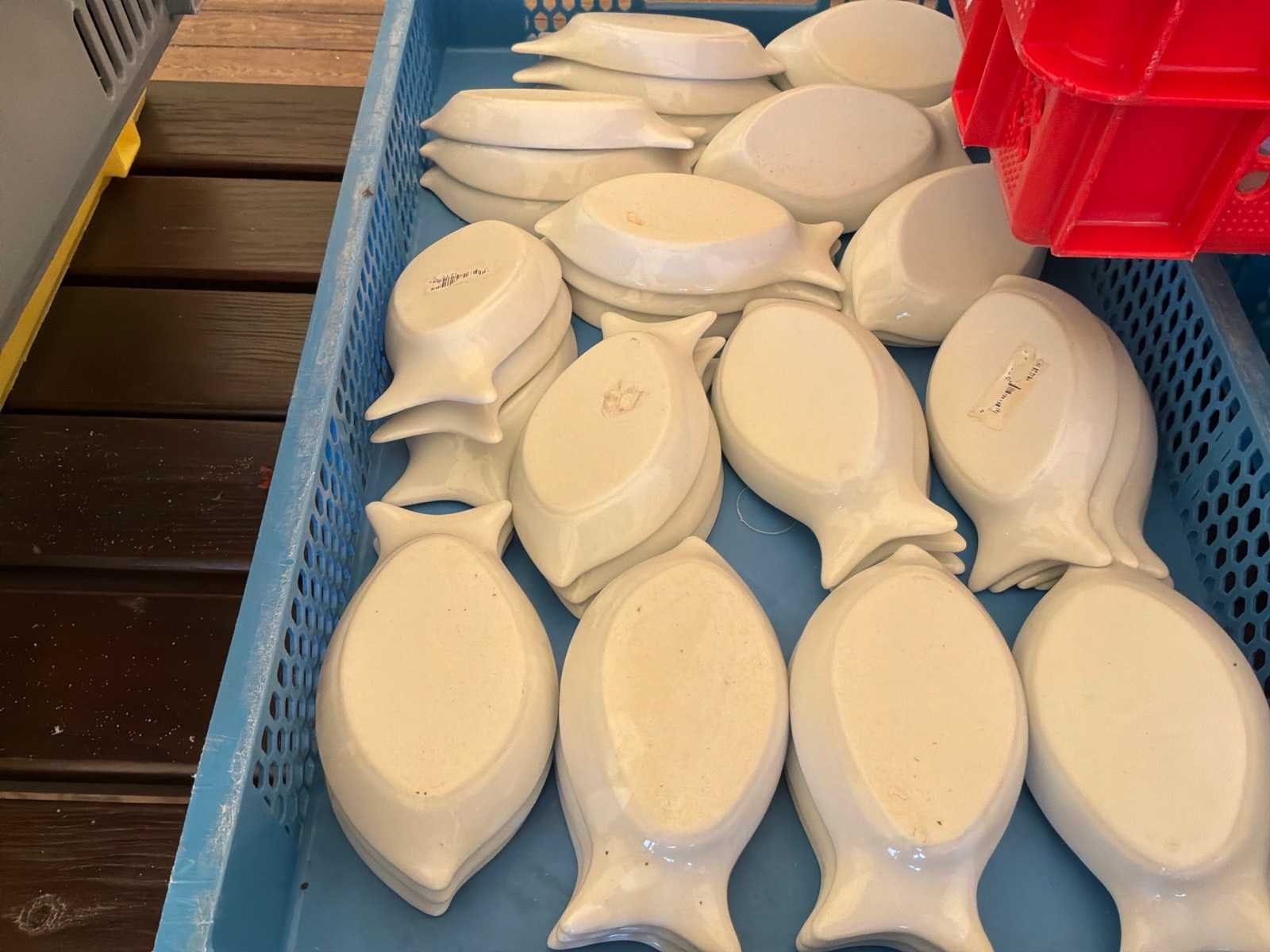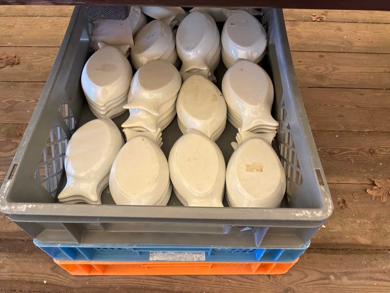 6x kist met diverse porseleinen potjes en schoteltjes Nee