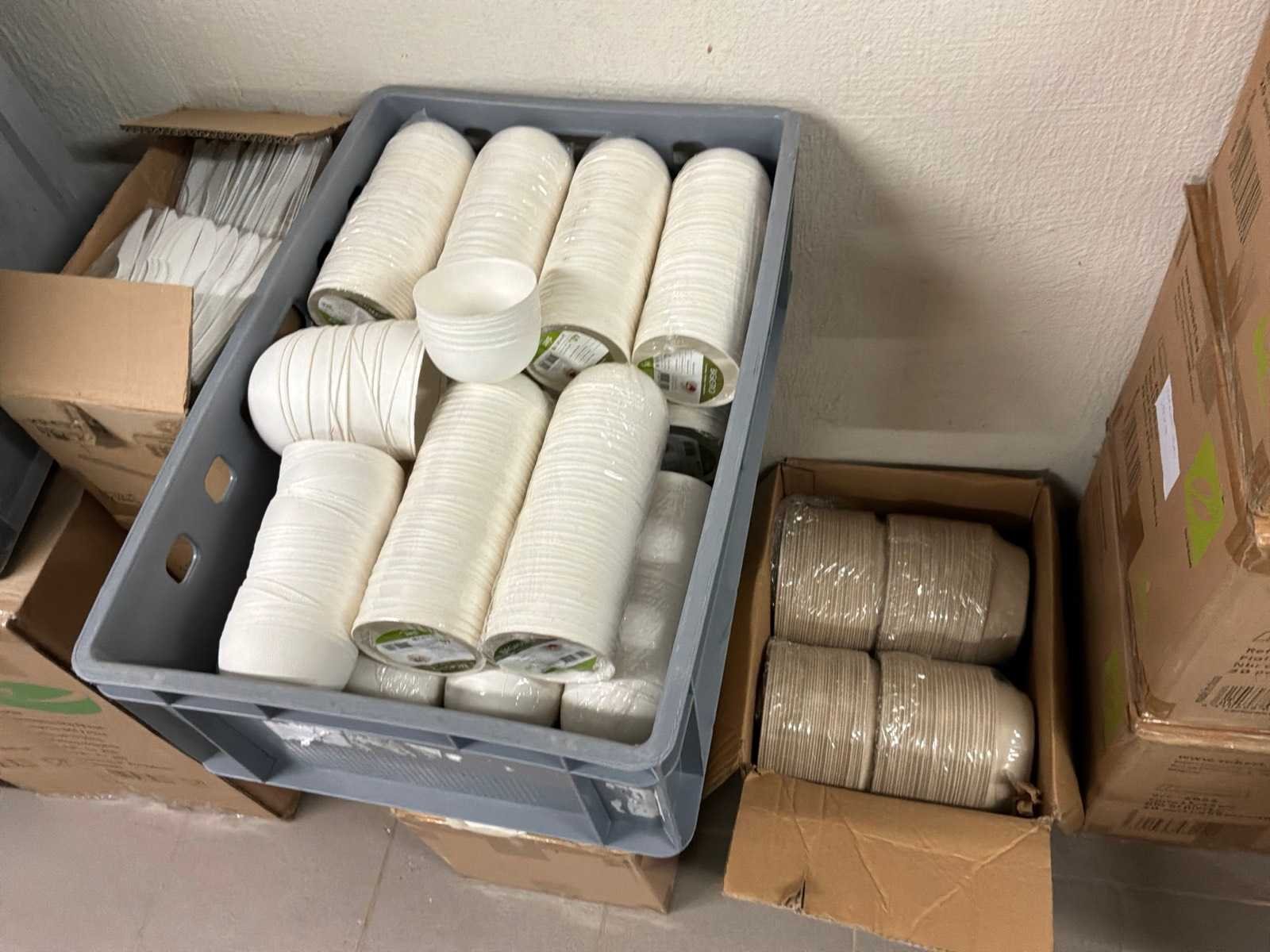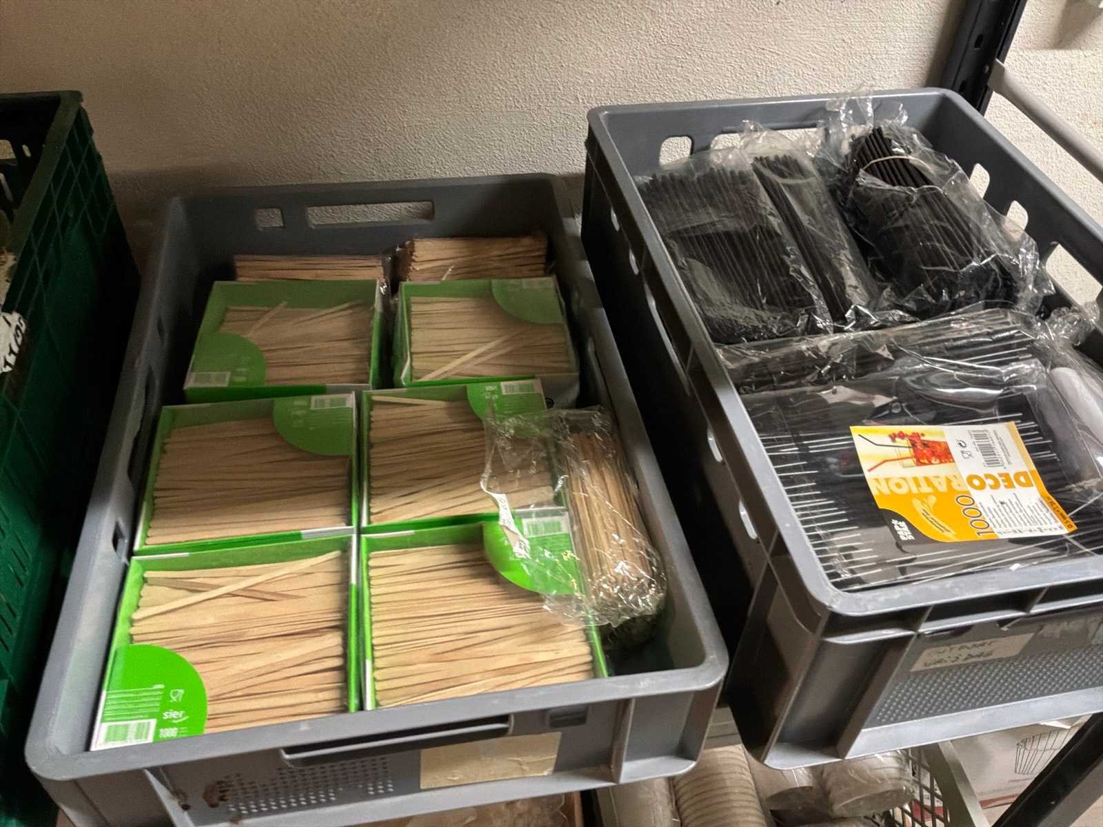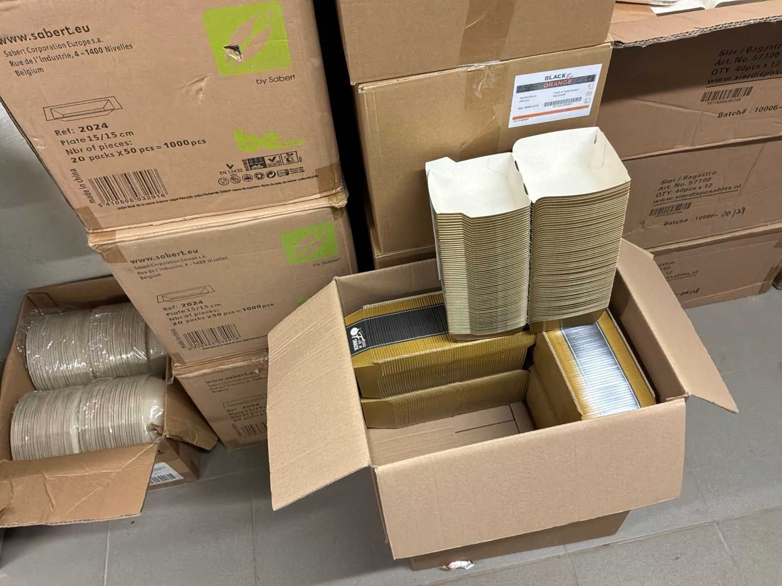 Waaronder pastacups, bestek, hamburgerbroodjes, koffiefilters, roerstokjes, theelichtjes, verpakkingsmateriaal, kommetjes, bordjes Nee