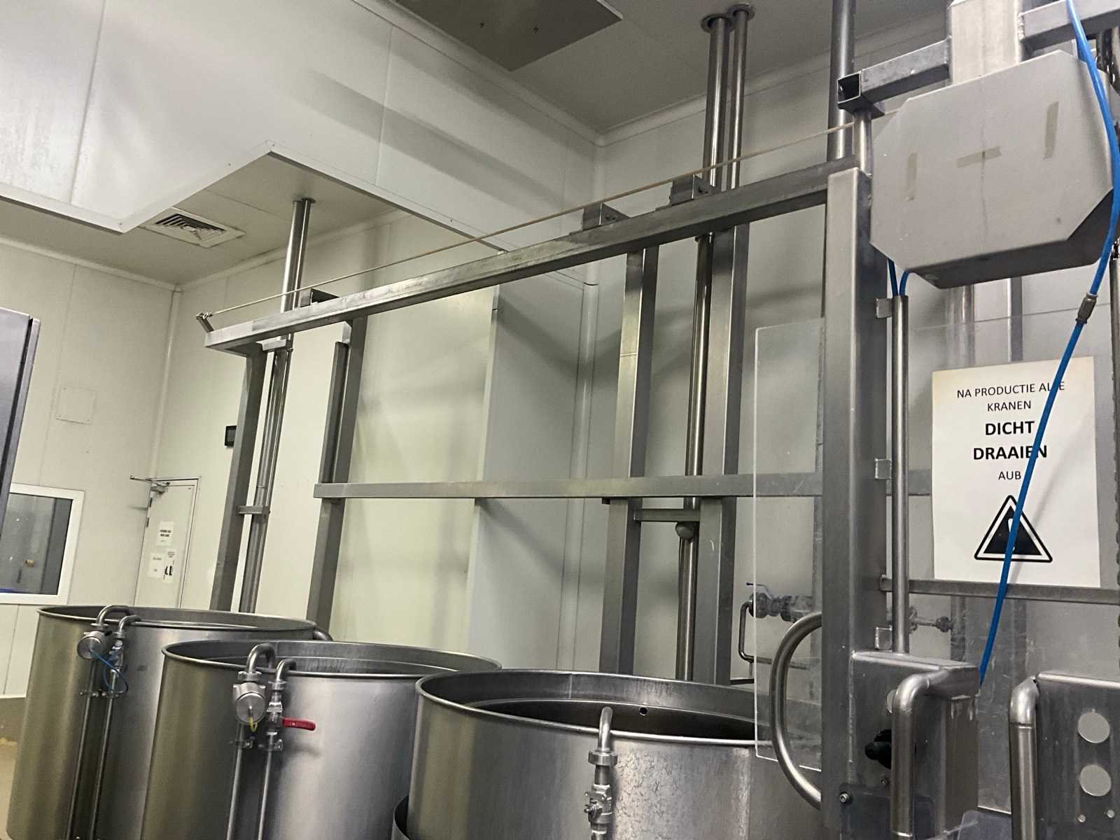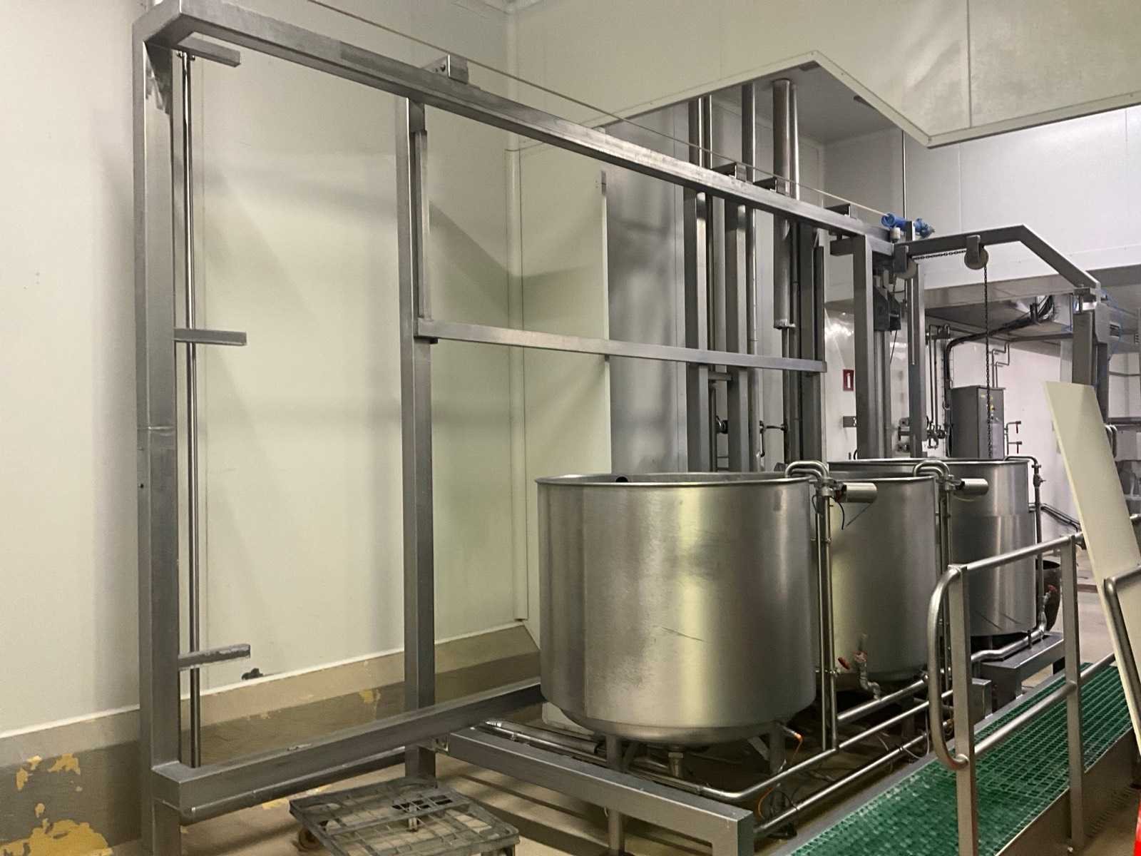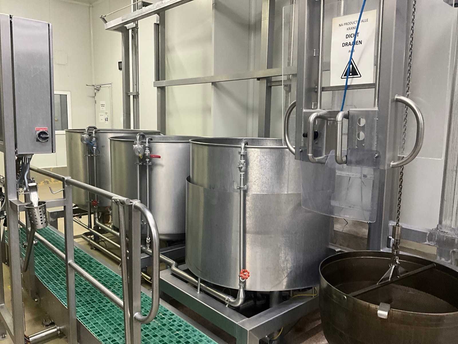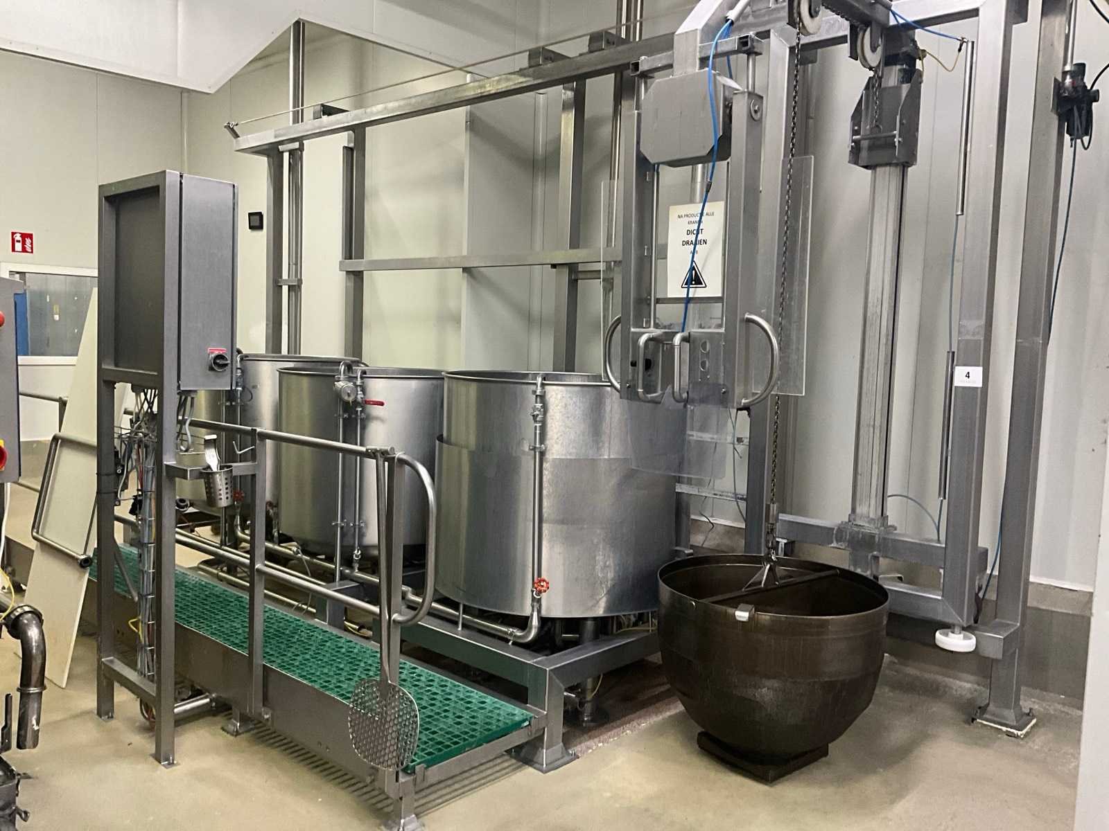 Bestaande uit 3 kookketels Alfa Laval (met afmeting 115 cm diameter en 105 cl hoog), en hefsysteem D.C. Norris & Co met uitneembaar vergiet op rolketting, met max. cap. 200 kg SWL, compleet met loopplatform en sturingskast met touch paneel Siemens Simatic. Nee Bouwjaar: 1997 Aansluiting: 400V Totale afmeting L: 6200mm Totale afmeting Breedte: 2700mm Totale afmeting Hoogte: 3250mm