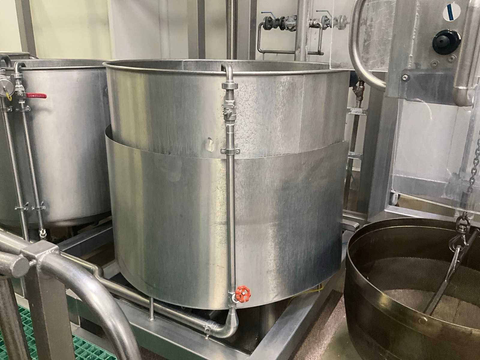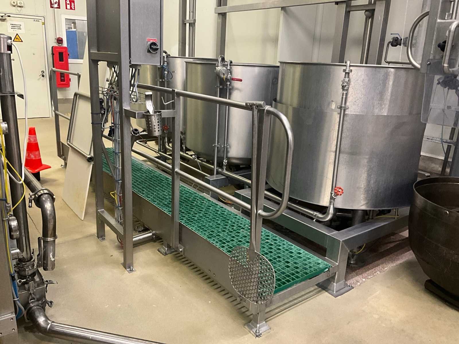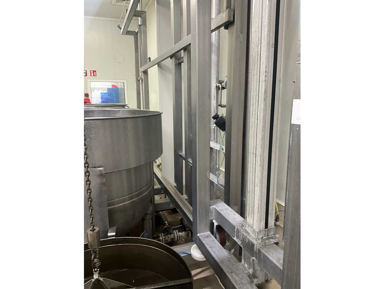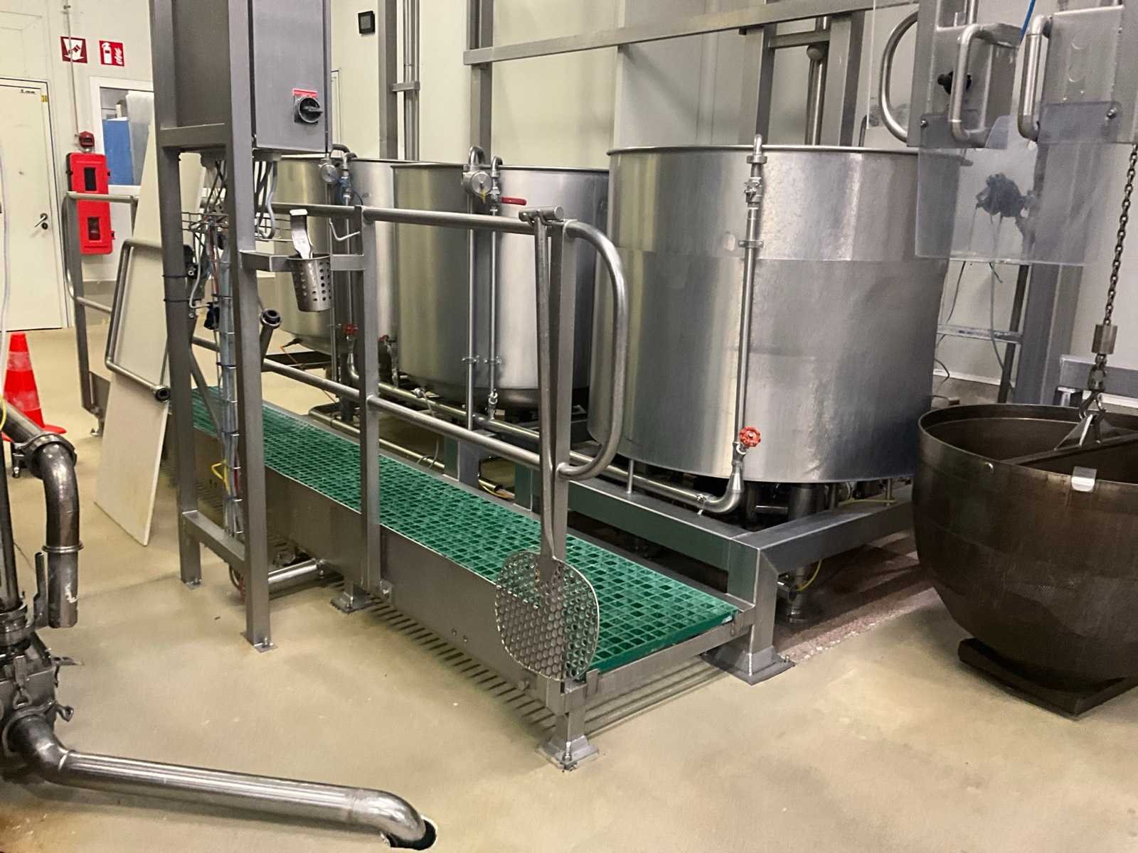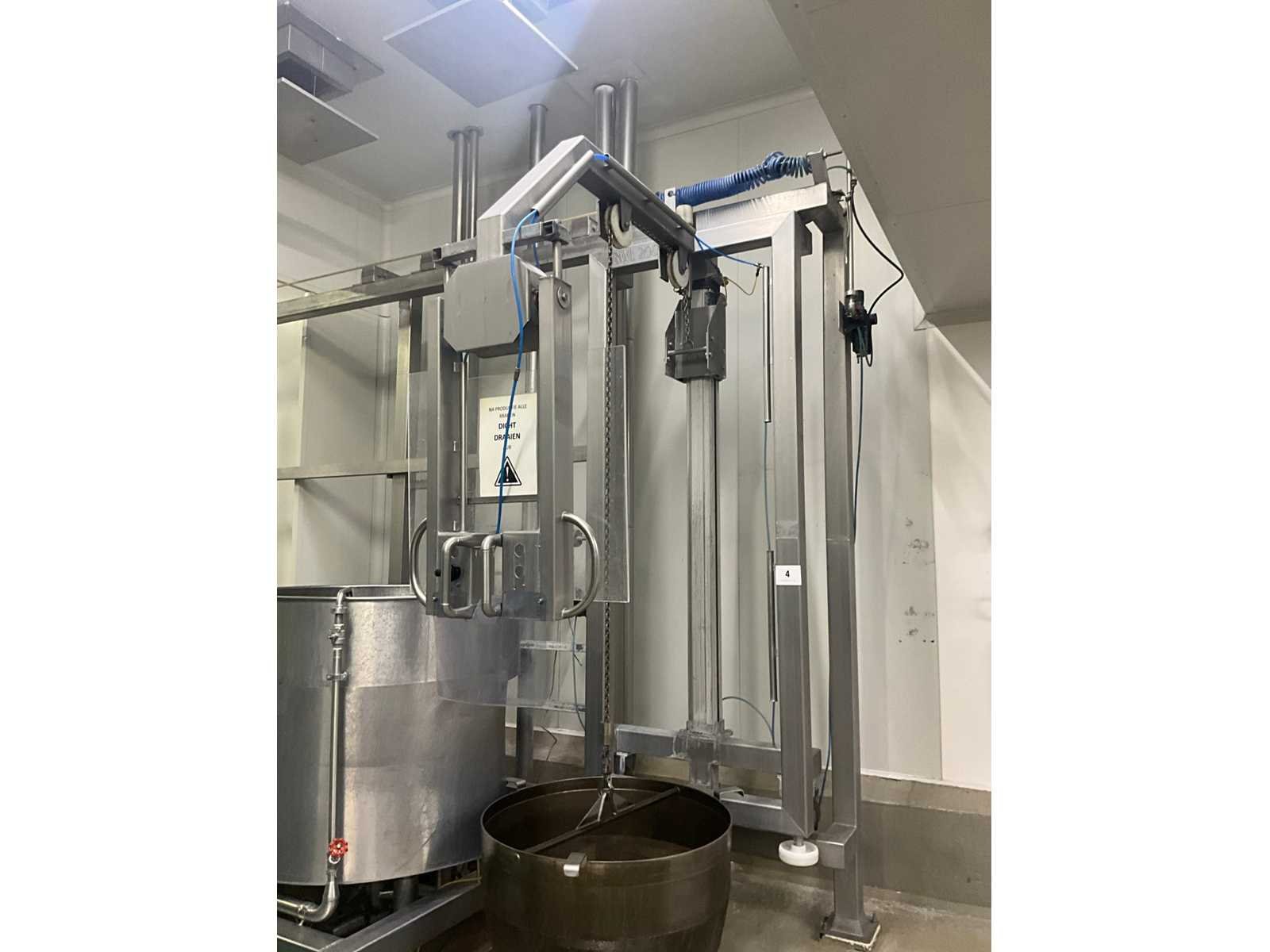 Bestaande uit 3 kookketels Alfa Laval (met afmeting 115 cm diameter en 105 cl hoog), en hefsysteem D.C. Norris & Co met uitneembaar vergiet op rolketting, met max. cap. 200 kg SWL, compleet met loopplatform en sturingskast met touch paneel Siemens Simatic. Nee Bouwjaar: 1997 Aansluiting: 400V Totale afmeting L: 6200mm Totale afmeting Breedte: 2700mm Totale afmeting Hoogte: 3250mm